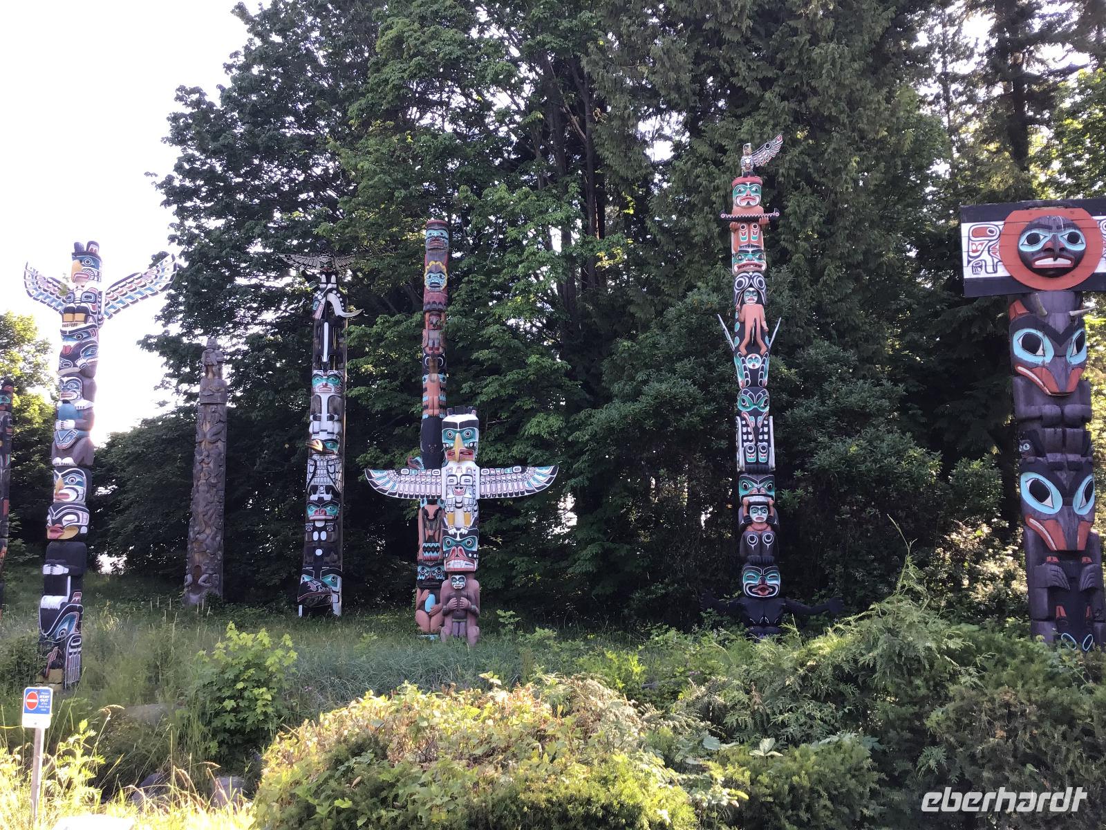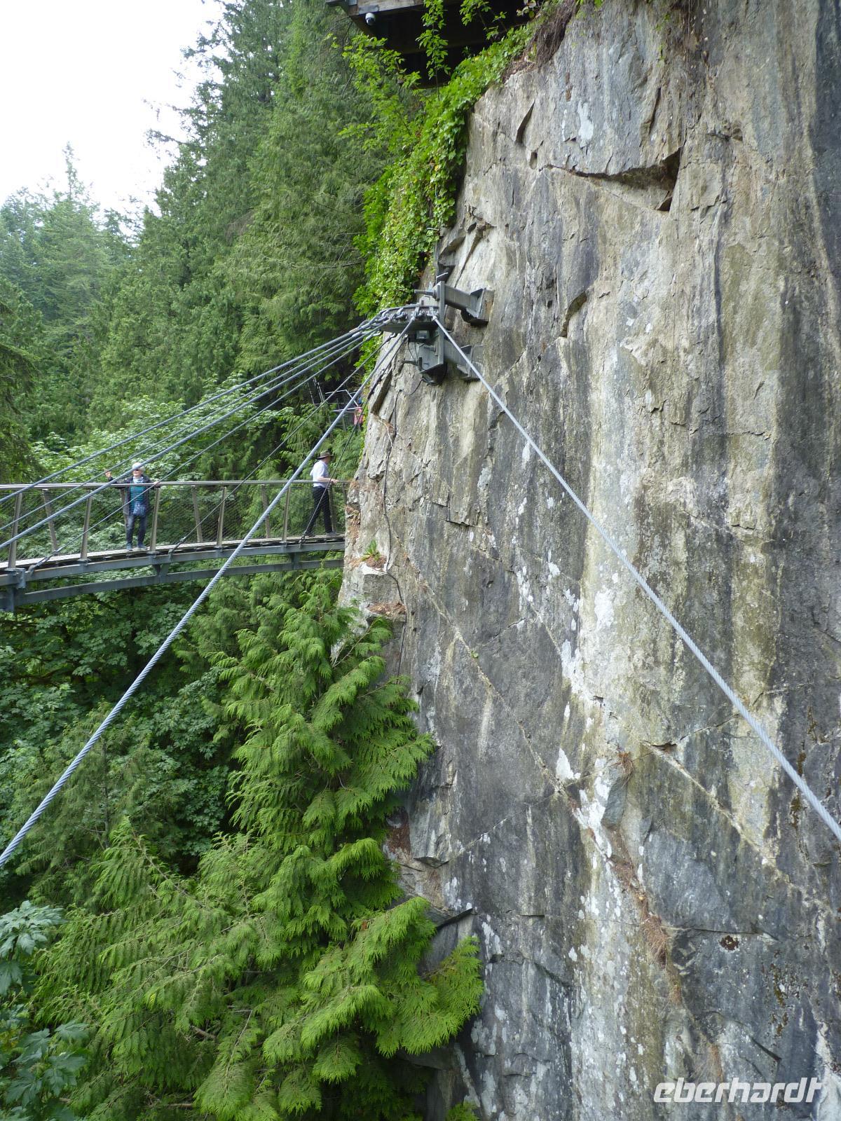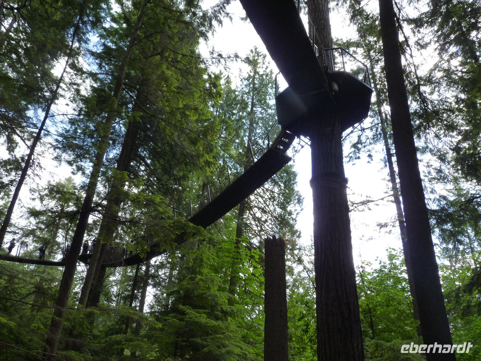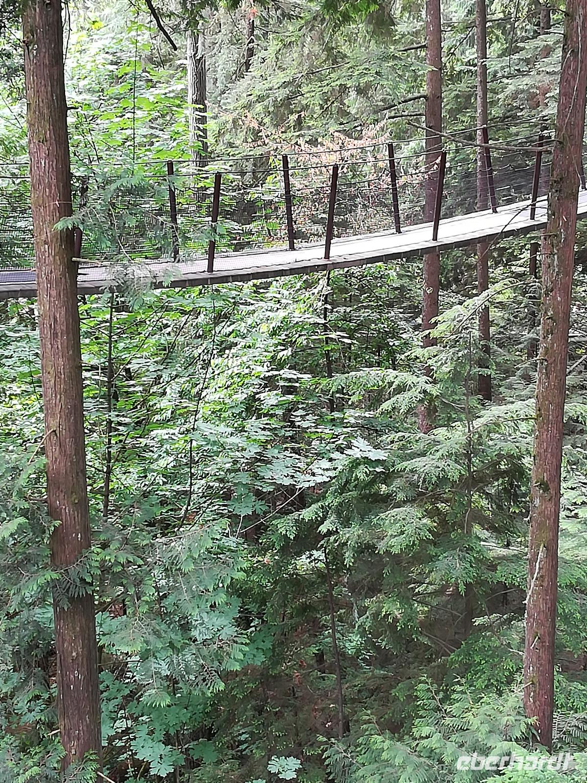 Zuerst fuhr uns Renzo erst einmal in den größten kanadischen Stadtpark, dem Stanley Park, mit seinen vielen Totem Poles und einen schönen Blick auf das Zentrum von Vancouver. Dann ging der eigentliche Ausflug mit dem Besuch des Capilano Suspension Park los. Hier wurde ein künstlicher Baumwipfelpad angelegt, von dem man sich auf spektakuläre Weise den Wald von oben anschauen kann. Der eigentliche Höhepunkt war die Capilano Suspension Bridge, eine 136 Meter lange frei schwingende Seilbrücke in 70 Meter Höhe. Für manche Touristen gehörte schon etwas Mut dazu, die doch teilweise recht stark wackelnde Brücke zu überqueren. Das eine oder andere bleiche Gesicht konnte man schon sehen.