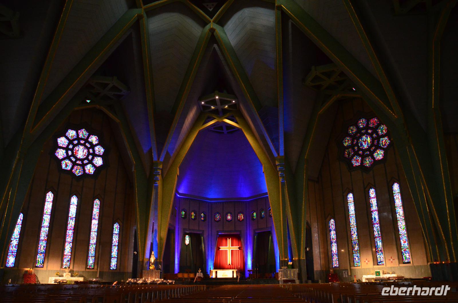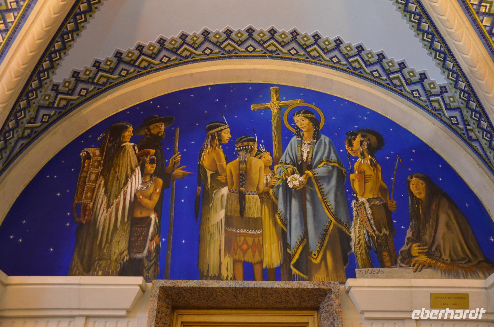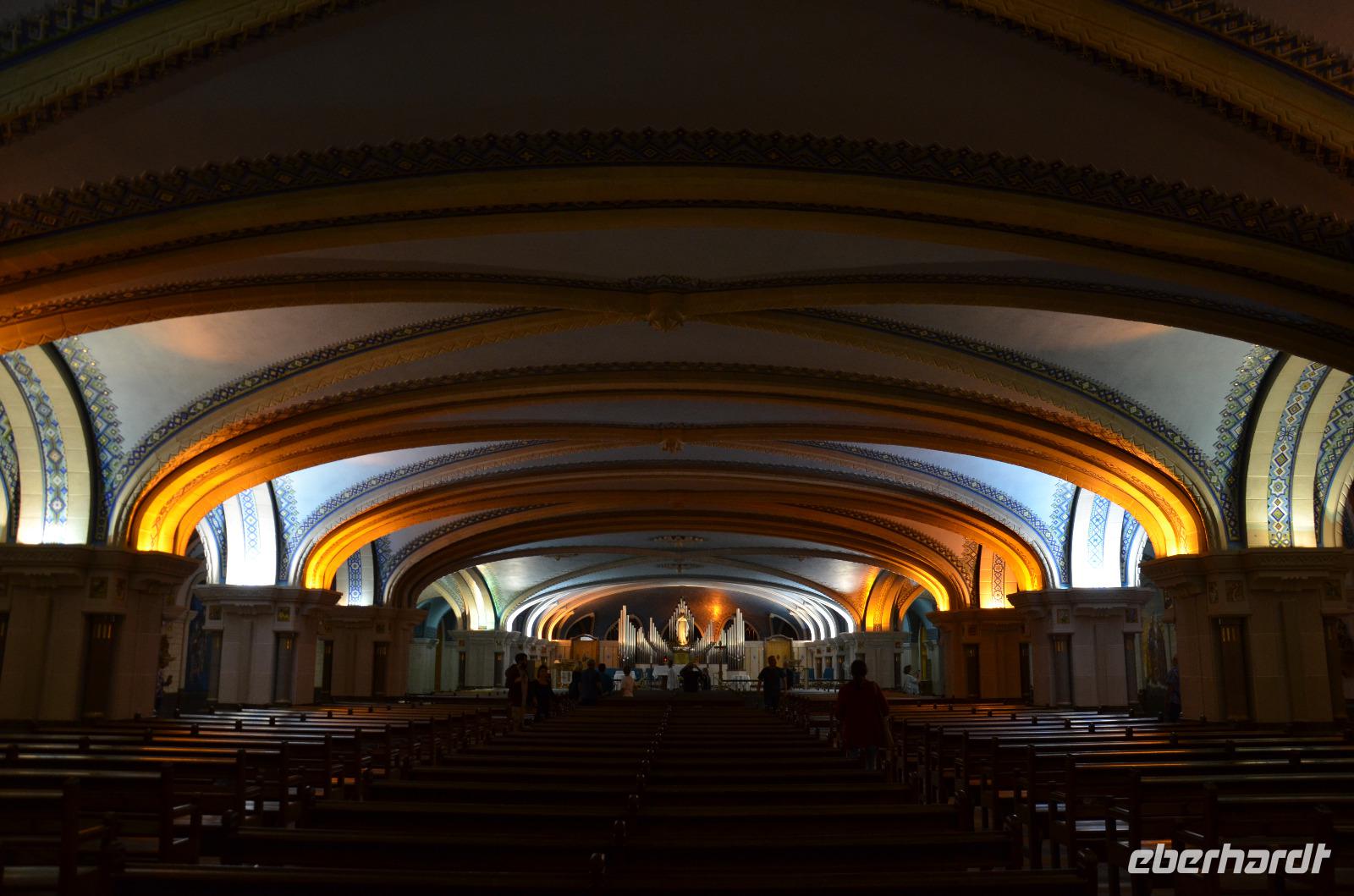 Auf dem Weg nach Québec folgt aber noch ein weiteres Highlight. Wir kommen in den Genuss eine weitere atemberaubende Schönheit zu besichtigen - die „Notre-Dame-du-Cap" in Trois-Riviéres. So anders und doch so bezaubernd. Das Bauwerk trägt den vom Papst verliehenen Ehrentitel „Basilica minor", also kleinere Basilika, ist das Nationalheiligtum im Bistum Trois Rivières und der Jungfrau Maria geweiht. Diese Lobeshymnen spiegeln sich in der imposanten architektonischen Umsetzung des achteckigen Gebäudes wieder, welches sowohl von außen als auch von innen beeindruckt. Auch regelrecht zauberhaft sind die umliegenden, angelegten Gärten mit ihren zahlreichen Skulpturen. Gerade jetzt zum späten Nachmittag glitzert die Sonne durch das satte Grün der Bäume bis hin zum taubesetzen Gras und spiegelt sich auf den kleinen Wasserkanälen wieder. In der Ferne sieht man große Frachter auf dem Sankt-Lorenz-Strom dahin gleiten - eine friedvolle Idylle, die wir in vollen Zügen genießen.