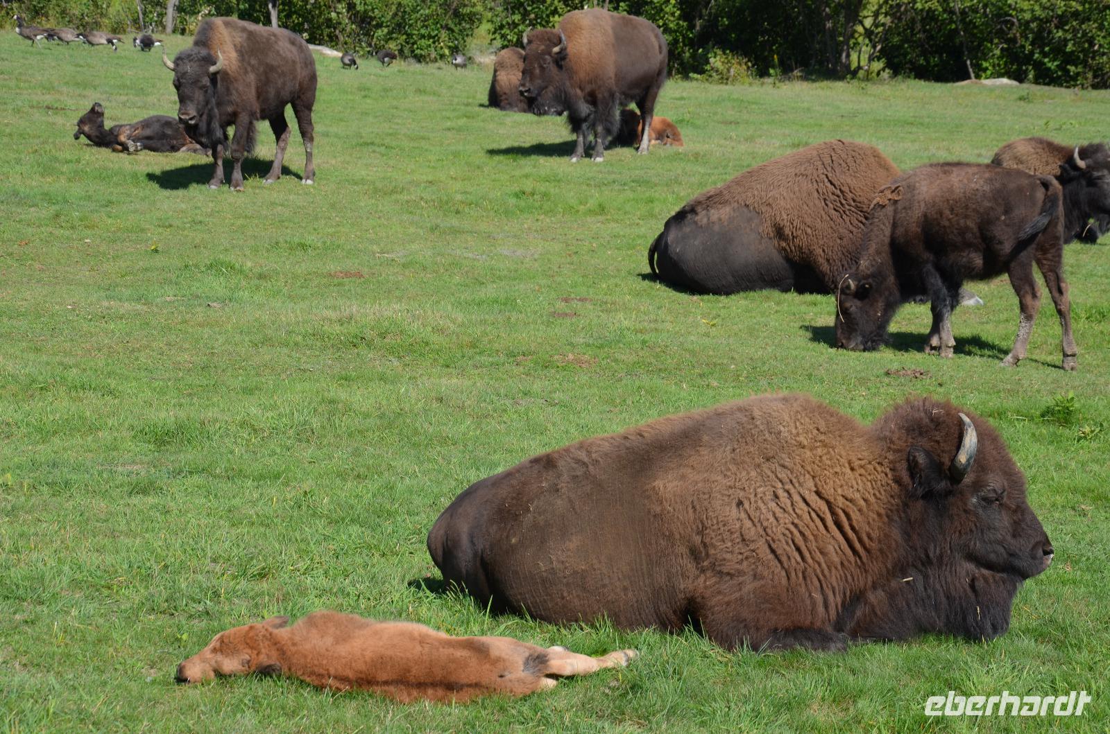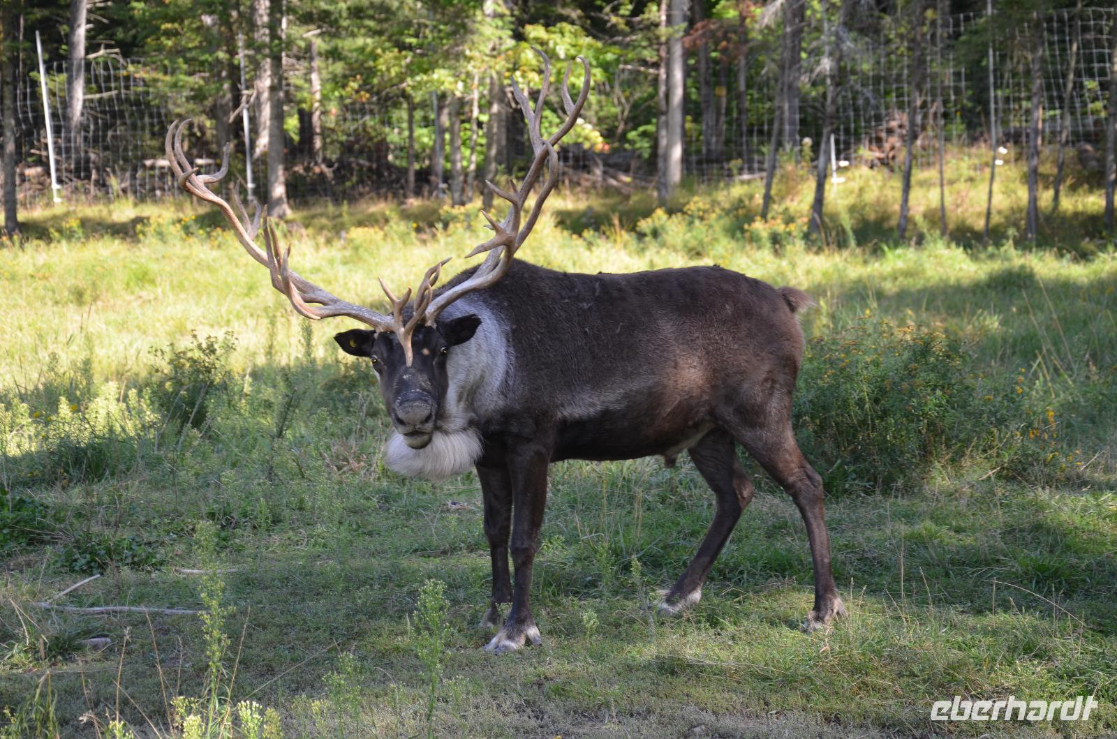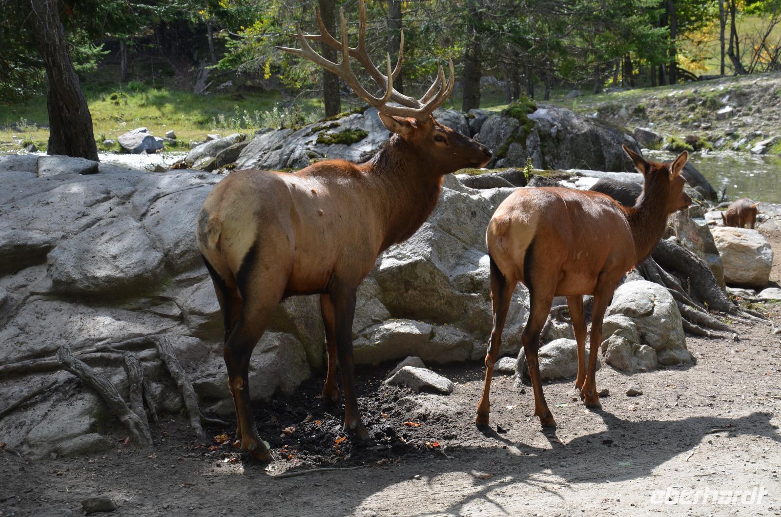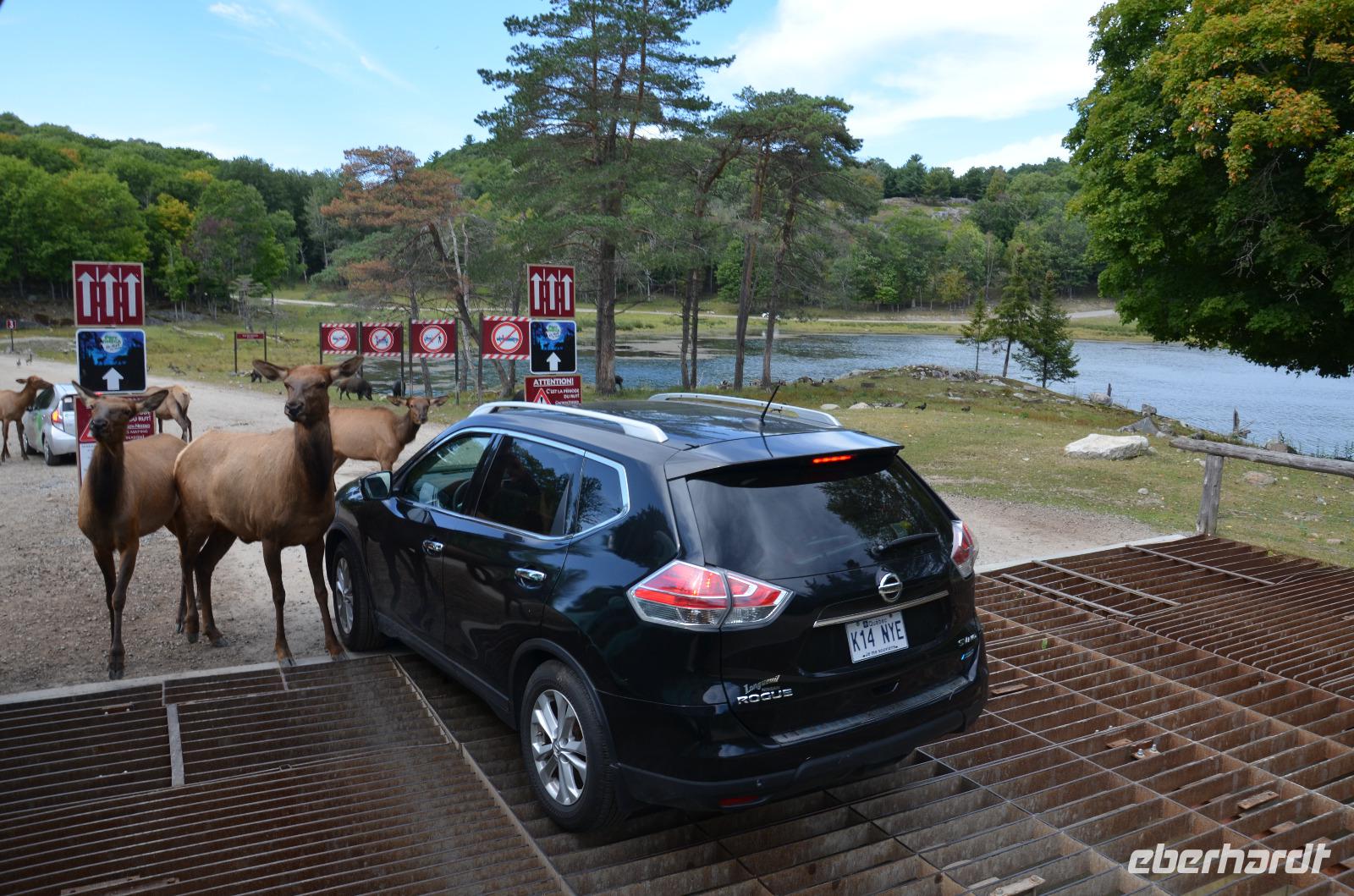 Angekommen an unserer Mittagsstation, erwartet uns ein reichhaltiges Buffet, was wirklich keine Wünsche offen lässt und uns zu regelrechten Begeisterungsstürmen beflügelt. Bis wir nach dem Verzehr der insgesamt mindestens drei Gänge aufstehen müssen und feststellen, dass es vielleicht doch etwas zu viel war...Aber wer konnte zu diesem Dessertbuffet auch nein sagen?! Das allgemein als „Château Montebello" bekannte Luxushotel hat somit seinem Namen alle Ehre gemacht. Es behält sich im Übrigen vor, die weltweit größte Holzkonstruktion darzustellen. Das Baumaterial des Hotels ist hier somit, neben der allgemeinen Luxusausstattung, die Hauptattraktion. Leicht schwerfällig aber glücklich begeben wir uns weiter zum Omega Wildpark, in dem wir einen alten, umgebauten Schulbus besteigen. Die Hauptsache ist, dass die Fenster offen sind bzw. fehlen und wir genügend Möhren für die bevorstehende Fütterung der Wildtiere dabei haben. Direkt am Eingang findet eine ausführliche Einlasskontrolle statt. Eine Gruppe Wapiti Hirsche filzt die vor uns wartenden Pkws samt ihrer Insassen aufs Gründlichste. Da bleibt kein Gesicht trocken und definitiv keine Möhre im Auto. Da unser Gefährt etwas höher liegt, können wir die Tiere perfekt bestaunen, fotografieren und natürlich auch streicheln sowie füttern. Auf mysteriöse Weise landen immer wieder Karotten, trotz des engagierten Versuchs, sie durch die großen Fenster des Busses zu befördern, zurück im Inneren und somit auch gern einmal im Schoss oder „bestenfalls" am Kopf eines Passagiers. Dies ist auch eine interessante Art, die Futtermöhren zu verteilen :). Auch hier nenne ich natürlich keine Namen. Denn was in der Gruppe passiert, bleibt in der Gruppe! So werden nicht nur die Tiere gefüttert, sondern auch großzügig die an uns vorbei fahrenden Pkws von Besuchern. Wir sind schließlich nicht knausrig ;). Durch ihre beachtliche Größe, als zweitgrößte Hirschart, kommen die Wapitihirsche problemlos an die Fenster des Busses heran. Nur der Elch ist größer und diesen werden wir ein wenig später auch noch zu Gesicht bekommen. Auf der 12 km langen Strecke durch Wälder und Wiesen können wir alle Bewohner des Parks bei schönstem Sonnenschein bestaunen. So sehen wir unter anderem verschiedenste Hirscharten, Bisons, Wölfe, Polarfüchse, wilde Truthähne und Kanada Gänse. Das absolute Highlight folgt zum Schluss - Schwarzbären! Obwohl wir uns extra einen Beutel Möhren für diesen besonderen Moment aufgehoben haben, müssen wir nun feststellen, dass sie regelrecht Spalier stehen, um von unserem Fahrer ein Stückchen WURST zu ergattern. Aber der Gedanke zählt!:) Während also einige aufgeregt immer wieder Männchen machen, liegen andere träge auf Felsbrocken und lassen sich von der Sonne den dunklen Pelz wärmen. Was für ein Schauspiel! Nach dieser erlebnisreichen Fahrt begeben wir uns wieder in die vertrauensvollen Hände von René und legen die letzten Kilometer nach Ottawa, der Hauptstadt Kanadas, zurück. Den Tagesabschluss bildet eine kleine Stadtrundfahrt mit eingebautem Fotostopp, die Vorfreude auf morgen macht.