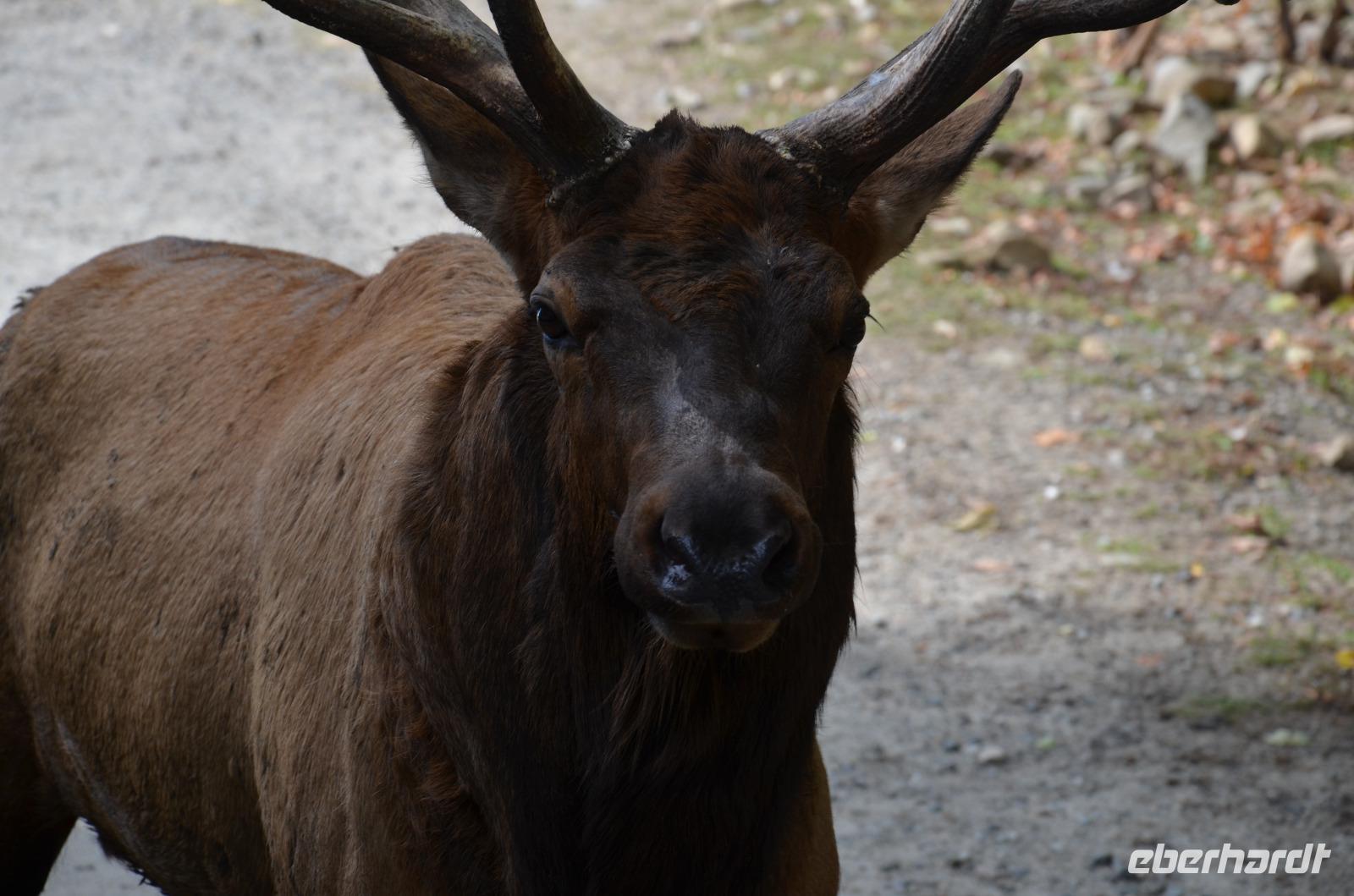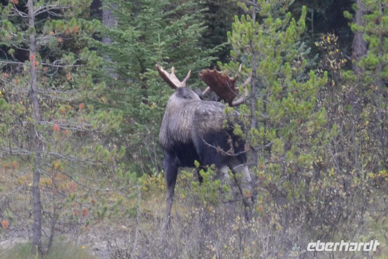 In den ersten fünf Minuten meistern wir diese Aufgabe tatsächlich mit Bravour! So streifen wir durch die malerische Szenerie des Waldes, mit den einfallenden Sonnenstrahlen, die alles zum Funkeln bringen. Selbst an einer wunderschönen, gelb leuchtenden Lichtung mit Blick auf die Berge, werden wir nicht fündig. Dafür nutzen wir die Idylle für den Schnappschuss des Tages mit dem Titel „Die Elchjäger" :). Der kleine Ausflug hat sich trotzdem mehr als gelohnt. Nur Dave wird nicht ganz so begeistert sein, wenn er unsere völlig schlammverkrusteten Schuhe entdeckt, mit denen wir nun wieder einsteigen. Aber immerhin zieht sich nur bei Wenigen der Dreck bis hoch zu den Knien - was tatsächlich komisch ist, da wir alle auf den gleichen Pfaden gelaufen sind :D. Auf dem Rückweg haben wir das ganz große Glück, dass der Elchbulle immer noch an der gleichen Stelle zu finden ist. Während er in Ruhe durch den Wald streift, fahren wir mit dem Bus auf der gleichen Höhe nebenher. Fantastisch! Unser nächstes Ziel ist der „Maligne Canyon", eine langgezogene Schlucht, durch die sich der „Maligne River" unter- oder oberirdisch schlängelt und zu Teilen in tosenden Wasserfällen ergießt. Der Wald und auch die Ausblicke von den zahlreichen kleinen Brücken auf das Spektakel sind einmal wieder märchenhaft. Wir erkunden die Gegend, entdecken immer neue Pflanzen- und Pilzarten und hoffen gespannt auf unsere erste Schwarzbärensichtung. Es soll leider noch nicht so weit sein...Zum Ausklang des Tages fahren wir zurück in die Zivilisation nach Jasper und nutzen die Zeit, um uns im hiesigen Supermarkt mit allem Lebenswichtigen zu versorgen. Ein Highlight sollte aber noch auf uns warten...In der Gegend rund um Jasper gibt es große Wapiti-Herden, die wir heute Morgen leider nicht aufspüren konnten. Alle Späher sind konzentriert auf ihren Posten und somit dauert es nicht lange, bis wir den ersten Bullen mit seinem mächtigen Geweih im Schutz der Sträucher erblicken. Laut Dave ist er ein Einzelgänger, da er sich noch nicht mit dem Platzhirsch der Herde messen kann, ihnen aber trotzdem immer auf den Fersen ist. Zu unserem Glück überquert er direkt vor uns die Straße und wir können ihn somit in seiner vollen Pracht bewundern. Die Fahrt geht weiter und alle sind schon ganz gespannt, ob sich die restliche Herde wirklich in unmittelbarer Nähe befinden wird. Ein wenig später entdecken wir genau vor uns widerrechtlich parkende Fahrzeuge auf der Straße und aufgeregt herbeieilende Menschen, die Richtung Fluss gestikulieren. Manchmal wundert es mich fast, dass unser Bus das Gleichgewicht behält, wenn mit einem Mal alle Insassen auf eine Seite stürmen und sich gegen die Fensterscheibe pressen :D. Aber unser Gefährt schwankt nicht einmal... Die große zentrale Frage, die noch keiner beantworten kann - was wurde gesichtet und wo ist es????! Da wir uns auf der anderen Straßenseite befinden, können wir aufgrund der Entfernung niemanden fragen und wie immer aus Sicherheitsgründen nicht aussteigen. Das dies keine überzogene Maßnahme ist, werden wir gleich im Anschluss erfahren. Aber zurück zum Fluss. Auf einer kleinen, freiliegenden Insel inmitten des Gewässers ist deutlich eine schwarze Gestalt zu erkennen. Ein Bär???! Am Rande des Flusses bewegt sich ein menschliches Wesen, wie wir später ausmachen können. Im Endeffekt handelt sich hier um einen falschen Alarm und wir können alle herzlich darüber lachen, wie aufgeregt immer wieder das Wort Bär im Bus geschrien wurde. Alle Fahrzeuge, die nach uns noch aufgeregt halten und über die Straße stürmen, können wir nur mit einem Lächeln abtun. So muss sich das spannende Leben eines Paparazzis anfühlen, der immer auf dem Sprung unter Daueradrenalin auf den großen Schuss wartet. Der Adrenalinpegel ist jedenfalls bei uns gerade deutlich erhöht. Wir nehmen wieder Fahrt auf und sehen bereits wenige hundert Meter weiter den nächsten Autokorso. Und da sind sie. Wir haben endlich die Wapiti-Herde mit ihrem mächtigen Vorsteher gefunden. Danach ist alles wie in einem Film. Der Hirsch mit seinem gewaltigen Geweih ist deutlich aufgeregt und versucht seine Herde immer wieder zusammen zu treiben. Der junge Bulle von zuvor ist in unmittelbarer Nähe und wagt vor unseren Augen einen Angriff, der allerdings gekonnt abgewehrt wird. Als er ein zweites Mal verjagt wird, zieht er sich in den Wald zurück. Der Platzhirsch versucht hingegen, seine Hirschkühe zum Weiterziehen zu animieren. Als ihm zwei asiatische Touristen die Kamera direkt vor die Nase halten, macht er plötzlich einen großen Satz und richtet das gewaltige Geweih direkt auf den Mann. Von unserem Standpunkt aus, sieht es so aus, als hätte er ihn direkt aufgegabelt. Anstatt sich schleunigst in Sicherheit zu bringen, bleibt der Mann stehen und wartet den zweiten Angriff ab. Was ist hier nur los?! Erst danach bringen sich alle Beteiligten in den Schutz ihrer Fahrzeuge. Nach dieser Demonstration geballter Kraft werde ich Dave nie wieder fragen, ob wir vielleicht doch kurz aussteigen dürfen. Was für ein imposantes Schauspiel uns hier gerade geboten wurde, müssen wir erst noch verarbeiten. Auf dem Weg zu unserem Hotel genießen wir die abendliche Stimmung, in der das gelbe Laub der Espen unter den letzten Sonnenstrahlen hell aufleuchtet und ein wundervolles Bild inmitten der mächtigen Berge erzeugt. Und plötzlich überqueren nicht wirklich noch zwei Weißwedelhirsche die Straße und warten am Straßenrand kurz, dass wir Passieren und somit einen guten Blick auf sie erhaschen können. Was für ein Tag! Durch die Ereignisse der letzten Stunden kommen wir heute erstmalig leicht verspätet im Hotel an und begeben uns direkt zu unserem wohlverdienten Abendessen, bei dem wir das heute Erlebte in Ruhe auswerten.