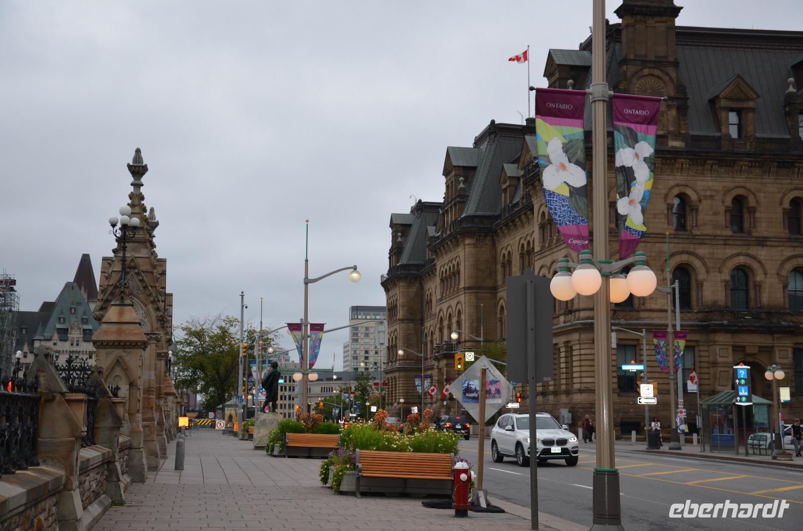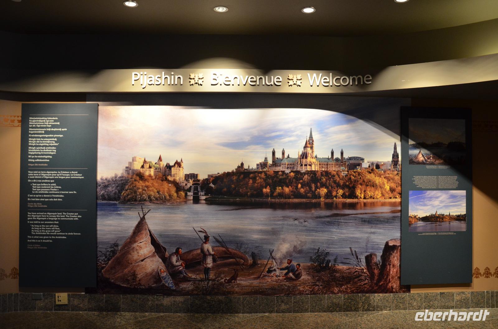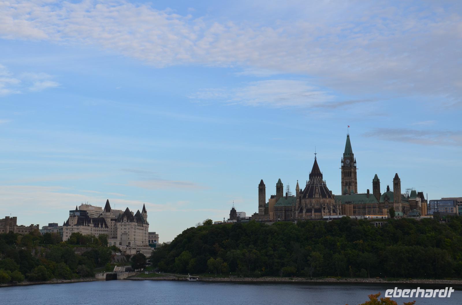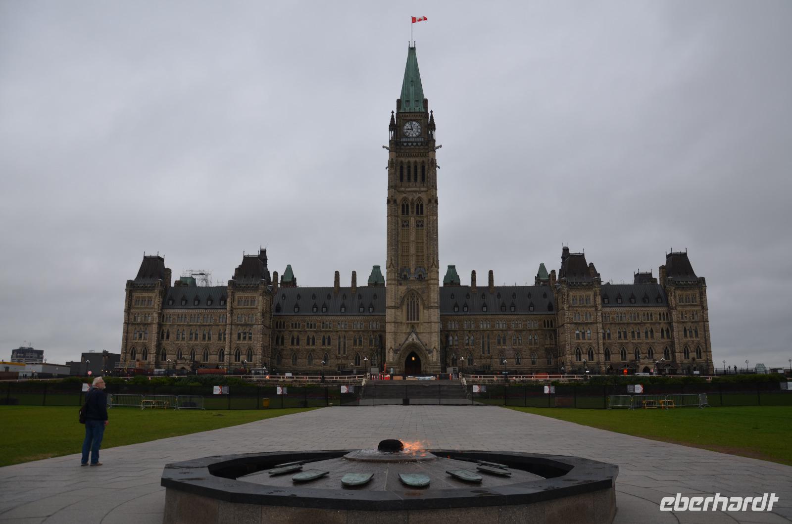 Der heutige Tag startet etwas grau in grau, was uns allerdings nicht davon abhält, gut gelaunt unseren Bus zu besteigen. Der erste Stopp findet am imposanten Parlamentsgebäude Ottawas statt. Dieser im neogotischen Stil erbaute, auffällige Gebäudekomplex, untergliedert sich in den „Centre Block", welcher den markanten, 92 Meter hohen „Peace Tower" (Friedensturm) beinhaltet sowie in den East und West Block, in denen sich hauptsächlich Büros befinden. Auf keinem Foto darf allerdings die symbolträchtige „Centennial Flame" (hundertjährige Flamme) fehlen, welche zu Ehren des 100-jährigen Bestehens der Kanadischen Konföderation errichtet wurde. Eigentlich sollte sie nach den Feierlichkeiten 1967 wieder abmontiert werden, was allerdings von der Bevölkerung erfolgreich verhindert wurde.