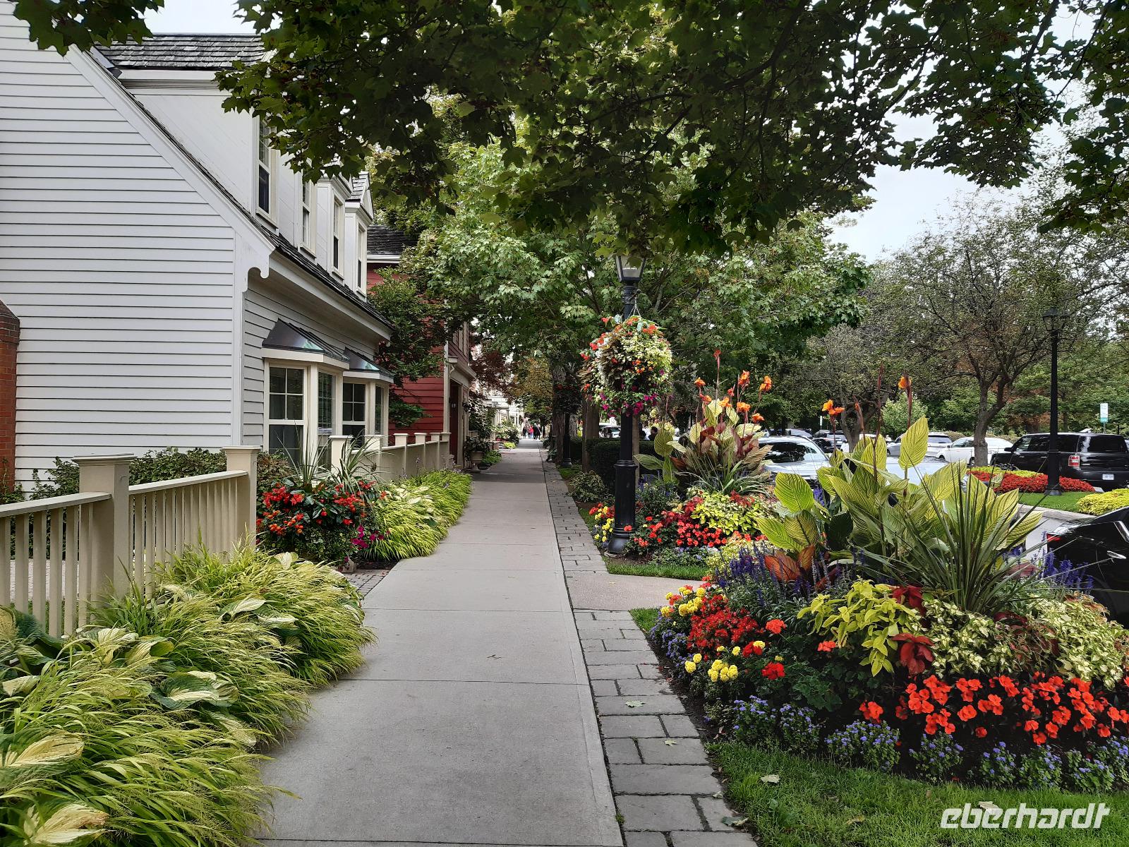 Nach dieser rasanten Fahrt geht es auf der Landstraße 40 eher beschaulich weiter. Direkt am Ufer des Sankt-Lorenz-Stroms entlang, reiht sich hier idyllisch ein kleines, buntes Holzhäuschen ans andere. Meist ausgestattet mit Veranda und kleinem Garten, fällt auch hier wieder die Blumenpracht ins Auge und der auf höchstem Niveau gepflegte Englische Rasen - leuchtend grün und genau 4-5cm hoch. Auch, wenn ein Haus einmal nicht tadellos in Schuss sein sollte, der Rasen hat definitiv die richtige Länge! So fahren wir durch diese wunderschöne Landschaft, von Weitem leuchten immer wieder die Zinndächer der jeweiligen Dorfkirchen auf und der ein oder andere sucht sich verträumt das passende Häuschen für seinen Ruhestand in Kanada aus - ganz vorn an unser Reiseleiter ;).