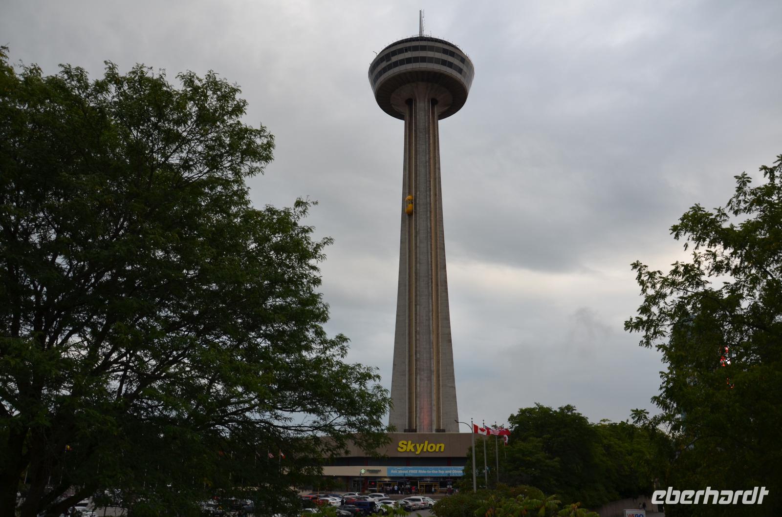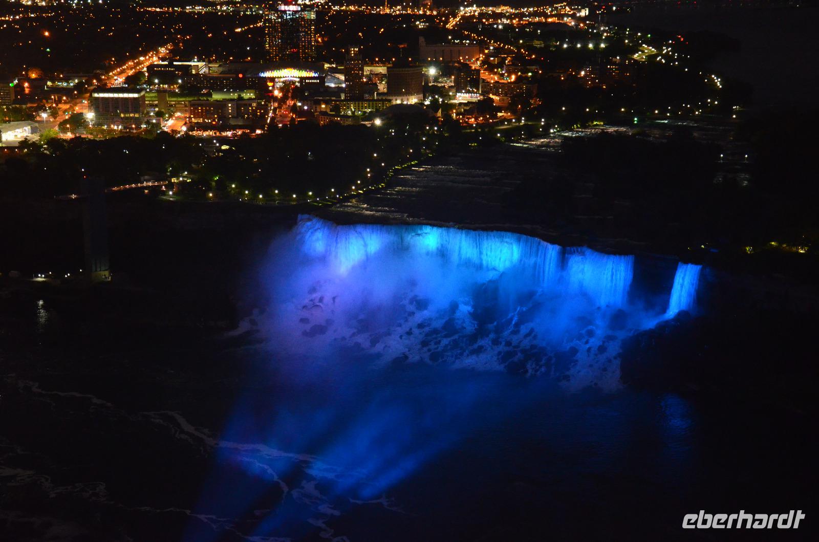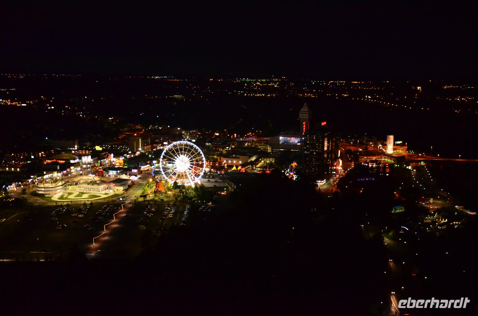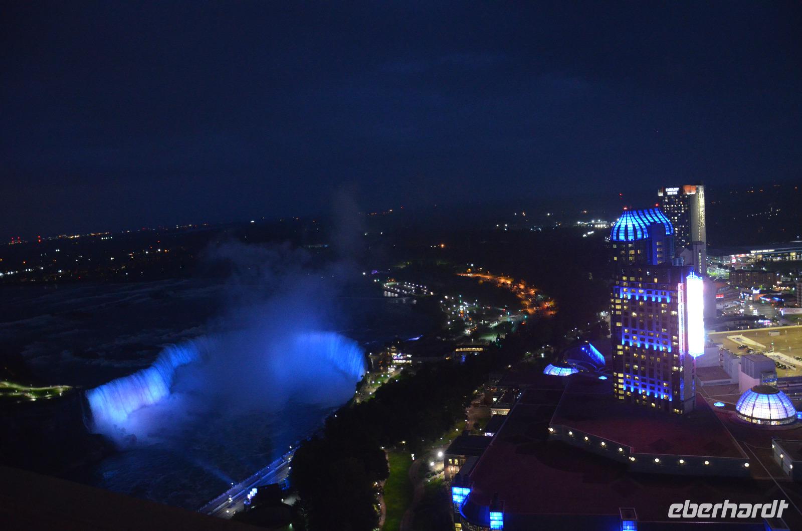 Dann ist es endlich so weit. Die Sonne hat sich endlich blicken lassen und wir sind bereit, professionell ausgestattet in unseren roten Plastiküberziehern, das Boot zu besteigen. Die Fahrt dauert 30 Minuten. Je nach dem wie todesmutig man ist, kann man die gesamte Fahrt auf den Außendecks verbringen und wird dementsprechend nass, oder sitzt vor Spritzwasser geschützt gemütlich im Inneren des Vehikels. So passieren wir zuerst die „American Falls" (Amerikanische Fälle) mit den direkt angrenzenden, kleineren „Bridal Wahle Falls" (Brautschleierfälle) und fahren dann weiter zu den imposanten „Horseshoe Falls" (Hufeisenfälle). Hier wagen wir uns ganz nah an die herabstürzenden Wassermassen heran und dementsprechend groß ist die Aufregung auf den Außendecks. Es ist jedenfalls ein echtes Erlebnis - egal, wo man sich auf dem Dampfer befindet! Auf dem Rückweg zum Bus bestaunen wir noch kurz die für die Touristen errichtete Unterhaltungsmeile und machen uns im Anschluss auf zu einem letzten Fotostopp am Rande der „Horseshoe Falls". Hier kann man die herabstürzenden Wassermassen des Niagara Flusses samt Regenbogen perfekt einfangen, da man nur wenige Meter vom Abgrund entfernt steht. Als auch dies erledigt ist, steuern wir unser Hotel an. Wer einen Helikopterflug über die Fälle gebucht hat, kommt allerdings nur kurz zum Verschnaufen, da dieser direkt im Anschluss stattfindet. Heute jagt ein Ereignis das Nächste! Der Rest der Gruppe kann die zentrale Lage des Hotels für einen erneuten Spaziergang nutzen, oder einfach nur den Luxus der Zimmerausstattung bzw. den des Spa-Bereichs genießen. Hierbei sollte man im Übrigen immer seine Zimmerkarte dabei haben, damit man sich nicht versehentlich im Schwimmbad einsperrt. Nur als kleiner Hinweis :). Die Krönung des Tages erfolgt dann am Abend, als wir ein gemeinsames Abendessen im Skylon Tower auf 115 Metern einnehmen. Das Buffet ist reichhaltig und die Aussicht auf die Niagara-Fälle ist einfach nur fantastisch. Besonders, als die Fälle später am Abend in verschiedenen Farben ausgeleuchtet werden. Auf der Aussichtsplattform in schwindelerregenden 132 Metern kann man den Ausblick besonders gut genießen und natürlich auch fotografisch festhalten. Im Anschluss geht es in nur 52 Sekunden via Außenfahrstuhl wieder nach unten.