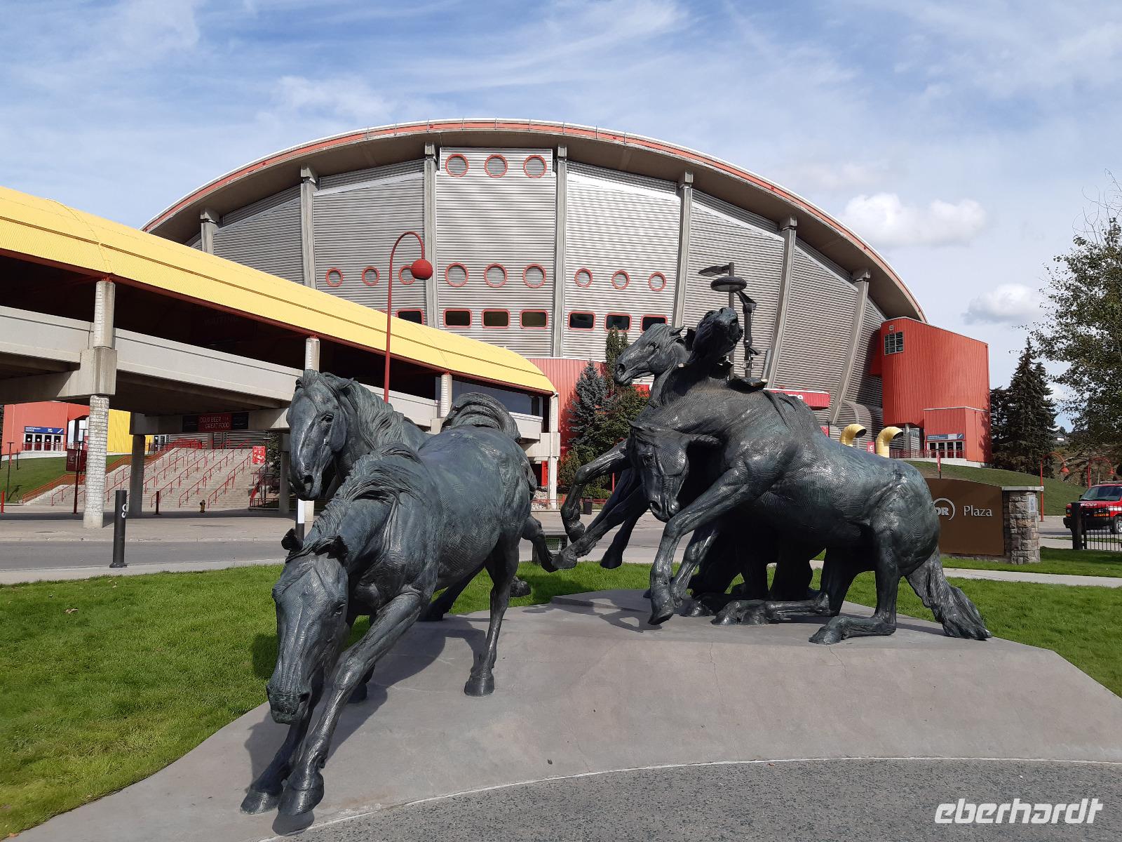 So schön es hier war und so gern wir noch etwas geblieben wären, heißte es heute Abschied nehmen - und das gleich mehrfach. Damit wir dies alles professionell in unserem vollgepackten Terminplan unterbringen können, starten wir direkt 5 Uhr morgens in den Tag! ...weil wir es können...Die ganz Professionellen unter uns stechen dabei direkt hervor, als sie zu dieser doch frühen Morgenstunde einen vollen Teller mit Rührei, Speck, Würstchen und „Hash Browns" (Kartoffelpfannkuchen) verdrücken. Runtergespült wird alles gekonnt mit Kaffee. Spätestens heute trennt sich die Spreu vom Weizen und ich kann stolz berichten, dass der Großteil der Gruppe sich unter die edlen Getreidesorten einreiht. Ihr habt meinen vollen Respekt...sprach die Spelze! :D Danach begeben wir uns auf die letzte Fahrt mit unserem geliebten Busfahrer René. Wir werden ihn in Ehren halten! Nach anderthalb Stunden Fahrt kommen wir auch schon am Flughafen in Toronto an. Wir haben René gebührend verabschiedet und sehen nun dabei zu, wie unser Reisebus ein letztes Mal davon fährt. Es steht aber noch ein weiterer, weitaus schmerzvollerer Abschied an...Heute müssen wir unseren Professor, unseren geliebten Kapitän, Stempler und „Ritter" ziehen lassen, da wir auf der Westroute dieser Reise einen neuen Reiseleiter bekommen. Da sich unsere Reisegruppe so gut zusammengefunden hat, übertreibe ich nicht, wenn ich sage, dass der Abschied schwer fällt. Wir haben so viel über seine Erzählungen gelacht, sind ab und zu beim sanften und ruhigen Klang seiner Stimme ins Traumreich abgewandert und haben die gemeinsame Zeit einfach nur genossen. Vielen Dank dafür!!!Wie es sich für echte Abenteurer gehört, nehmen wir die gemachten Erlebnisse dankbar mit und schauen voller Vorfreude, auf alles, was noch kommen mag! Dabei überwinden wir auch die Hürden des Check-ins am Flughafen und trotzen der Sicherheitskontrolle mit einer stoischen Ruhe! Hierzu nun die Bekanntgabe der Rekordgewichtssummen von Gepäckstücken. Das Wichtigste zuerst - mein Koffer war nicht der schwerste! Obwohl der elitäre Club der „Heavy-Tags" (Kofferanhänger mit dem Vermerk „schwer") überschaubar ist. Das Maximum liegt bei unübertroffenen 26,3 kg und das Minimum bei 11,5kg. Wie Zweiteres möglich ist, ist mir nach wie vor ein absolutes Rätsel :).Die vier Stunden im Flieger vergehen wortwörtlich wie im Flug. Die Flugdauer und auch die erneute Zeitverschiebung von minus zwei Stunden lässt erahnen, wie groß dieses Land ist. In Calgary, der größten Stadt der Provinz Alberta, angekommen, werden wir bereits von Gudrun, unserer neuen Reiseleiterin und Dave, unserem neuen Busfahrer erwartet. Auch, wenn das erste Zusammentreffen etwas holprig verläuft und zu Teilen zu Unstimmigkeiten führt, lehrt uns dies eine wichtige Lektion fürs Leben - Es lohnt sich immer ein zweites Mal mit offenen Augen und einem offenen Herzen hinzuschauen. Besser als mit Gudrun und Dave hätte es uns nämlich nicht treffen können. Aber dazu später mehr! Wir starten also in unserer neuen Konstellation direkt auf eine Stadtrundfahrt mit anschließendem Stadtrundgang in Calgary. Da Gudrun bereits fast ihr ganzes Leben hier verbracht hat, ist sie die perfekte Ansprechpartnerin für alle Fragen. So schlendern wir über die bunt schillernde „Olympic Plaza", auf der zu den Olympischen Winterspielen 1988 die Medaillen vergeben wurden, weiter entlang auf der Einkaufsmeile vorbei am Luxushotel Fairmont Pallisier, bis hin zu einem Einkaufstempel, in dem wir unser Mittagessen einnehmen. Immer begleitet werden wir dabei von einem leichten Marihuanageruch. Aber das ist hier schließlich legal und gehört zum Großstadtleben einfach dazu. Im Anschluss geht es auf Richtung Banff, unserem heutigen Endziel. Auf dem Weg halten wir für zwei Fotostopps am „Stampede Park", der jährlich das größte Outdoor-Spektakel der Welt ausrichtet und am „Olympic Park", wo die Kanadier auch heute noch mit Begeisterung zahlreiche Wintersportarten ausüben können. Danach befinden wir uns im direkten Anflug auf Banff. Entlang weiter, saftig grüner Weideflächen zieht sich die Landschaft schier endlos dahin. Dazu scheint die Sonne am klaren, hellblauen Himmel, an dem sich immer neue Wolkenformationen bilden. Ein wundervoller Anblick, der einen träumen lässt. Am Horizont lassen sich bereits die ersten Berge erkennen, die mit unserer baldigen Ankunft immer größer werden. Genau richtig zur Abendbrotzeit trudeln wir in Banff ein. Nach einer kurzen Runde mit dem Bus durch das beschauliche Städtchen zur Orientierung, sind wir bereit ins hotelnahe Restaurant einzukehren. Das Essen ist hervorragend und so sitzen wir in geselliger Runde und läuten die neue Etappe unserer Reise ein.