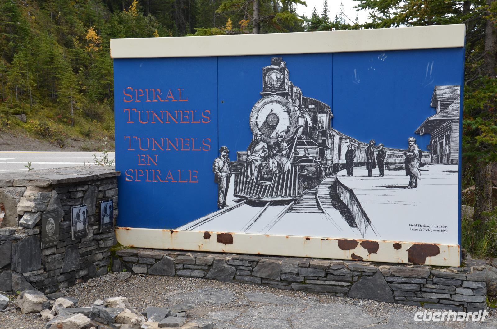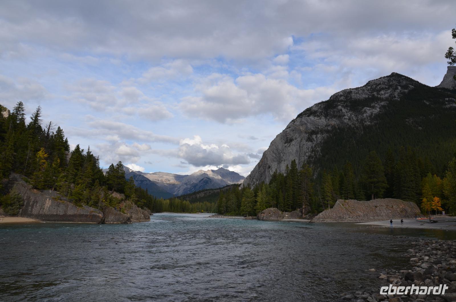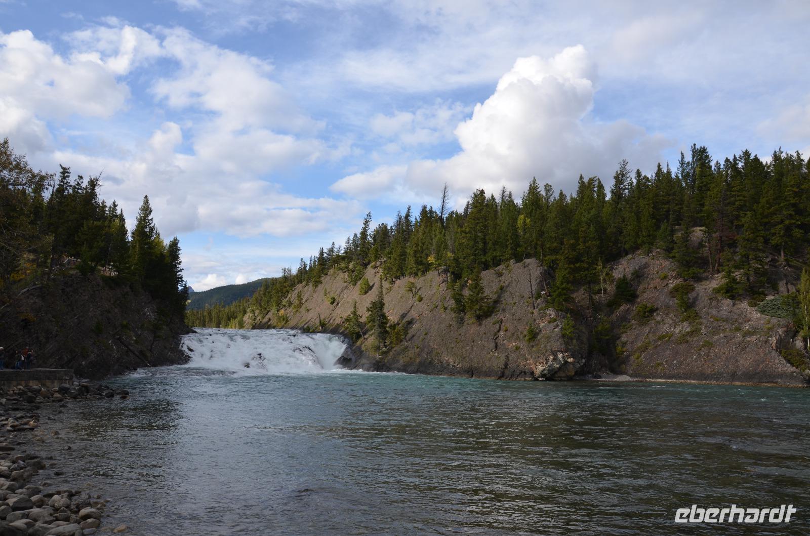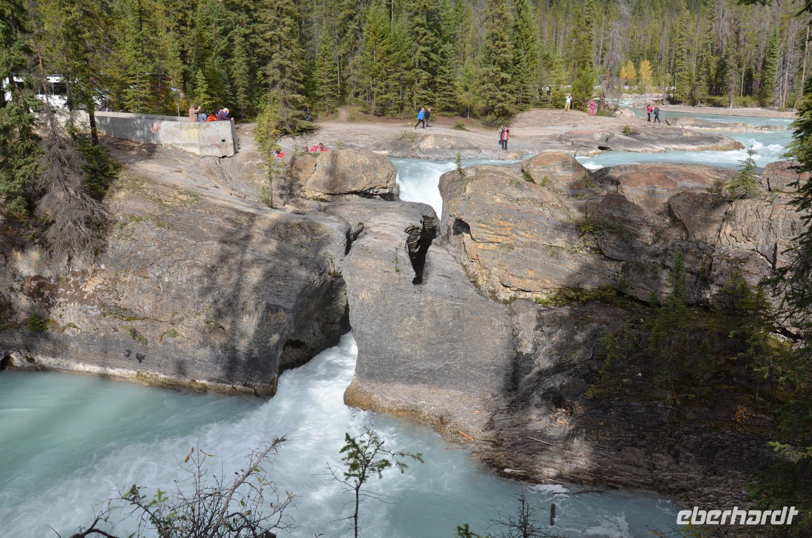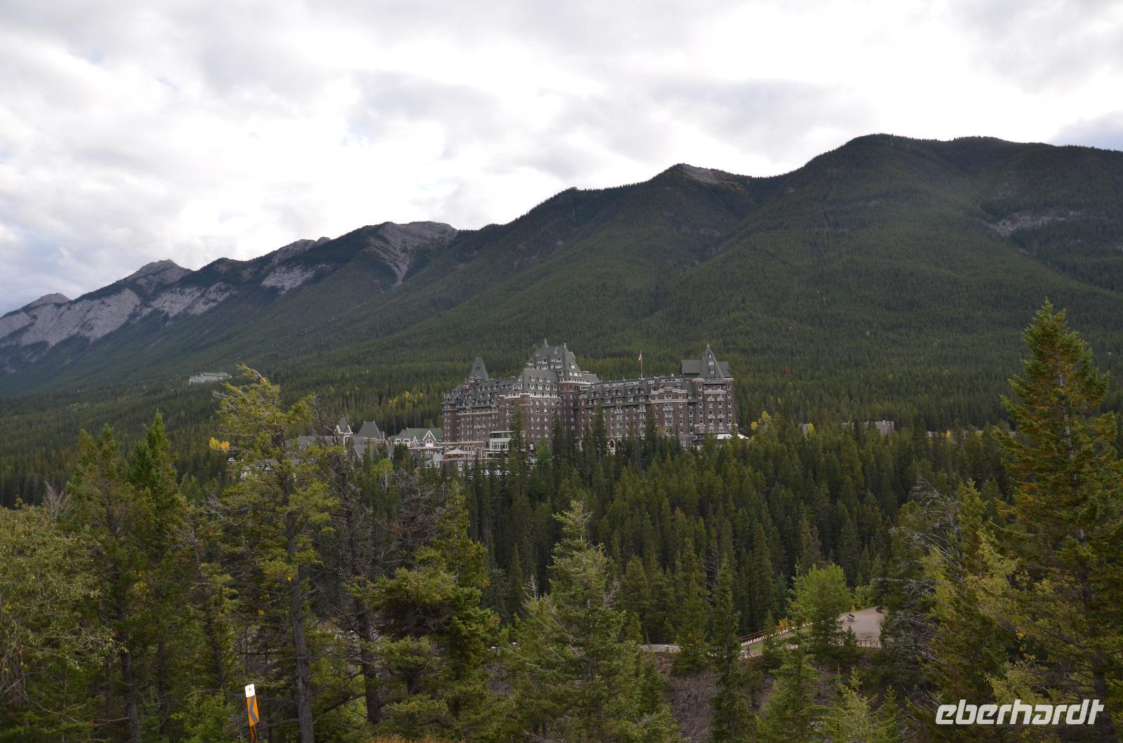Nach einer kurzen Mittagspause fahren wir weiter auf dem gewundenen Trans-Canada-Highway entlang des Bows und inmitten der Gebirgszüge. Unser nächster Halt ist am Aussichtspunkt der „Spiral Tunnels" (Spiraltunnel). Hierbei handelt es sich um zwei Kehrtunnel durch das Felsmassiv erbaut durch die Eisenbahngesellschaft „Canadian Pacific Railway", auf denen durch das verringerte Gefälle von 45 auf 22 Grad die ursprüngliche Strecke massiv entlastet wurde und heute Züge mit Waggonlängen von bis zu über 100 Waggons fahren. Leider haben wir bei unserer Ankunft einen durchfahrenden Zug ganz knapp verpasst und begnügen uns somit mit dem dargestellten Informationsmaterial aus Fotos und Artikeln am Aussichtspunkt. Auf unserer weiteren Fahrt werden wir dafür noch unzählige Züge passieren sehen. Wir befinden uns mittlerweile im „Yoho-Nationalpark" und steuern als nächstes den „Emerald Lake" (Smaragdsee) an, den größten See dieses Parks. Wir ergattern gerade noch den letzten Busparkplatz und dementsprechend hoch ist hier das Aufkommen an Asiatischen Touristen. Nichtsdestotrotz finden wir ein ruhiges Plätzchen am Rande des Sees, wo wir uns auf einer Holzbank niederlassen und die Szenerie auf uns wirken lassen. Danach wird wieder aufgesattelt und es geht weiter zu einem Fotostopp an der „Natural Bridge", einem natürlich entstandenem Bogen/Brücke, an dem sich der „Kicking Horse River" durch ein Kalksteinmassiv gegraben hat. Die Sonne scheint auf das funkelnde Wasser und wir genießen den Moment mit den uns bereits bekannten Gesichtern. Denn wo wir hinfahren, sind die anderen Busse schon da oder kommen nach ;). Der ereignisreiche Tag neigt sich langsam dem Ende und wir haben heute allein beim Ein- und Aussteigen aus dem Bus unser Tagespensum an Sport absolviert. Dazu muss ich bemerken, dass dies mittlerweile ein Automatismus geworden ist, der in seiner Perfektion seinesgleichen sucht! Zumindest gilt dies für das Aussteigen... ;). Nachdem wir auf dem Rückweg den „Mount Randle" abgelichtet haben, kommen wir zu unserem vorletzten Stopp für den heutigen Tag - den „Bow-Wasserfällen", die sich am Rande der Stadt Banff in die Tiefe stürzen. Noch viel schöner sieht diese Szenerie allerdings von hoch oben auf dem dafür extra errichteten Aussichtspunkt aus. Von hier aus kann man zudem perfekt das imposante Luxushotel „Fairmont Banff Springs" in seiner vollen Größe überblicken, was einmal wieder mehr einem Schloss als einem gewöhnlichen Hotel gleicht. Auf der Anfahrt zum Hotel sehen wir auch endlich unsere ersten Wildtiere! Vor unserem Bus überqueren drei mächtige Wapitis gemächlich die Straße. Direkt im Anschluss grasen Maultierhirsche seelenruhig neben dem Weg. Wir vermerken -in der Stadt hat man gute Chancen Wildtiere zu sehen. Man muss nur nach nicht zulässig parkenden Autos Ausschau halten. Eine derartige Wildsichtung ergibt nämlich bei Zeiten einen größeren Stau.