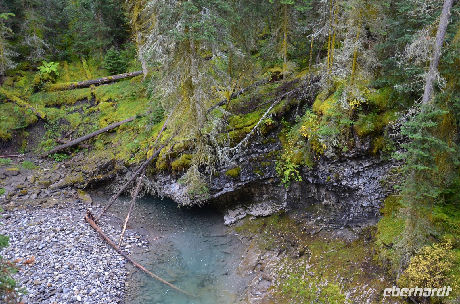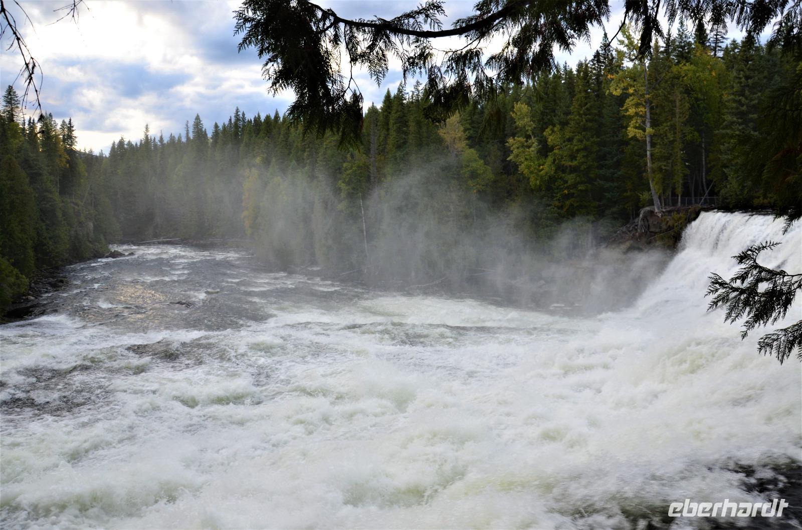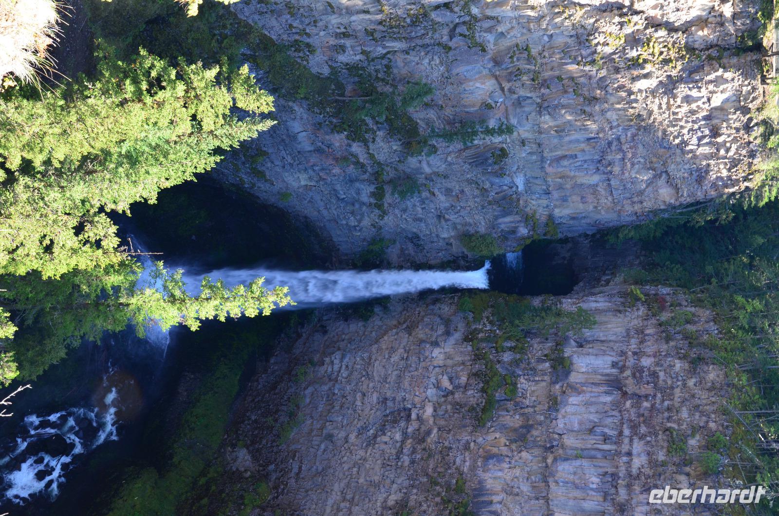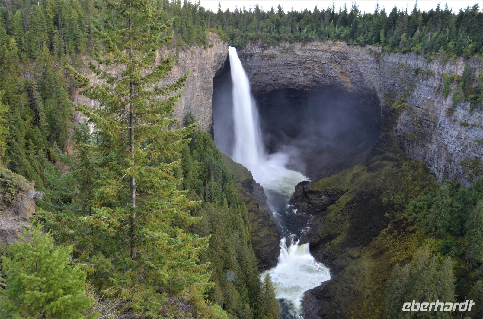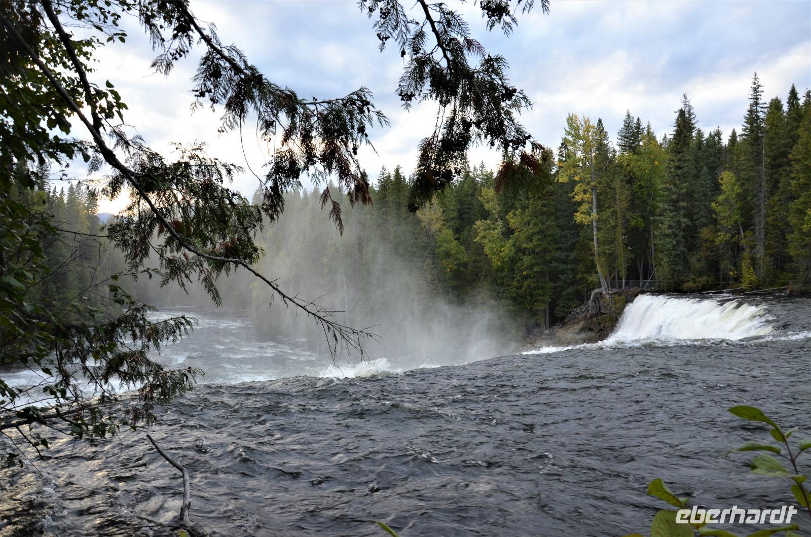 für schöne Fotos am Mount Terry Fox sowie in Valemount, wo wir leider erfolglos versuchen Königslachse aufzustöbern, nehmen unser Mittagessen an einer Picknickstation ein und halten wenig später am Wells Gray Besucherzentrum für eine Kugel Eis. Dann folgt der nächste Paukenschlag an den „Spahats Falls", den aus dem Indianischen übersetzt „Bär-Wasserfällen". Jedes Mal wenn man glaubt, endlich ein komplettes Bild von Kanada zu haben, wird man aufs Neue überrascht. Uns erwartet ein regelrechter Märchenwald, in dem mit Moos bewachsene Bäume der roten Zeder, der Douglastanne sowie der Hemlocktanne stehen - alles drei Baumgattungen, die wir bisher noch nicht gesehen haben. Gerade das weiche Holz der roten Zedern wurde von den Indianern bevorzugt genutzt, um daraus Einbaumkanus zu fertigen. Der Anblick dieser geschichtsträchtigen Baumriesen, deren Kronen von den Strahlen der Sonne durchflutet werden, ist ein ganz besonderer. Am Ende des kleinen Waldweges erwartet uns die eigentliche Attraktion - die „Spahats Wasserfälle". Die Wasserfälle ergießen sich aus einem Loch im Felsen hinunter in eine tiefe Schlucht über ca. 75 Meter. Ein wunderschöner Anblick in einer noch schöneren Szenerie. Danach checken wir in unser Hotel in Clearwater ein und genießen einen kurzen Moment der Ruhe. Ein Luxus, der sich zum ersten Mal auf dieser Reise ergibt. Nach dieser kurzen Verschnaufpause eilen wir zum nächsten Wasserfall im „Wells Gray Provincial Park", den sogenannten „Helmcken Falls". Hier stürzen die Wassermassen des „Murtle Rivers" über 141 Meter in die Tiefe und bilden somit den vierthöchsten Wasserfall in ganz Kanada.