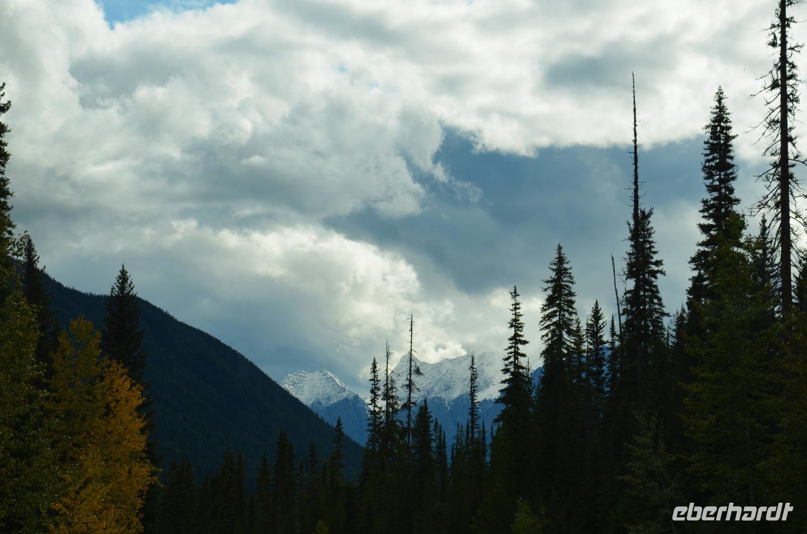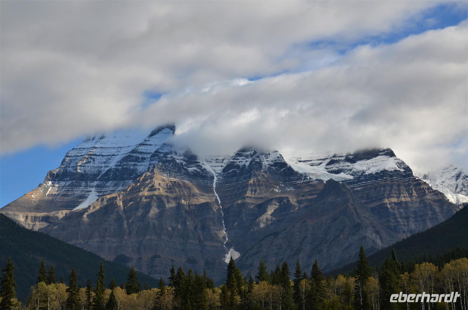 Die Landschaft verändert sich zusehends. Die Berge werden immer kleiner, die Wälder werden dichter und artenreicher und am Flussufer tun sich weite, golden leuchtende Wiesen auf, eingebettet in eine ausgedehnte Sumpflandschaft. Der perfekte Lebensraum für Elche und Schwarzbären. Obwohl alle Späher hoch konzentriert auf ihren Posten sind, werden unsere kräftezehrenden Bemühungen nicht belohnt. Aber beschweren können wir uns nach gestern nicht... So machen wir uns auf zu neuen Taten und überqueren die Grenze hin zur am westlichsten gelegenen Kanadischen Provinz „Britisch-Kolumbien". Ein Eingangsschild und eine Gruppe Kanada Gänse heißen uns dabei willkommen, wobei wir zusätzlich die Uhren um eine weitere Stunde zurückstellen dürfen. Auf der bisherigen Fahrt passieren bereits zwei Meilensteine. Zum einen beginnt mich Dave mit „Boss" zu betiteln - wenigstens einer, der endlich meine Qualitäten erkennt - und zum anderen lüften wir endlich das Geheimnis um die Bettlaken in den Hotels. In Kanada gibt es nämlich keine Bettbezüge. Die Bettdecke wird lose in zwei Laken eingewickelt, wodurch man nachts bei einem normalen Bewegungsaufkommen bei Zeiten unter der nackigen Decke liegt. Laut Gudrun hat dies Kostengründe, wird traditionell so durchgeführt und ist hygienischer. Beim letzten Argument kann ich mich allerdings nicht anschließen, was vielleicht daran liegen mag, dass ich mich nachts sehr viel bewege... ;) Immer entlang des „Yellowhead Highways" erreichen wir bald unser erstes Ziel - den „Mount Robson Provincial Park". Vom Besucherzentrum aus hat meinen einen perfekten Blick auf den Koloss, dessen Bergspitze die meiste Zeit des Jahres unter einer dicken Wolkendecke versteckt ist. So auch bei uns. Mit seinen 3954 Metern ist er der höchste Berg in den Kanadischen Rocky Mountains und eine wahre Schönheit. Bis zu unserer Ankunft in Clearwater am Nachmittag plätschert der Tag vor sich hin. Wir stoppen
