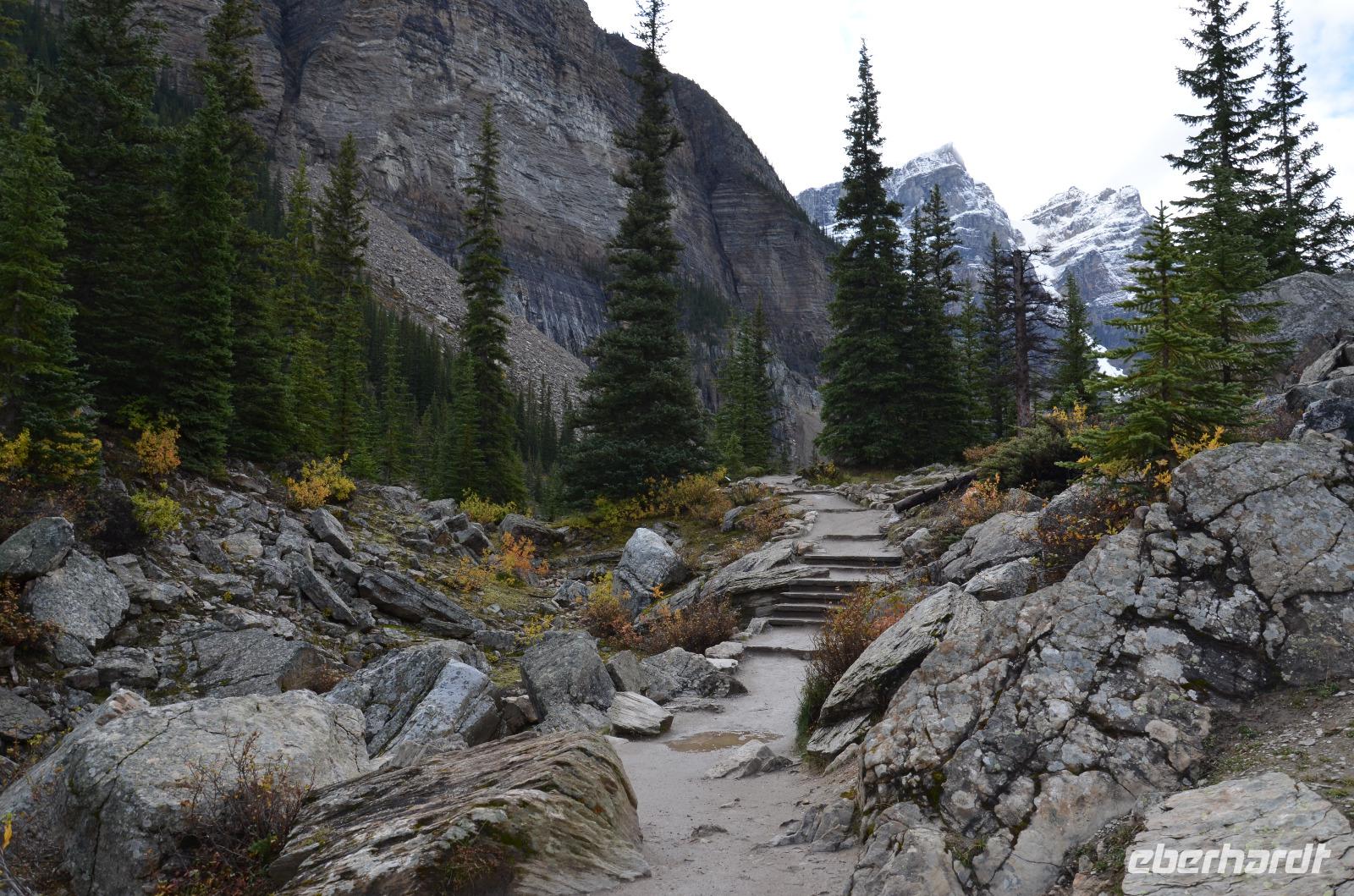 Beim Anblick der uns umgebenden Berge, wird einem bewusst, wie vielfältig dieses Land ist. Wir haben die Städte verlassen und befinden uns auf 1399 Metern am Osthang der Rocky Mountains, die unübersehbar gleich morgens als erstes beim Öffnen der Fenstervorhänge vor uns thronen. Uns erwartet ein langer Tag ganz unter dem Motto - Natur pur! Nach einer Fahrt auf dem „Alberta-Highway 1A" immer entlang des Bow Flusses durch dichte Kiefern- und Fichtenwälder gelangen wir zum „Johnston Canyon". In dieser Schlucht, gelegen im „Banff-Nationalpark", spazieren wir einen reichlichen Kilometer durch den wildbewachsenen Wald bis hin zu den „Lower Falls", einem ca. 10 Meter hohen Wasserfall. Der Wasserfall, aber auch die moosbewachsenen Hänge, auf denen eine Vielzahl von Pilzen angesiedelt ist, bilden ein perfektes Fotomotiv. Dieser Ort gibt uns einen guten Einblick in die wilde Schönheit der Natur Kanadas und macht neugierig auf mehr. Nach einem Fotostopp am „Castle Mountain", dem Burgberg, mit seinen 2766 Metern Höhe, fahren wir weiter zum „Moraine Lake". Da wir auf dem Weg ein regelrechtes Parkleitsystem aus realen Menschen in Warnwesten durchlaufen, lässt sich immer mehr erahnen, wie hoch das Touristenaufkommen in dieser Region ist. Am besagten „Moraine Lake" haben wir allerdings Glück, dass sowohl der Pfad hinauf zum Aussichtspunkt „Rockpile" (Steinhaufen), als auch der selbige nicht so überlaufen sind. Der „Moraine Lake", oder auch zu deutsch „Moränensee", wird von den Gletschern der zehn Gipfel der „Wenkchemna Range" gespeist und liegt auf 1.884 Metern über dem Meeresspiegel. Im sogenannten „Tal der zehn Gipfel" gelegen, strahlt er in einem klaren türkisblau, wie ich es noch nie gesehen habe. Obwohl man den See direkt vor sich hat, wirkt seine außergewöhnliche Schönheit regelrecht unwirklich, wie nicht von dieser Welt. Die Farbgebung entsteht durch die Partikel des Gletscherabriebs, die das einfallende Licht reflektieren. Durch das hohe Aufkommen eben dieser Partikel entsteht die intensiv grün-blaue Farbe, die den See zu Recht zu einem der meistfotografierten Motive ganz Kanadas macht. Und obwohl wir noch nicht mit kleinen Glöckchen am Schuh ausgestattet sind, um uns bei den Grizzlys vorzustellen (...und dies wahrscheinlich auch nicht mehr passieren wird...), lernen wir hier doch auf Hinweisschildern, dass man am besten in einer Gruppe von mindestens drei Personen laufen sollte - oder eben zumindest schneller ist, als das schwächste Glied der Gruppe ;). Willkommen in der Wildnis Kanadas!
