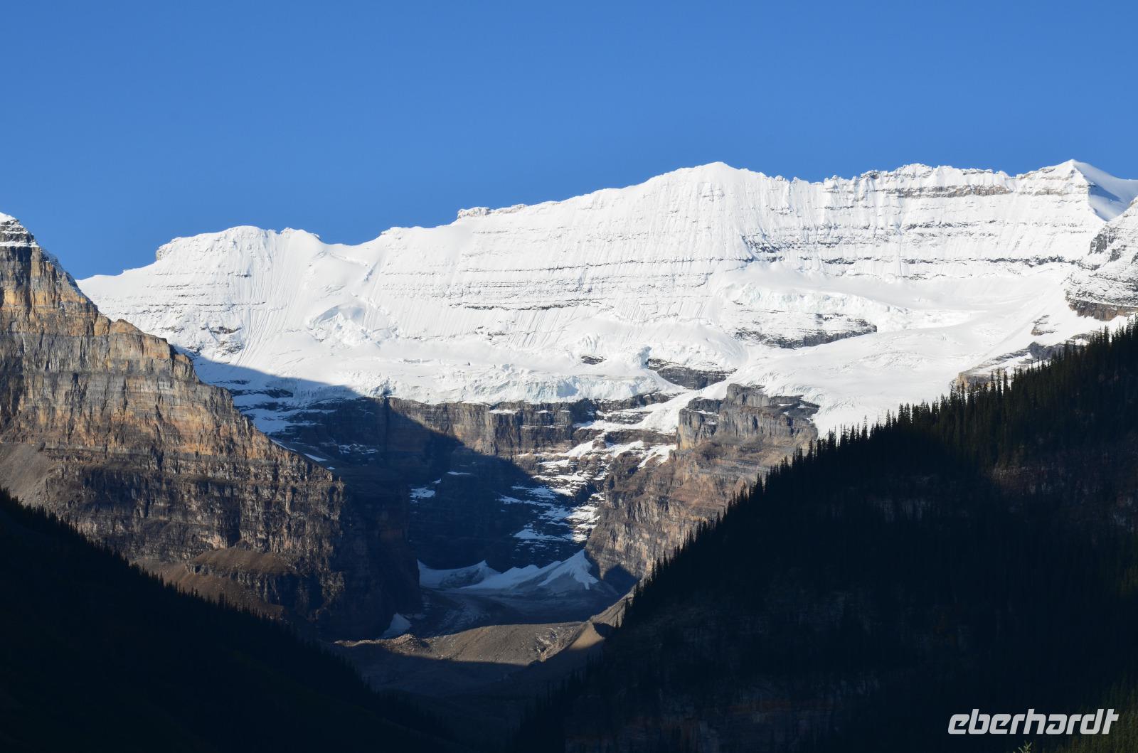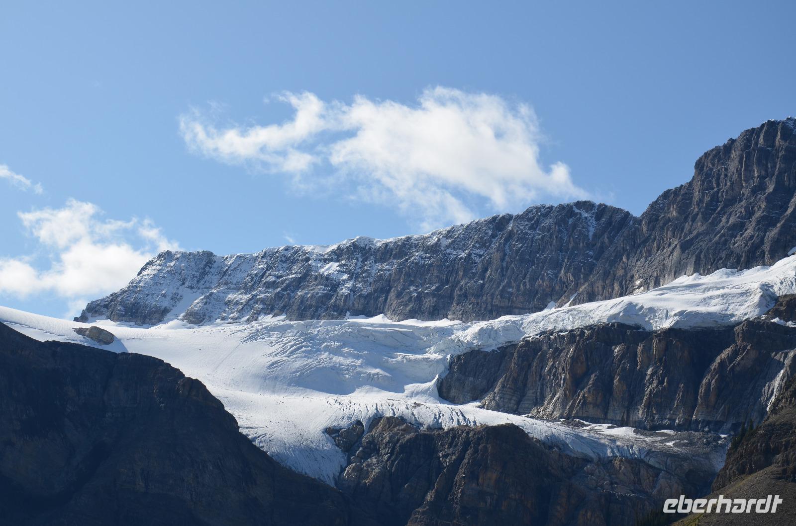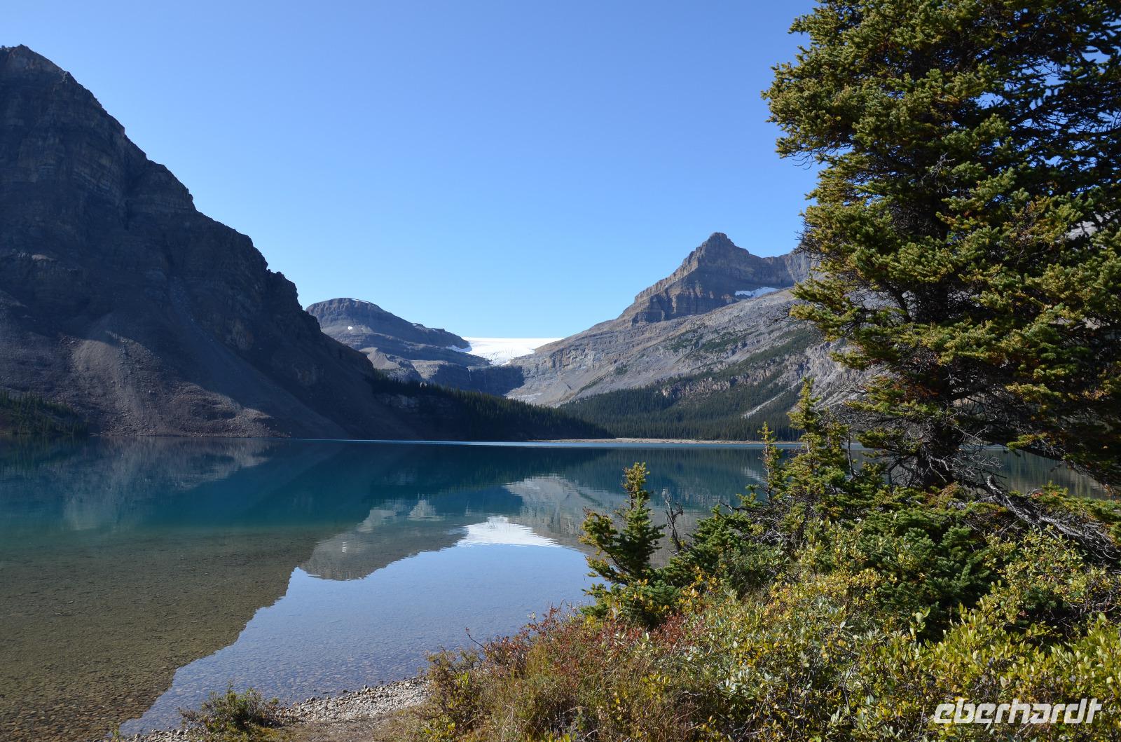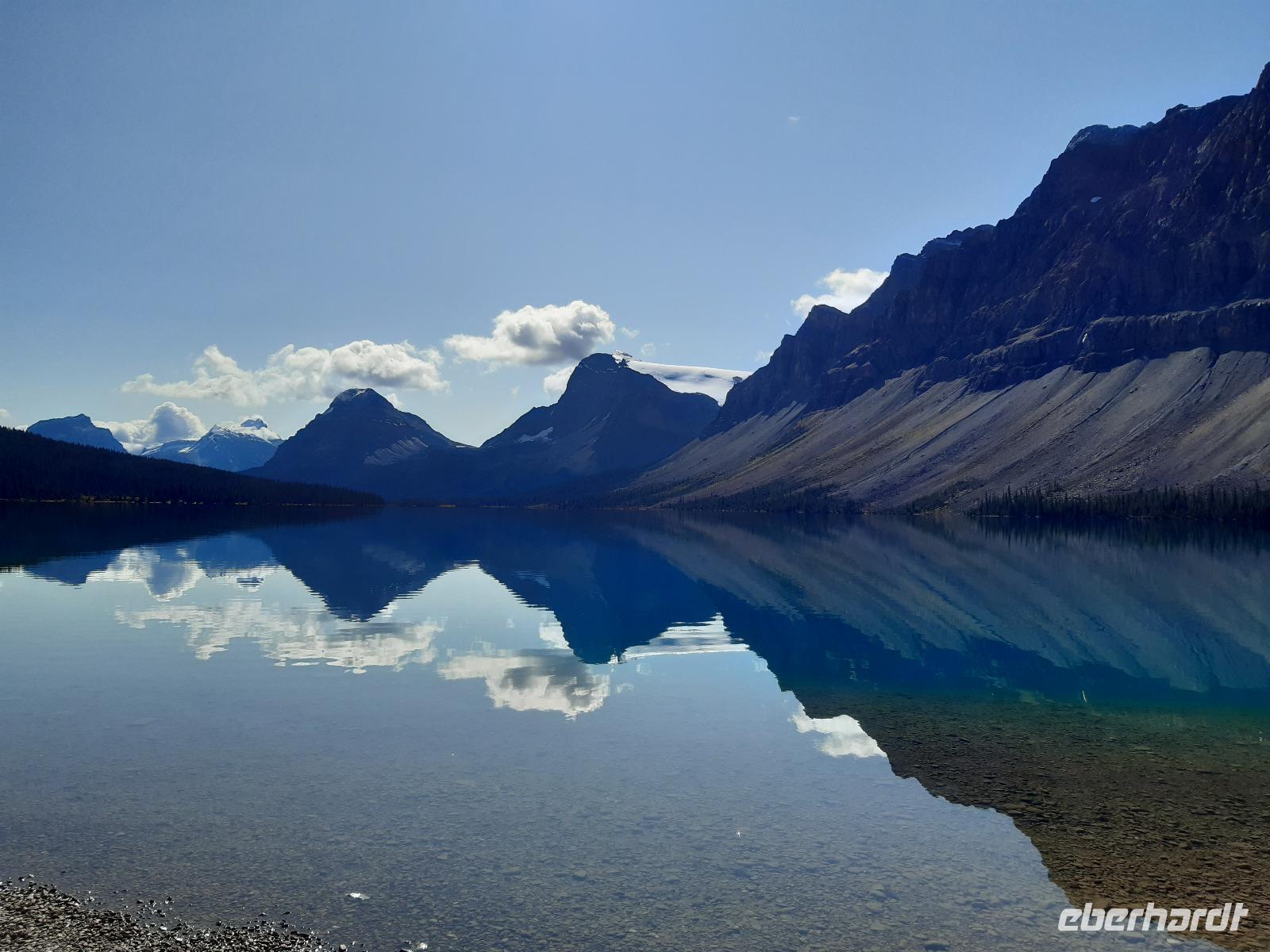 Wieder einmal fahren wir immer entlang des Bow Flusses gen Nord-Westen und passieren so auf dem „Icefields Parkway" unter anderem den „Hector Lake". Bei dieser besonderen Schönheit ist es unglaublich schade, dass wir mit unserem großen Bus von dieser Seite nicht für einen Fotostopp anhalten können. Seine intensive Färbung hat sich allerdings direkt ins Gedächtnis eingebrannt. Dafür stoppen wir am Aussichtspunkt des „Crowfoot Gletscher" (Krähenfussgletscher), welcher auch den Bow mit Schmelzwasser versorgt. In dieser Gegend sieht man unglaublich viele Gletscher verschiedener Größen und daraus resultierende Gletscherseen. Beides ehrwürdige Anblicke! Dementsprechend ist unser nächstes Ziel der wunderschöne „Bow-Lake" mit dem „Bow-Gletscher" im Hintergrund. Die Kulisse mit den emporragenden Bergen, die sich im smaragdgrünen Wasser des Gletschersees spiegeln, ist atemberaubend. Die warmen Sonnenstrahlen komplettieren das Bild dieser friedlichen Idylle. So steht man am Rande des Sees, lässt den Blick über das in der Sonne glitzernde Wasser und dem Abbild des Gletschers gleiten und befindet sich direkt in einem Postkartenmotiv. Wunderschön!