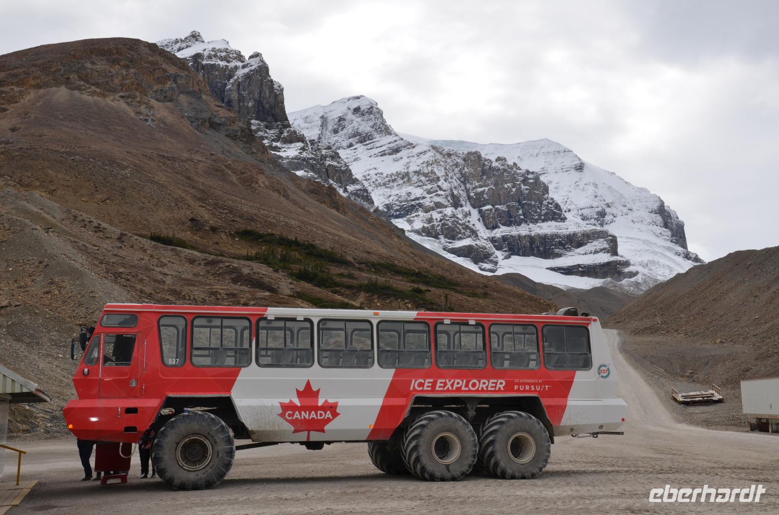 Auf dem weiteren Weg im Tal der Rocky Mountains nimmt die Laubfärbung immer intensivere Züge an und reicht von einem leuchtenden gelb bis hin zu einem glühenden rot. Im Osten des Landes waren wir vielleicht etwas zu früh dran, aber hier erleben wir jetzt unseren ganz eigenen und dadurch besonderen „Indian Summer". Zischen den steilen Felswänden kommen immer wieder kleine Wasserfälle herunter, die den Anblick dieser malerischen Landschaft komplettieren. Nachdem wir das Gletschertal des „Saskatchewan River" verlassen, genießen wir einen letzten Blick auf den 3.270 Meter hohen „Cirrus Mountain", der die Grenze zwischen dem „Banff-Nationalpark" und der „White Goat Wilderness Area" bildet. Danach geht es auf direktem Wege zu unserem heutigen Endgegner - das „Columbia Eisfeld". Hierbei handelt es sich um die größte Ansammlung von Eis südlich des Polarkreises mit einer Fläche von 325 km² und einer Dicke von 100 bis 365 Metern. Dabei ist es das Nährgebiet von insgesamt 32 talfließenden Gletschern, darunter acht Große wie der Athabasca-, der Castleguard-, der Columbia-, der Dome-, der Stutfield- und der Saskatchewan-Gletscher. In der direkten Umgebung befinden sich einige der höchsten Berge der kanadischen Rocky Mountains, die dem Bild einen majestätischen Anblick verleihen. Nach einer kurzen Erkundungstour im „Columbia-Eisfeld-Besucherzentrum" geht es auch schon hinauf auf den „Athabasca-Gletscher". Jeder so gut eingepackt wie möglich, besteigt dabei den regelrecht monströsen „Snowcoach". Von diesen 1,3 Millionen Dollar teuren Gefährten gibt es weltweit nur 24 Stück, wovon sich 22 direkt hier am Gletscher befinden. Die Fahrt dauert nur 15 Minuten und schon setzten wir Fuß auf die massiven Eismassen. Dabei ist es aus Sicherheitsgründen nur erlaubt, sich in einem abgesteckten Gebiet aufzuhalten. Da sich das Wetter zusehends verschlechtert, sind wir dafür fast allein hier oben und können in Ruhe „Eroberungsfotos" mit der deutschen Flagge machen...wenn da nicht dieser eisige Wind wäre...Somit treten wir nach 25 Minuten leicht durchgefroren den Rückweg an. Unser Bus ist allerdings nur noch zur Hälfte besetzt, da unsere chinesischen Kollegen den englischen Instruktionen anscheinend nicht ganz folgen konnten. Das Mikrofon gehört jetzt also uns und die Informationen der Anreise erklingen erneut mit meiner elfenhaften Stimme :). Nach diesem Erlebnis sind alle froh wie nie, endlich wieder im Bus zu sein und die Vorzüge der Heizung zu genießen. Als wir endlich wieder durchgewärmt sind, kommen wir auch schon in unserer heutigen Unterkunft mitten im Grünen an und werden mit einem Gläschen Sekt begrüßt. Als hätten sie unsere Gedanken gelesen! Aber das ist für heute noch nicht alles. Unter dem Schutz des Daches eines kleinen Picknicktisches mitten auf dem Gelände, findet unsere verspätete Weinverkostung statt. Es gibt Rot. Es gibt Weiß und natürlich auch Rosé. Spätestens beim dritten Gläschen merkt keiner mehr, dass er sich versehentlich unter dem schützenden Dach hinaus in den einsetzenden Regen begeben hat. Die Welt ist in Ordnung und es wird herzlich gelacht. Danach schließen wir den Tag bei einem gemeinsamen, gemütlichen Abendessen ab. Der Wein fließt und es wird der Gedanke des kollektiven Überlebenstrainings geboren, dessen Königin zwei Plätze weiter sitzt. Nach so vielen Erlebnissen werden wir heute definitiv gut schlafen!