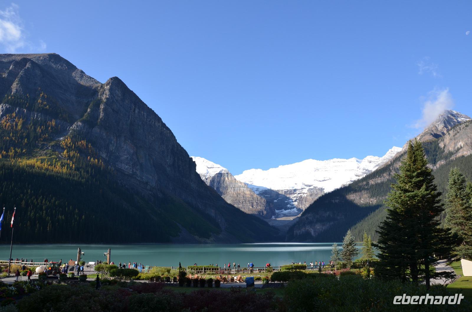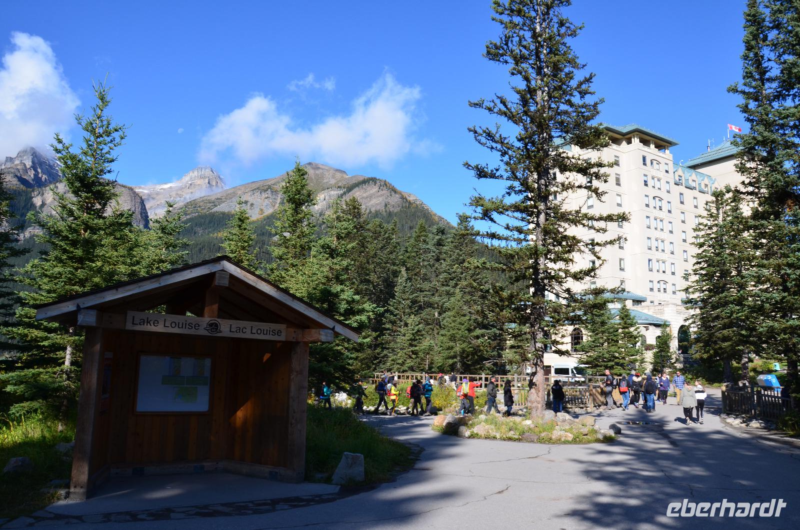 Nichtsdestotrotz „müssen" wir nebenher doch einige Besichtigungen machen. Die Erste für heute ist der bekannte und wunderschöne „Lake Louise". Wir folgen also wieder dem menschlichen Parkleitsystem, bis wir bereits von Weitem das eindrucksvolle „Fairmont Chateau Lake Louise" sichten. Die luxuriösen Eisenbahnhotels sind an den exklusivsten Standorten zu finden - so auch hier. Wir drehen also erst eine Runde durch das exklusive Hotel, wobei sich die Souvenirjäger direkt wieder abkapseln und bewundern im Anschluss den Ausblick auf den jadegrünen See mit dem Victoria Gletscher im Hintergrund. Auch dieser See befindet sich im „Banff-Nationalpark" und erhielt seinen Namen zu Ehren der naturverbundenen Tochter von Königin Victoria - Prinzessin Louise Caronline Alberta.