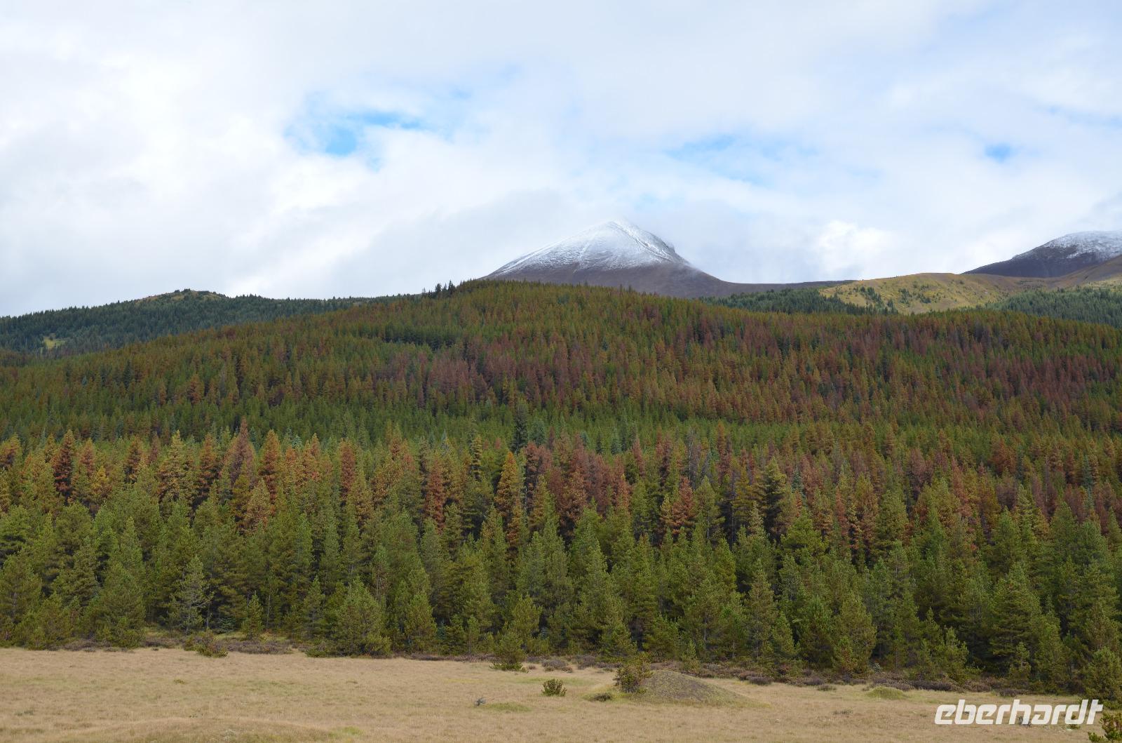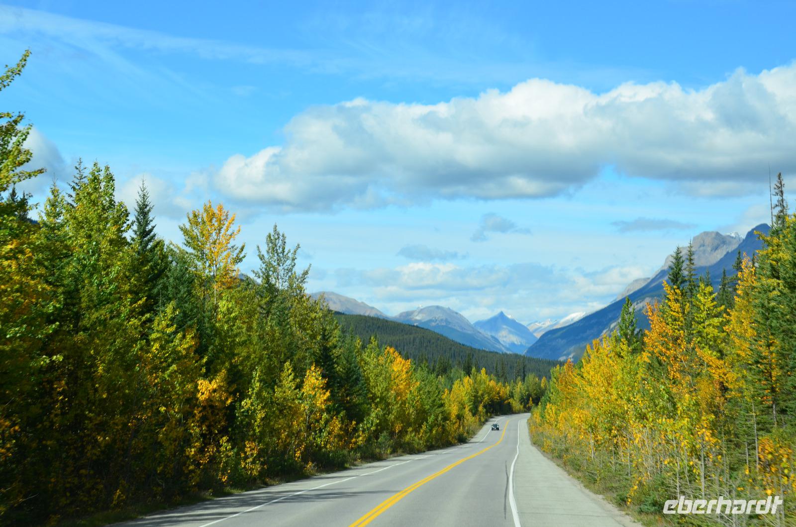 Heute geht es wieder hoch her. Aber wir sind nichts anderes gewohnt und brauchen den ständigen Input wie die Luft zum Atmen! Nach einem reichlichen Frühstück geht es auf zu den „Athabasca-Fällen". Dabei sind wir stetig wachsam und auf der Hut, ob sich irgendwo ein Wildtier sichten lässt. Mit unserem indianischen Fahrer Dave sind wir dabei regelrecht gesegnet, da er aus dem fahrenden Bus Fährten liest und alles erspäht, was neben der Straße kreucht und fleucht. Es kann also nur eine Frage der Zeit sein! Als positiver Nebeneffekt bauen wir die Fähigkeit aus, uns in Geduld zu üben. Nicht sonderlich einfach, aber erforderlich. Auf dem Weg zu den Wasserfällen fallen immer wieder die rötlich schimmernden Waldgebiete auf, die immer großflächiger werden. Da es sich in das herbstliche Bild der Natur perfekt einfügt, ist nicht gleich ersichtlich, dass dies für Nadelbäume unüblich ist. Der Borkenkäferbefall ist hier ein riesiges Problem und die Ausbreitung dieses Schädlings ist rasant fortschreitend. Bald werden die Bäume ihre Nadeln gänzlich verlieren und als nackte, tote Baumstämme empor ragen. Ein trauriger Anblick, der uns ein wenig später erwartet. Die Natur schreibt allerdings ihre eigenen Gesetze und wird sich auch hier irgendwie zu helfen wissen. Ein probates Mittel sind Waldbrände und diese sind in dieser Gegend nicht unbekannt.