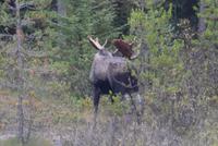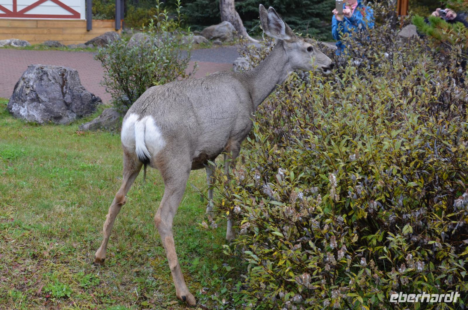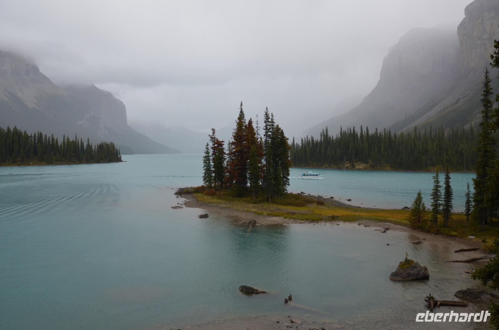 Als wir bereit sind, in See zu stechen, hat es gerade wieder angefangen zu regnen. Somit machen wir es uns im Inneren des Boots gemütlich und lauschen den gemachten Ausführungen bezüglich des Sees und seiner Umgebung. Der „böse See" hat eine Gesamtoberfläche von 20 km² und eine Uferlänge von 45 km. Da er reich an natriumhaltigen Wasserpflanzen ist, sind die Ufergebiete zusätzlich beliebte Äsflächen von Elchen. Dabei sind diese Huftiere nicht nur hervorragende Schwimmer, sondern können auch bis zu 6 Meter tief tauchen. Bei der gehörigen Masse, die ein Elch mit sich bringt, ist dies kaum vorstellbar. Zur Brunftzeit, in der wir uns gerade befinden, ernten die Elchbullen die Wasserpflanzen bevorzugt mit ihrem riesigen Schaufelgeweih und versuchen so den Elchkühen zu imponieren. Und so interessant diese Fakten sind, so schade ist es, dass wir dies nicht mit eigenen Augen erleben können. Beim nächsten Mal dann! Wir nehmen direkten Kurs zur Hauptattraktion des Sees - „Spirit Island", der Geisterinsel. Aufgrund des Wasserstands des Sees handelt es sich hierbei die meiste Zeit des Jahres allerdings um eine Halbinsel, die wenig spektakulär wirkt. Nichtsdestotrotz zählt auch sie zu den meist fotografierten Motiven ganz Kanadas. Ihren Namen erhielt sie durch eine Legende der örtlichen Ureinwohner, in der ein Liebespaar verfeindeter Stämme hier seinen geheimen Treffpunkt hatte, bis ihre Liaison entdeckt und verboten wurde. Er kehrte bis an sein Lebensende zurück auf die Insel und fand hier schlussendlich den Tod. Sein Geist wandelt bis heute unruhig umher und wartet auf die Rückkehr seiner Liebsten. So schön das alles klingt, so schwer fällt gerade der Regen, weswegen wir den kleinen Rundpfad mit Blick auf die Halbinsel in einer Rekordzeit zurück legen. Gerade als unser Boot wieder ablegt, kommt die Sonne heraus und zeigt uns unübersehbar die Faszination um die Schönheit von „Spirit Island". Als wir wieder am Steg anlanden, werden wir von einem grasenden Maultierhirsch empfangen. Die vielen Paparazzi stürzen sich regelrecht auf das arme Tier. Um ehrlich zu sein, gehören wir auch dazu...Der Schutz der Wildtiere wird hier allerdings groß geschrieben und schon ist ein Mitarbeiter vor Ort, der uns bittet, den nötigen Abstand zu halten. Wir waren natürlich so und so gerade am Gehen :). Da Elche, wenn sie gute Futtergründe gefunden haben, erst weiterziehen, wenn diese erloschen sind und wir von Dave erfahren haben, dass hier eine Elchkuh mit ihrem zweijährigen Kalb lebt, gehen wir vor Abfahrt auf eine kurze, abenteuerliche Expedition durch den Wald. Der Wald ist an dieser Stelle von vielen kleinen Wanderwegen durchzogen, die alle zum Ufer des Sees führen und somit zum begehrten Grünfutter. Als der Elchtrupp loszieht, ist die erste Herausforderung, dass ausnahmsweise absolute Stille herrschen muss. Wir wollen das scheue Tier schließlich nicht von vornherein verschrecken.
