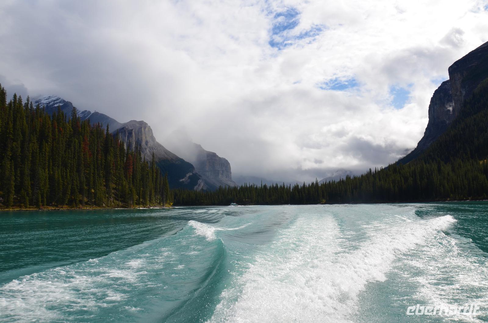 Wir schlängeln uns weiter im Tal entlang vorbei am „Medicine Lake" und nehmen direkten Kurs auf den „Maligne Lake", unserem heutigen Ausflugsziel. Dabei werden wir die ganze Zeit vom Maligne Fluss begleitet, der zu Teilen unterirdisch fließt. Die Alarmbereitschaft im Bus ist auf dieser Strecke besonders hoch, da wir vorsensibilisiert wurden, dass Sichtungen von Wildtieren hier besonders wahrscheinlich sind. Und dann passiert es! Vor uns auf der Straße sehen wir zahlreiche Autos mit Warnblinkern stehen. Der Weg wird zusehends blockiert und mehr und mehr Menschen strömen hinaus an den Straßenrand, um sich bestmöglich zu platzieren. Leider befinden wir uns in der Schlange weit hinten, sodass wir das Geschehen nur aus der Ferne verfolgen können und nach wie vor keine Ahnung haben, was genau gesichtet wurde. Aber nicht mit Dave! Mit einer Leichtigkeit steuert er unseren Bus auf die Gegenfahrbahn, blockiert somit gekonnt die gesamte Straße und fährt an der Kolonne wartender Fahrzeuge vorbei. Sein Heldenmut wird prompt belohnt, da direkt am Straßenrand ein unruhiger Elchbulle zu sehen ist, der sich durch die Menschenmassen verunsichert in den Wald zurück zieht. Zu unserem Glück können wir ihn allerdings zuvor noch in seiner vollen Pracht sehen. Die Aufregung im Bus ist immens und Dave wird wie ein Held mit lauten Namensrufen und einem schallenden Applaus gefeiert. Dies wird übrigens in Zukunft noch des Öfteren passieren :). Weiter geht es zum „Maligne Lake". Da es regnet, nutzen wir die Zeit bis zu unserer 1,5 stündigen Bootsfahrt, um uns frische Waffeln zu gönnen oder etwas die Gegend zu erkunden. Heute herrscht das perfekte Aprilwetter, wobei sich Sonne und Regen stetig abwechseln. In dieser frischen, grünen Natur erweckt der niederfallende Regen die Pflanzenwelt unter den Strahlen der Sonne zu neuem Leben und bringt sie regelrecht zum Strahlen und Funkeln - ein Farbenspiel der besonderen Art!