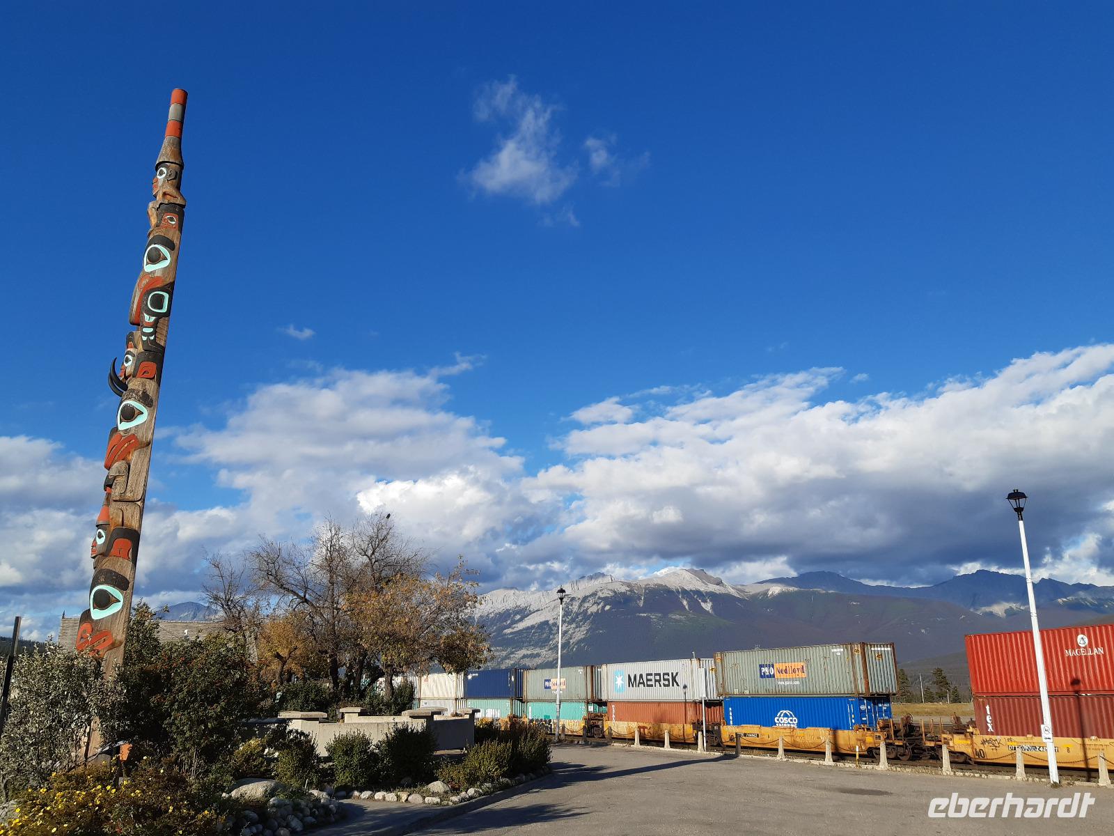 Bei einem Toilettenstopp in Jasper, einem ehemaligen Handelsposten der Hudson's Bay Company, nutzen wir gleich die Zeit, um uns zusätzlich den anschaulich bemalten Totempfahl der Stadt anzuschauen. Dieses heutige Identitätssymbol der indigenen Völker wird uns bis ans Ende der Reise immer wieder begegnen.
