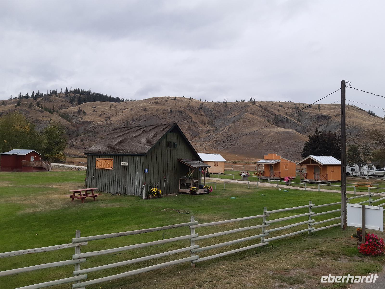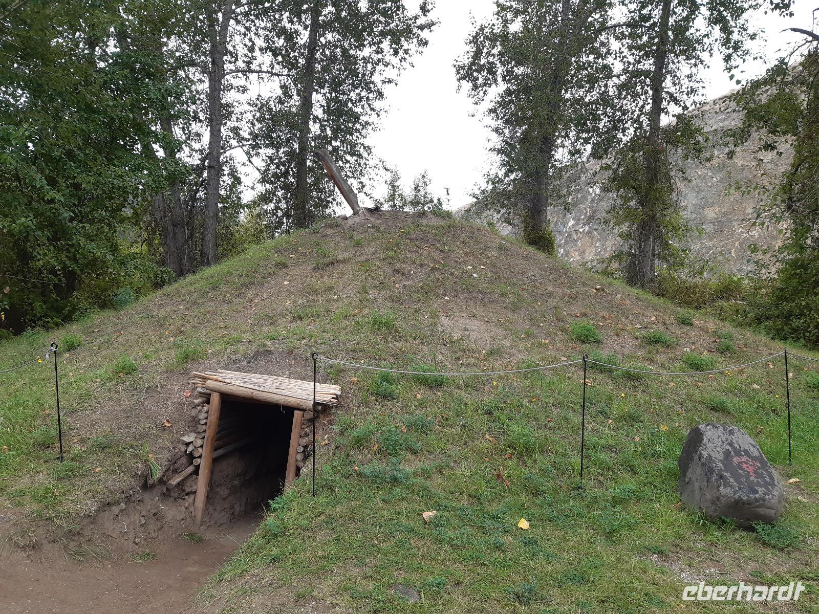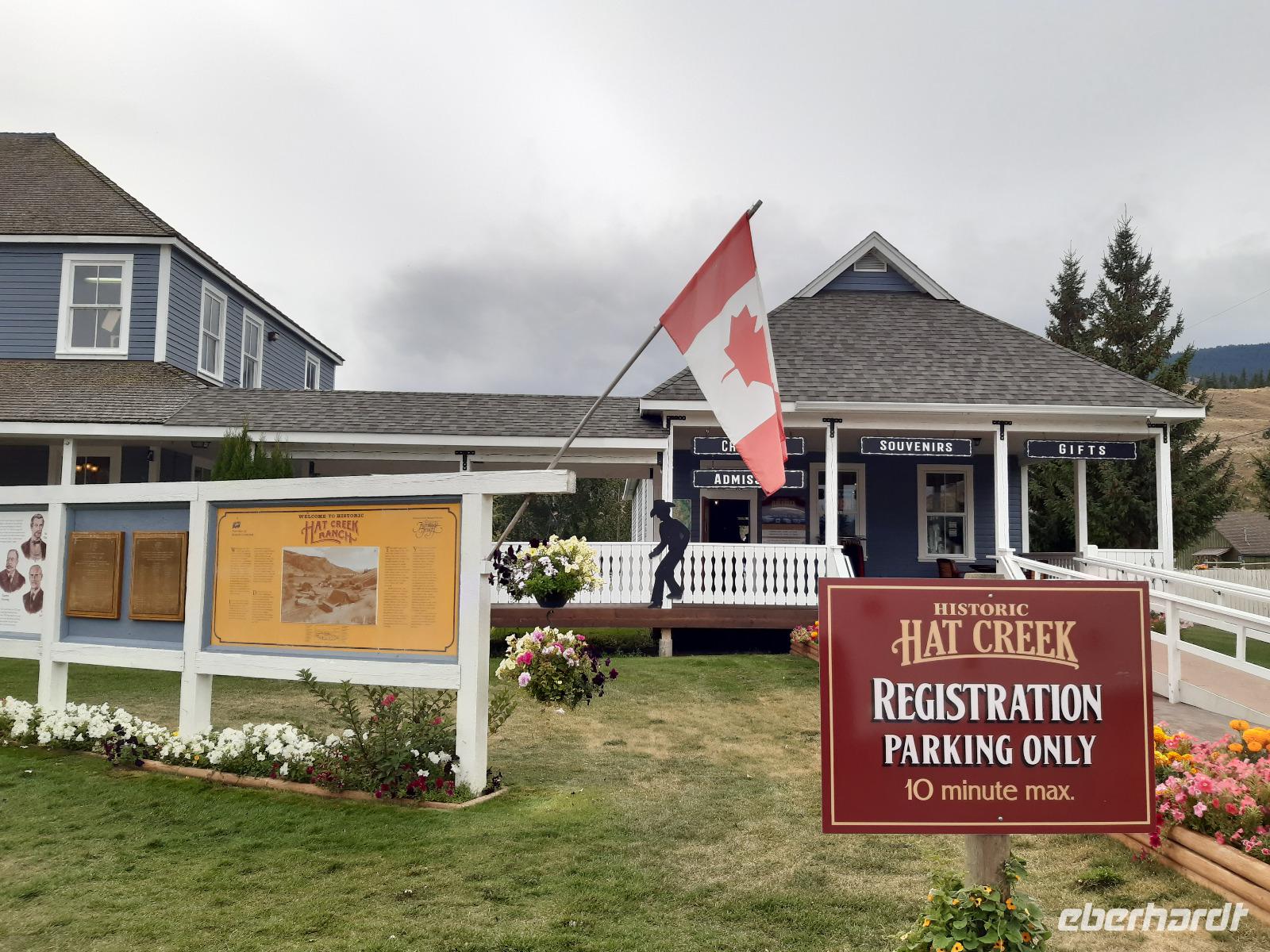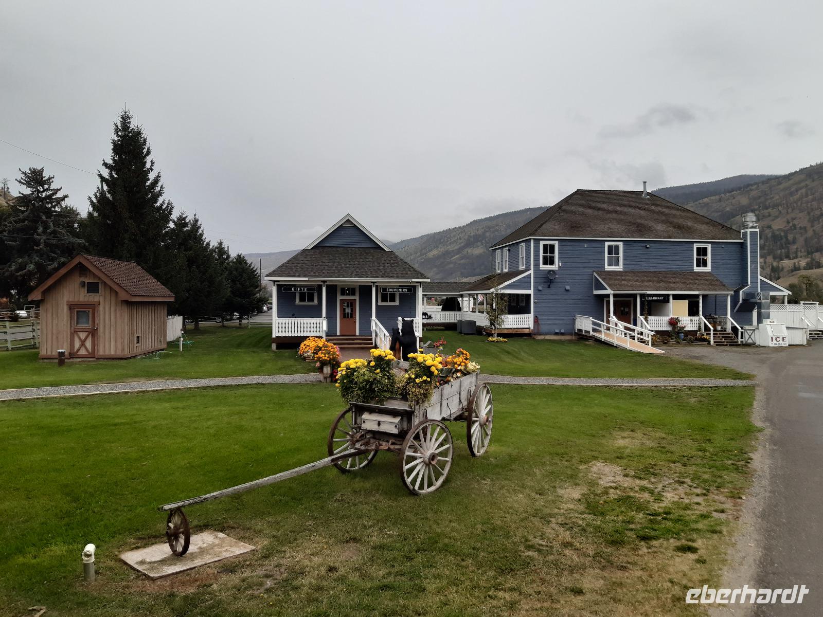 Pünktlich zur Mittagszeit trudeln wir in der historisch wertvollen „Hat Creek Ranch" ein. Dabei werden wir direkt vor dem mit Blumen übersäten Haupthaus von der Rancherin selbst begrüßt, die den ersten Teil der Führung durch den Hof übernimmt. Wer möchte, kann den ersten Weg mit Jim und Jake in einer alten Kutsche zurück legen. Die zwei besagten Pfundskerle sind dabei die Kutschpferde. Im Farmhaus lauschen wir erst gebannt den Ausführungen über die Zeit des Goldrausches, wo übrigens auch Elche und Kamele als Arbeitstiere mit eingespannt wurden, und begeben uns dann auf einen Rundgang durch das altehrwürdige Haus. Im Saloon sind noch die Spieltische aufgebaut, nebst der großen Bar. Dies war eine reine Männerdomäne, in der nur zu Weilen Tänzerinnen erlaubt waren. Im Obergeschoss des Hauses sind verschiedene Schlafräume eingerichtet, die gut erahnen lassen, wie verschiedene Personengruppen auf Reisen ausgestattet waren. Interessant ist auch die Küche, in der sich eine Glühbirne befindet, die seit bereits 30 Jahren brennt. Dabei ist das Geheimnis ihrer Langlebigkeit, den Stromfluss niemals zu unterbrechen. Die Farmerin erzählt uns allerdings, dass dieses Haus erst vor kurzem von einem Stromausfall betroffen war. Bei uns brennt das Licht jedenfalls noch. Im Anschluss begeben wir uns zu Fuß oder zu Pferd zu einem nachempfundenen Indianerdorf der Shuswap Indianer, die insgesamt 17 Stämme vereinen. Unter der erfahrenen Anleitung von Marc betreten wir ein „Pit-House", eine Familienwohnstätte für bis zu 25 Personen. Die Wohnfläche befindet sich dabei zwei Meter unter der Erde und ragt fünf Meter empor. In der Mitte des geräumigen, mit Holzstämmen gestützten Baus befindet sich der Feuerplatz, um den sich die Schlafplätze reihen. Dabei fungiert Tannenreißig als Unterlage und Fälle dienen als Decken. Eine wirklich faszinierende Konstruktion, deren Errichtung bis zu sechs Monate dauern kann - je nach Familiengröße und somit Arbeitskräften. Von außen wirkt der Bau wie ein riesiger Erdhügel. Als wir uns zusätzlich den natürlichen Räucherofen und die verschiedenen Lagerkammern angeschaut haben, zieht uns der Hunger zurück ins Haupthaus. Wir bedanken uns für eine informative und spannende Führung über die Ranch! Als Belohnung für unsere Ausdauer, gibt es zum Mittagessen langsam im Ofen gegartes Alberta-Rind, mit gedünstetem Gemüse, Kartoffelbrei und Bratensoße. Ein wahres Gedicht! Nachdem zu allerletzt auch noch der Souvenirladen gestürmt wird, ist unser Besuch hier offiziell ein Erfolg auf ganzer Linie!