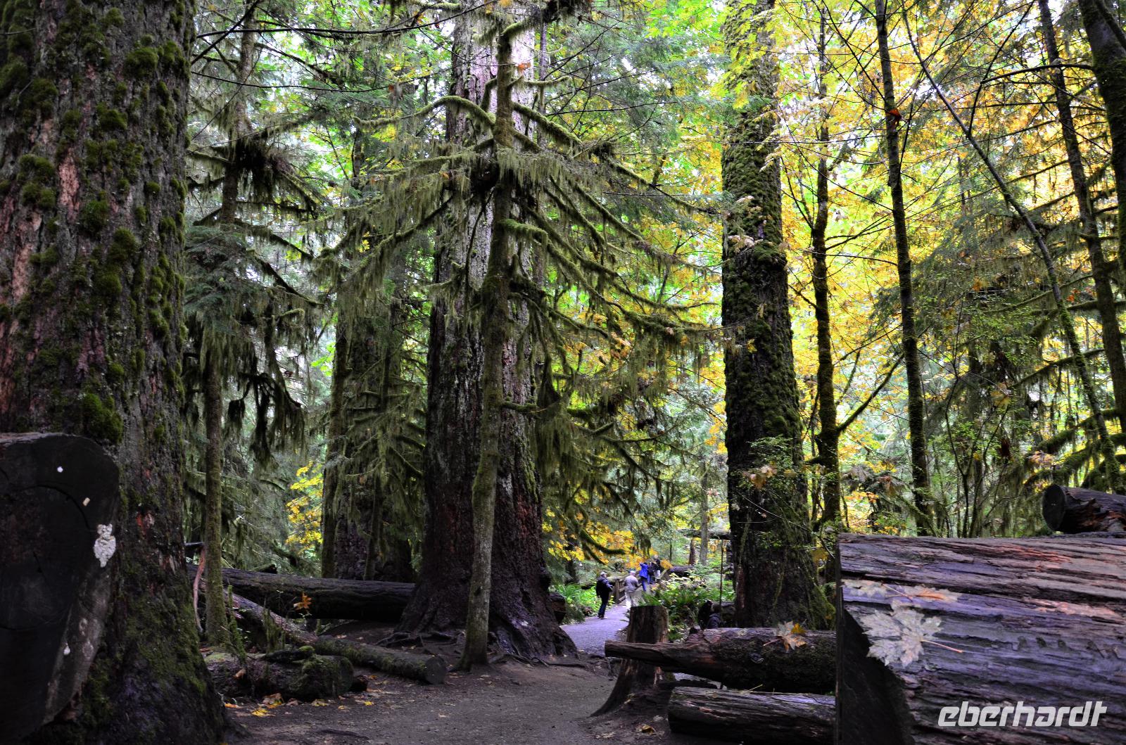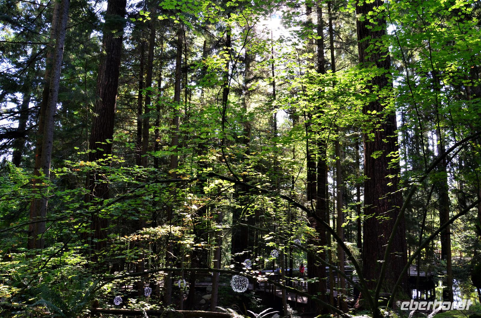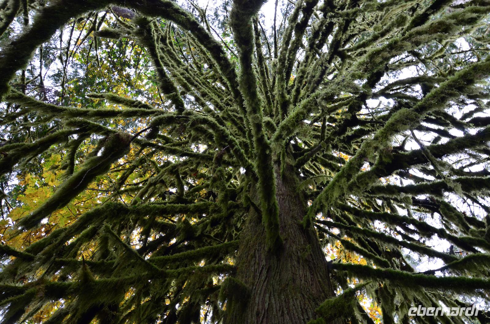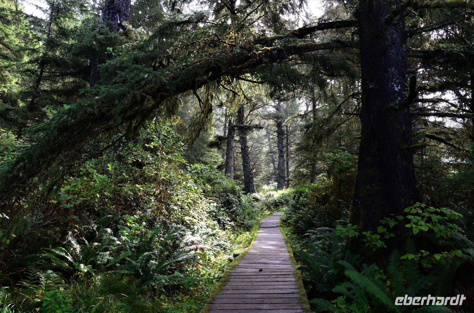 Heute starten wir ein kleinwenig zeitiger in unseren Tag, da wir unsere Fähre erreichen wollen. Auf dem „Sea-to-Sky Highway" fahren wir direkt gen Himmel. Leider sind dessen Schleusen heute wieder vollends geöffnet und es will einfach nicht aufhören zu regnen. Gut, dass dies ein weiterer Transfertag ist, an dem wir große Strecken im Bus zurück legen. Nach knapp zwei Stunden Fahrt entlang des saftigen Grüns der Täler und Berge kommen wir im Fährhafen der „Horseshoe Bay" an. Wie durch ein Wunder, darf unser Bus zwei lange Warteschlangen von Autos passieren und reiht sich ganz vorn mit ein. Es war wohl die Magie des pinken Kärtchens, welches uns zuvor ausgehändigt wurde. Auf der Fähre hat bei Zeiten jeder seinen Platz gefunden. Da es nach wie vor regnet, halten sich die meisten im Inneren des Schiffes auf und betrachten träumerisch die dargebotene Landschaft. Nach zwei Stunden im Bus sind wir nach wie vor im Zen-Modus - sprich ruhig, ausgeglichen und leicht verschlafen :). Auf Vancouver Island in Nanaimo angekommen, wechseln wir alsbald vom „Inland Island Highway" auf den „Alberni Highway" und folgen immer weiter der gewundenen Straße gen Westen. Mit einer Länge von 450 km und einer Breite von 100 km ist Vancouver Island die größte Pazifikinsel Nordamerikas, allerdings nur die elftgrößte Insel Kanadas. Besonders ist die Insel durch ihr gemäßigtes Klima und den damit verbunden Artenreichtum von Pflanzen und Tieren. Ein Phänomen schauen wir uns direkt auf unserem Weg nach Tofino an. Hier gibt es noch große, zusammenhängende Gebiete Küstenregenwalds. Und wie lässt sich ein Regenwald authentischer erleben als bei Regen! Im „Mac Millan Provincial Park", oder auch auf der Insel als „Cathedral Grove" bekannt, angekommen, bereiten wir uns vorerst intensiv auf die bestehenden Wetterverhältnisse vor. Vielleicht habe ich es dabei etwas übertrieben... Aber immerhin sieht man mich in meinem roten Regencape der Niagara-Fälle von Weitem leuchten. Im Endeffekt stellen sich die Vorkehrungen als überflüssig heraus, da es mit der Sekunde, in der wir den Bus verlassen, aufhört zu regnen. Was wir wirklich gebraucht hätten, sind allerdings Gummistiefel. Der Pfad durch den Park ist teils regelrecht abenteuerlich und bietet zahlreiche Schlammbäder, die nur darauf warten, dass der Erste hinein fällt. Zum Leidwesen unseres Busfahrers, kommen wir leicht verdreckt wieder. Aber immerhin nur bis maximal zu den Knien. Der Aufwand hat sich jedenfalls mehr als gelohnt. Im Park befinden sich große Bestände an bis zu 800 Jahre alten Douglastannen, die einen Umfang von bis zu neun Metern erreichen können. Die teils völlig mit Moos bewachsenen Baumriesen eröffnen uns einen regelrechten Märchenwald, der einen völlig in seinen Bann zieht. Im Nachhinein ist dies etwas, was Kanada auszeichnet - seine vielen und auch vielfältigen Märchenwälder, in denen man sich in eine andere Zeit zurück versetzt fühlt.