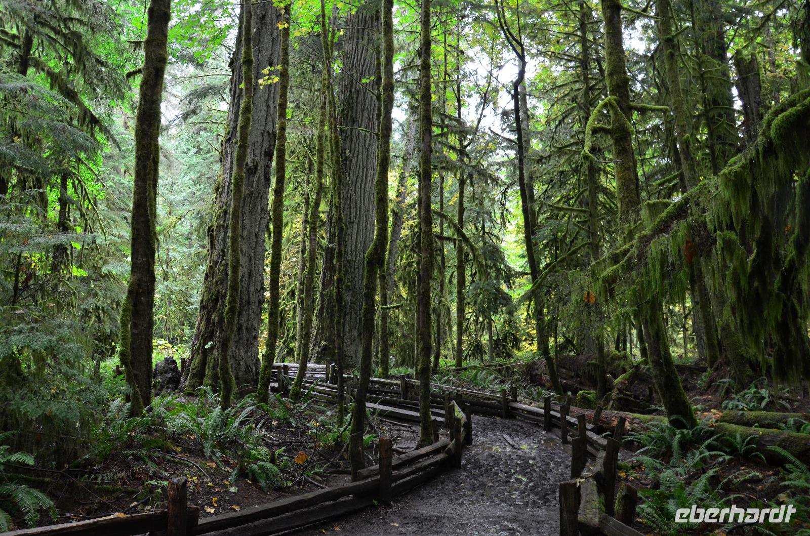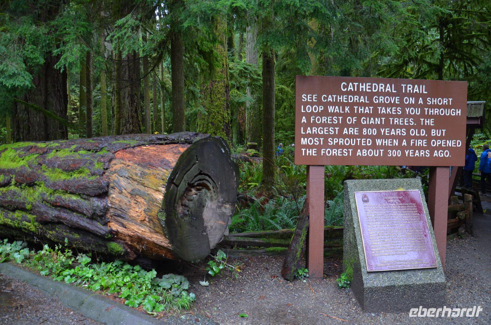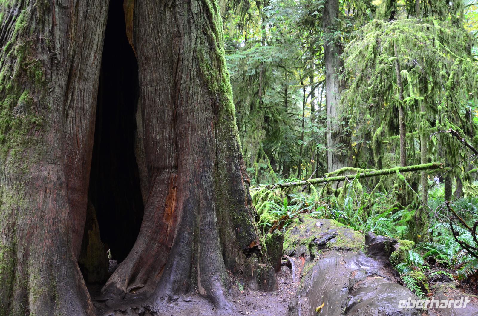 Heute starten wir ein kleinwenig zeitiger in unseren Tag, da wir unsere Fähre erreichen wollen. Auf dem „Sea-to-Sky Highway" fahren wir direkt gen Himmel. Leider sind dessen Schleusen heute wieder vollends geöffnet und es will einfach nicht aufhören zu regnen. Gut, dass dies ein weiterer Transfertag ist, an dem wir große Strecken im Bus zurück legen. Nach knapp zwei Stunden Fahrt entlang des saftigen Grüns der Täler und Berge kommen wir im Fährhafen der „Horseshoe Bay" an. Wie durch ein Wunder, darf unser Bus zwei lange Warteschlangen von Autos passieren und reiht sich ganz vorn mit ein. Es war wohl die Magie des pinken Kärtchens, welches uns zuvor ausgehändigt wurde. Auf der Fähre hat bei Zeiten jeder seinen Platz gefunden. Da es nach wie vor regnet, halten sich die meisten im Inneren des Schiffes auf und betrachten träumerisch die dargebotene Landschaft. Nach zwei Stunden im Bus sind wir nach wie vor im Zen-Modus - sprich ruhig, ausgeglichen und leicht verschlafen :). Auf Vancouver Island in Nanaimo angekommen, wechseln wir alsbald vom „Inland Island Highway" auf den „Alberni Highway" und folgen immer weiter der gewundenen Straße gen Westen. Mit einer Länge von 450 km und einer Breite von 100 km ist Vancouver Island die größte Pazifikinsel Nordamerikas, allerdings nur die elftgrößte Insel Kanadas. Besonders ist die Insel durch ihr gemäßigtes Klima und den damit verbunden Artenreichtum von Pflanzen und Tieren. Ein Phänomen schauen wir uns direkt auf unserem Weg nach Tofino an. Hier gibt es noch große, zusammenhängende Gebiete Küstenregenwalds. Und wie lässt sich ein Regenwald authentischer erleben als bei Regen! Im „Mac Millan Provincial Park", oder auch auf der Insel als „Cathedral Grove" bekannt, angekommen, bereiten wir uns vorerst intensiv auf die bestehenden Wetterverhältnisse vor. Vielleicht habe ich es dabei etwas übertrieben... Aber immerhin sieht man mich in meinem roten Regencape der Niagara-Fälle von Weitem leuchten. Im Endeffekt stellen sich die Vorkehrungen als überflüssig heraus, da es mit der Sekunde, in der wir den Bus verlassen, aufhört zu regnen. Was wir wirklich gebraucht hätten, sind allerdings Gummistiefel. Der Pfad durch den Park ist teils regelrecht abenteuerlich und bietet zahlreiche Schlammbäder, die nur darauf warten, dass der Erste hinein fällt. Zum Leidwesen unseres Busfahrers, kommen wir leicht verdreckt wieder. Aber immerhin nur bis maximal zu den Knien. Der Aufwand hat sich jedenfalls mehr als gelohnt. Im Park befinden sich große Bestände an bis zu 800 Jahre alten Douglastannen, die einen Umfang von bis zu neun Metern erreichen können. Die teils völlig mit Moos bewachsenen Baumriesen eröffnen uns einen regelrechten Märchenwald, der einen völlig in seinen Bann zieht. Im Nachhinein ist dies etwas, was Kanada auszeichnet - seine vielen und auch vielfältigen Märchenwälder, in denen man sich in eine andere Zeit zurück versetzt fühlt.