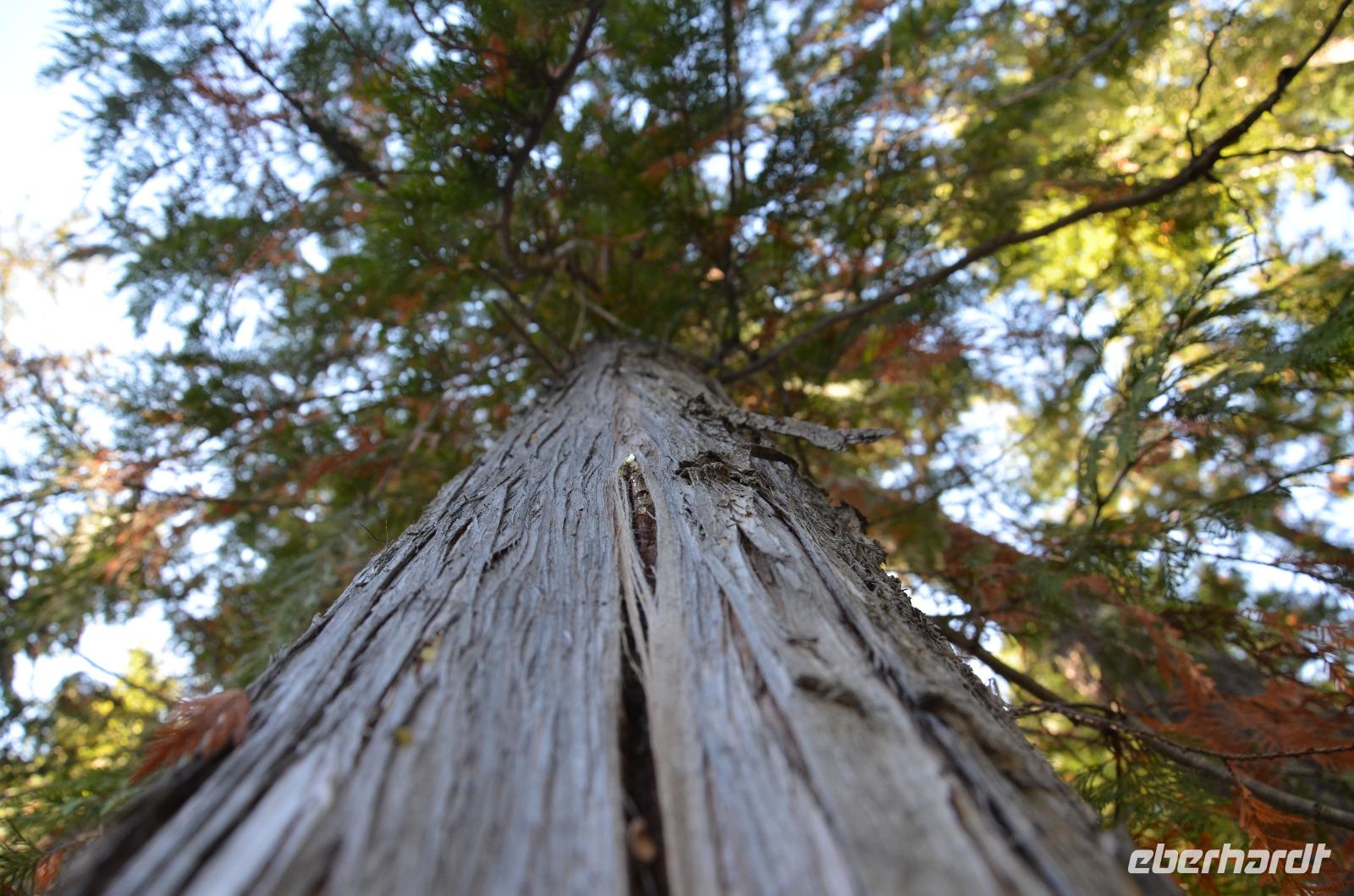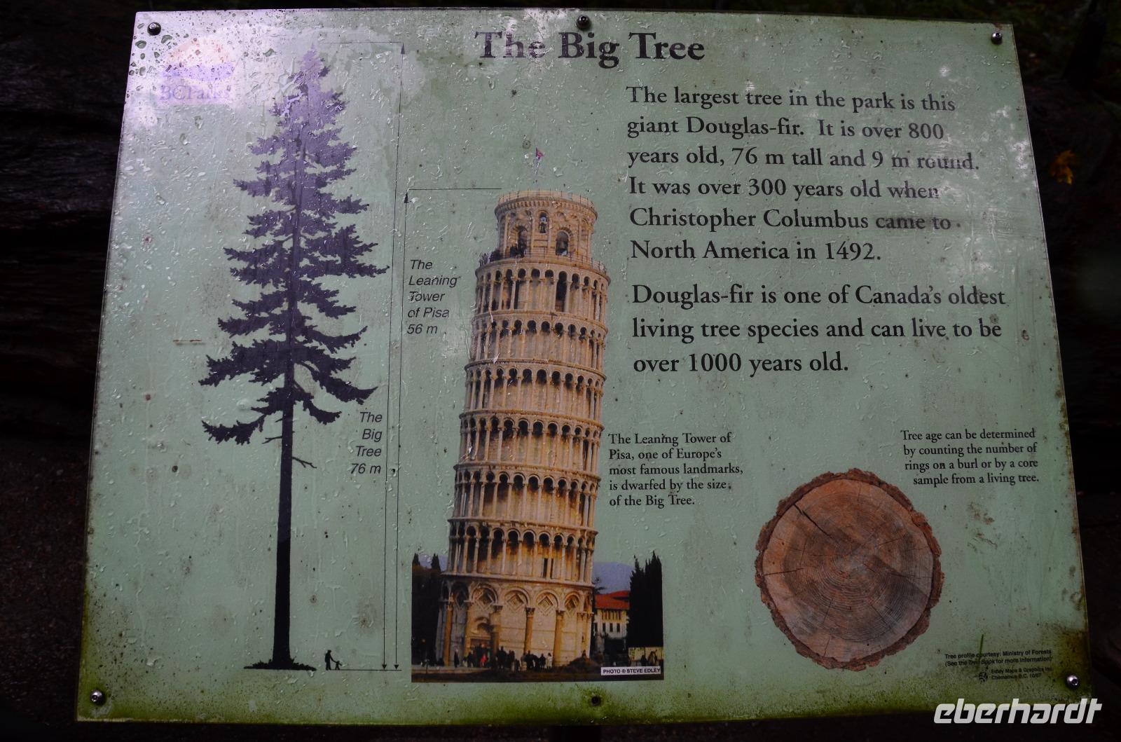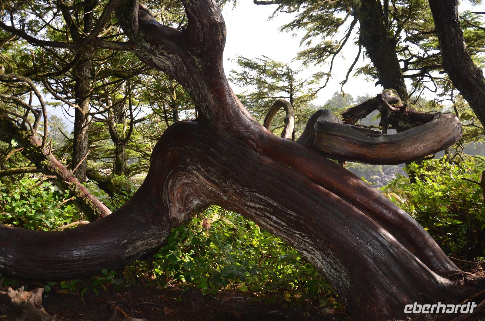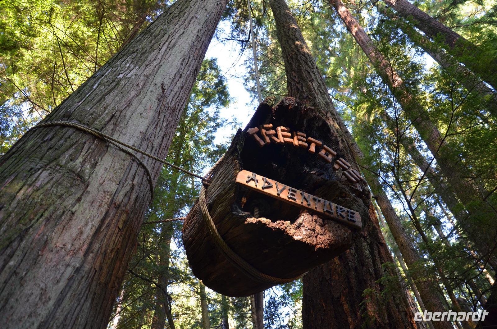 Heute starten wir ein kleinwenig zeitiger in unseren Tag, da wir unsere Fähre erreichen wollen. Auf dem „Sea-to-Sky Highway" fahren wir direkt gen Himmel. Leider sind dessen Schleusen heute wieder vollends geöffnet und es will einfach nicht aufhören zu regnen. Gut, dass dies ein weiterer Transfertag ist, an dem wir große Strecken im Bus zurück legen. Nach knapp zwei Stunden Fahrt entlang des saftigen Grüns der Täler und Berge kommen wir im Fährhafen der „Horseshoe Bay" an. Wie durch ein Wunder, darf unser Bus zwei lange Warteschlangen von Autos passieren und reiht sich ganz vorn mit ein. Es war wohl die Magie des pinken Kärtchens, welches uns zuvor ausgehändigt wurde. Auf der Fähre hat bei Zeiten jeder seinen Platz gefunden. Da es nach wie vor regnet, halten sich die meisten im Inneren des Schiffes auf und betrachten träumerisch die dargebotene Landschaft. Nach zwei Stunden im Bus sind wir nach wie vor im Zen-Modus - sprich ruhig, ausgeglichen und leicht verschlafen :). Auf Vancouver Island in Nanaimo angekommen, wechseln wir alsbald vom „Inland Island Highway" auf den „Alberni Highway" und folgen immer weiter der gewundenen Straße gen Westen. Mit einer Länge von 450 km und einer Breite von 100 km ist Vancouver Island die größte Pazifikinsel Nordamerikas, allerdings nur die elftgrößte Insel Kanadas. Besonders ist die Insel durch ihr gemäßigtes Klima und den damit verbunden Artenreichtum von Pflanzen und Tieren. Ein Phänomen schauen wir uns direkt auf unserem Weg nach Tofino an. Hier gibt es noch große, zusammenhängende Gebiete Küstenregenwalds. Und wie lässt sich ein Regenwald authentischer erleben als bei Regen! Im „Mac Millan Provincial Park", oder auch auf der Insel als „Cathedral Grove" bekannt, angekommen, bereiten wir uns vorerst intensiv auf die bestehenden Wetterverhältnisse vor. Vielleicht habe ich es dabei etwas übertrieben... Aber immerhin sieht man mich in meinem roten Regencape der Niagara-Fälle von Weitem leuchten. Im Endeffekt stellen sich die Vorkehrungen als überflüssig heraus, da es mit der Sekunde, in der wir den Bus verlassen, aufhört zu regnen. Was wir wirklich gebraucht hätten, sind allerdings Gummistiefel. Der Pfad durch den Park ist teils regelrecht abenteuerlich und bietet zahlreiche Schlammbäder, die nur darauf warten, dass der Erste hinein fällt. Zum Leidwesen unseres Busfahrers, kommen wir leicht verdreckt wieder. Aber immerhin nur bis maximal zu den Knien. Der Aufwand hat sich jedenfalls mehr als gelohnt. Im Park befinden sich große Bestände an bis zu 800 Jahre alten Douglastannen, die einen Umfang von bis zu neun Metern erreichen können. Die teils völlig mit Moos bewachsenen Baumriesen eröffnen uns einen regelrechten Märchenwald, der einen völlig in seinen Bann zieht. Im Nachhinein ist dies etwas, was Kanada auszeichnet - seine vielen und auch vielfältigen Märchenwälder, in denen man sich in eine andere Zeit zurück versetzt fühlt.