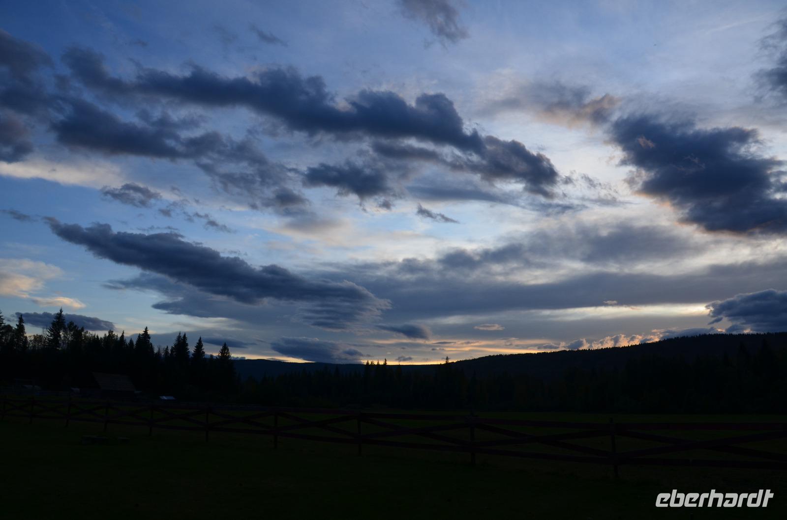 Auf dem Weg dahin passiert allerdings erst das langersehnte Wunder! Die Straße zieht sich durch ausladende, grüne Weideflächen und immer wieder reiht sich ein Farmhaus dazwischen. Im Augenwinkel sehe ich im Vorbeifahren drei dicke, schwarze Figuren, die sich auf einer der Wiesen befinden. Zögerlich schlage ich Alarm. Schließlich könnte es sich hier auch um Weidetiere handeln. Dann kommt Dave zum Einsatz. Der Bus wird direkt gestoppt und wir setzen den gesamten Weg langsam zurück. Alle kleben gespannt an der Scheibe, bis wir endlich Gewissheit haben. Auf der Wiese entdecken wir eine Schwarzbärenmutter mit ihren zwei Jungen, die seelenruhig auf Futtersuche sind. Obwohl sie uns trotz der Distanz bemerken, lassen sie sich nicht stören. Was für ein Anblick!!!! Nach einer reichlichen viertel Stunde, die wir die schmale Straße blockieren, fahren wir schweren Herzens weiter. Unser Sheriff hat gesprochen und daran müssen wir uns halten. Dieses Erlebnis kann uns aber keiner mehr nehmen. Nun fehlt uns zu unserem Glück nur noch ein Grizzly. Mit der untergehenden Sonne steuern wir unser letztes Ziel für heute an - die „Dawson Falls". Auch hierbei handelt es sich, wie der Name schon erahnen lässt, um einen Wasserfall. Dabei ist es nicht die Größe, die beeindruckt, sondern die geballte Kraft und Wucht, in der sich die Stromschnellen ihren Weg bahnen. Im Glanz der letzten Sonnenstrahlen wirkt das Bild regelrecht verträumt. Nun haben wir aber genug Wasserfälle für heute gesehen und sind bereit für unseren Western Abend. Sonst hätten wir schließlich nicht, dem Anlass entsprechend, unseren Sheriff Dave dabei! Uns steht ein typisches Barbecue auf der „Wells Gray Guest Ranch" bevor. Als wir ankommen, werden wir direkt von zwei großen Hunden begrüßt. Hatte bei uns in der Gruppe jemand Angst vor Hunden???! Aber dies sind nicht die einzigen Bewohner der Ranch. Auf einer großen Weide stehen bestimmt 20 Pferde, die zu Weilen wild über die Koppel galoppieren und sich in den Hintergrund mit den Bergen und dem eingefärbten Abendhimmel einbetten. Nachdem wir das Areal erkundet haben, geht es zum gemütlichen Teil über.