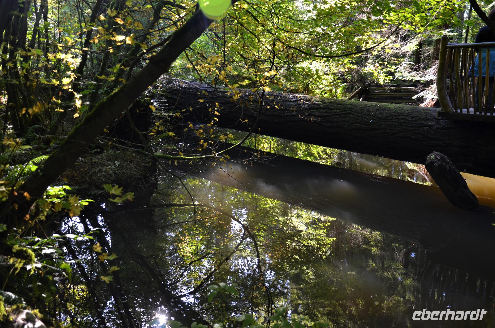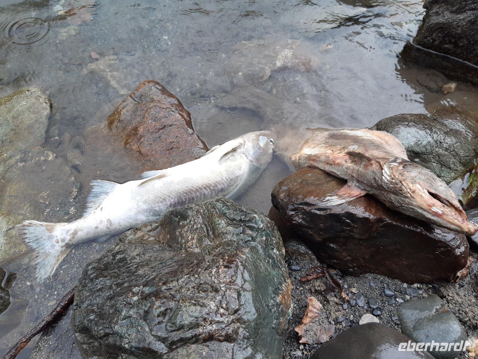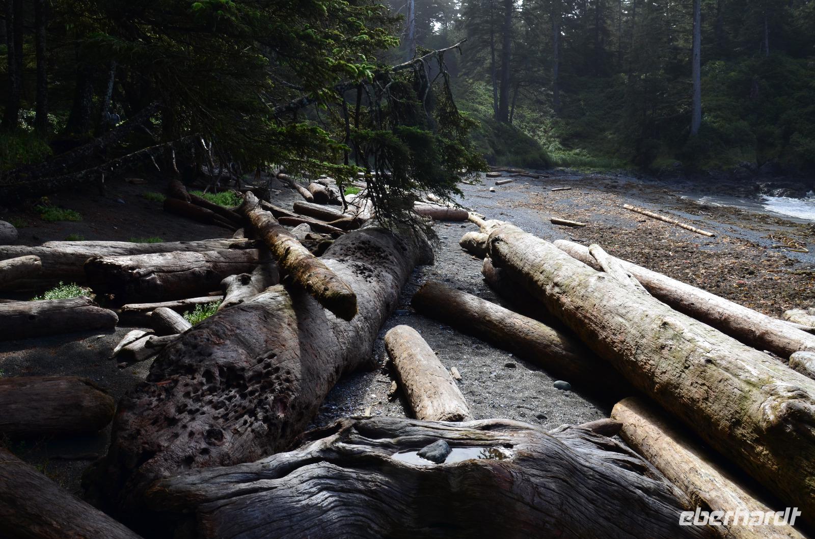 Durch das gemäßigte Klima Vancouver Islands haben wir wieder, wie zu Beginn unserer Reise, sommerliche Temperaturen. Perfekt für den Aufenthalt am Strand! In den Tag starten wir mit einer monströsen Portion Eier Benedict, die zusätzlich mit Räucherlachs garniert ist. Das ideale Frühstück, abgestimmt auf das maritime Flair. Während sich also einige noch in Ruhe ihr Frühstück schmecken lassen, gehen andere auf Erkundungstour in unserem kleinen Hafen und haben das große Glück, sowohl Seeotter als auch Weißkopfadler aus direkter Nähe zu beobachten. Direkt von unserem Hotel aus starten auch Walbeobachtungstouren, für die wir mit unserem bereits vollen Programm keine Zeit haben, die man aber äquivalent problemlos und auch kurzfristig buchen kann. Nachdem wir uns im Besucherzentrum von Ucluelet mit Kartenmaterial versorgt haben, geht es auf, zu unserem ersten, leicht unkonventionellen Tagespunkt. Okay...wir lassen einmal wieder unseren „kriminellen Energien" freien Lauf und begeben uns, trotz Abratens der Dame des Besucherzentrums, zu Fuß auf eine Bärensichtungsmission. An der „Thornton fish hatchery", einem Lachslaichplatz am Thornton Fluss, kommt es nach Hörensagen regelmäßig zu Bärensichtungen. Zu unserer Verteidigung muss ich anbringen, dass die Hinweisschilder auf dem Weg dahin nicht eindeutig sind! Leider begegnen wir kurz vor Ankunft am Ziel einer Rangerin, die uns prompt abtreten lässt. Aber immerhin haben wir es versucht. Für Autos ist die Anfahrt problemlos möglich, wohingegen unser monströser Bus diesen kleinen Weg leider nicht befahren darf. Dies ist rund um Tofino ein allgegenwärtiges Problem.