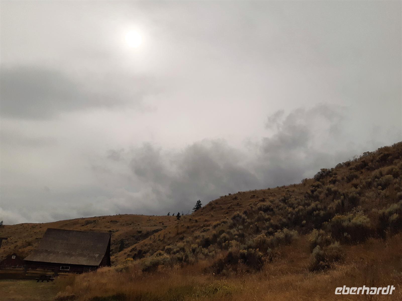 Als hätten wir es geplant, setzt heute der erste, schwere Regen ein. Da wir große Strecken im Bus zurück legen werden, ist dies der perfekte Zeitpunkt, die vielen Eindrücke der letzten Tage setzen zu lassen und dabei ab und zu die Augen für eine kurze Traumreise zu schließen. Unterstützt werden wir dabei von dem beruhigenden Geräusch des auf die Fensterscheiben niedergehenden Regens! Somit hat jede Wetterlage etwas für sich und wir kosten die Vorzüge des Regenwetters in vollen Zügen aus :). Bevor die entspannte Fahrt allerdings beginnt, besingen wir gebührend unser heutiges Geburtstagskind. Wenn ich gewusst hätte, mit welcher Leidenschaft und Inbrunst meine Gäste regelrechte Arien schmettern, hätten wir das von Anfang an zum Warmwerden jeden Morgen gemacht! Aber was nicht ist, kann ja noch werden! Bei einem sind sich aber alle einig - das Frühstück im Gateway Grill war das Beste und Üppigste der gesamten bisherigen Reise. Der Regen ist also direkt kompensiert. Somit starten wir unsere Fahrt gut gelaunt immer entlang des Thomson Flusses auf dem Transcanada Highway. Die Landschaft verändert sich auch hier zusehends. Immer wieder tun sich saftige, grüne Weideflächen auf, welche sich in die eher karge, hügelige Graslandschaft, mit ihren vielen Salbei- und gelbblühenden Ginsterbüschen, einbetten. Auch bei Regen ist dies ein beeindruckender Anblick. In dieser Region sehen wir zur Abwechslung auch landwirtschaftlich genutzte Flächen, wobei sich die Kürbisse bereits von Weitem leuchtend orange bemerkbar machen. Auch von Weitem leuchten die hellen Köpfe der Weißkopfadler, die man immer wieder am Fluss ausmachen kann. Am „Kamploops See" machen wir unseren ersten Fotostopp. Trotz eines heftigen Windes, gepaart mit dem Regen, verlassen alle den Bus. Meine Hochachtung dafür! Und einer muss schließlich auf unser wichtigstes Reisemittel aufpassen! Zur Zeit des Goldrausches gab es hier am „Kamploops See" die ersten Goldfunde. Der Hauptrausch tobte allerdings ab 1858 entlang des Fraser Flusses. Zu Beginn dieser Periode konnte man die teils großen „Gold-Nuggets" mit bloßen Händen aus dem Fluss schürfen, wodurch sich ein unmittelbarer Reichtum einstellte. Nachdem sich die frohe Botschaft verbreitet hatte, brauchte es fünf Jahre, bis die Goldablagerungen abgebaut waren. Danach bedurfte es schweren Geräts, um fündig zu werden. Auch heute gibt es noch Hobbygoldgräber, denen es jedes Jahr gelingt, kleine Goldmengen zu fördern.