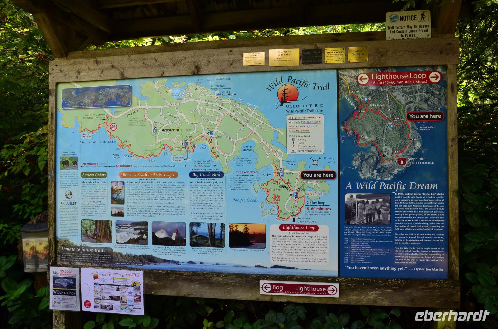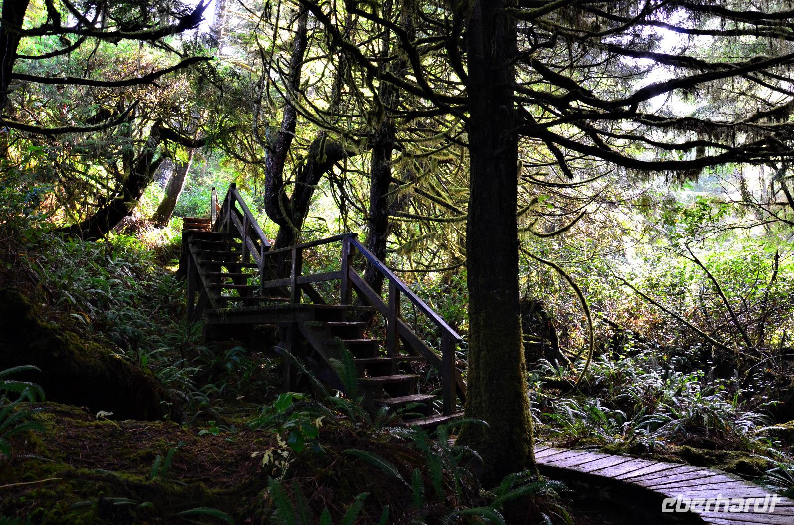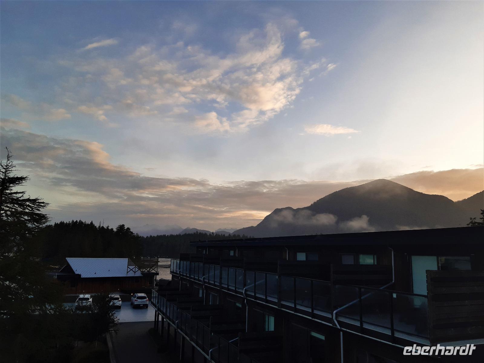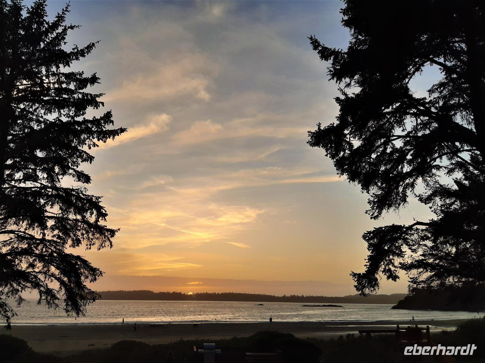 Der „Wild Pacific Trail" bei Ucluelet entschädigt uns dann für die misslungene, erste Mission. Dabei starten wir direkt an den rauen Klippen des Pazifiks, an deren Spitze ein alter Leuchtturm steht. Weiter geht es auf einem kleinen Pfad durch den Wald immer entlang der Brandung. Auch dieser Wald ist wieder ganz anders als alle anderen zuvor und genauso bezaubernd und faszinierend. Entlang der Strecke bieten sich zahlreiche Fotomotive und so genießen wir die Zeit und schlendern gemächlich den Teilabschnitt des Trails entlang. Bei unserem nächsten Stopp geht es endlich an den langersehnten Strand - dem „Wickaninnish Beach". Dieser Name stammt dabei von einem Häuptling der „Tla-o-qui-aht" und bedeutet so viel wie „Er hat niemanden vor sich im Kanu". Es ist also beruhigend zu wissen, dass dieser Strand im Kanu vor sich Platz hatte ;). Die eineinhalbstündige Freizeit am Strand wird jedenfalls in vollen Zügen ausgekostet. Zumal sich hier mehrere Möglichkeiten bieten. Man kann einen entspannten Strandspaziergang machen, sich das kleine Museum des Besucherzentrums anschauen oder einen Teil des „South Beach Trail" begehen. Dabei ist Letzterer zu großen Teilen ein abenteuerlicher und einfach nur wunderschöner Holzplankenweg durch eine atemberaube Natur und mit kolossalen Ausblicken auf das offene Meer mit seiner tosenden Brandung. Das Tiersichtungen hier sehr wahrscheinlich sind, lassen die demonstrativ gesetzten, riesigen Kothaufen vermuten, die immer wieder direkt auf dem Weg verteilt sind. Auch die Schwarzbeeren nutzen also gern die ausgebauten Wanderwege. Nach einer halbstündigen Freizeit am längsten Beach der Insel, dem „Long Beach", fahren wir weiter zum Stadtzentrum Tofinos. Da unser Hotel auf dem Weg liegt, kann wer will vorzeitig den restlichen Tag in Eigenregie gestalten. Somit ist gerade heute für jeden das Richtige dabei. Der Rest der Gruppe fährt weiter nach Tofino. Nach einer kurzen Besichtigung der Galerie des bekanntesten, lokalen Malers Roy Vickers, kann der Rest der Zeit frei gestaltet werden. Da unser Hotel in Laufweite liegt, kann sich auch hier jeder flexibel betun. Am Abend finden wir alle wieder zusammen und fahren zum gemeinsamen Abendessen ins Best Western TinWis, wobei wir zuvor noch etwas Zeit am hiesigen Strand verbringen. Die Stimmung mit der untergehenden Sonne ist einmalig. Auch einmalig ist unser darauf folgendes Essen. Da es sich zusätzlich einmal wieder um ein Buffet handelt, müssen wir uns auf dem Weg zum Bus gegenseitig stützen. Bei derartigen gegenseitigen Hilfestellungen sind wir allerdings mittlerweile Vollprofis :).
