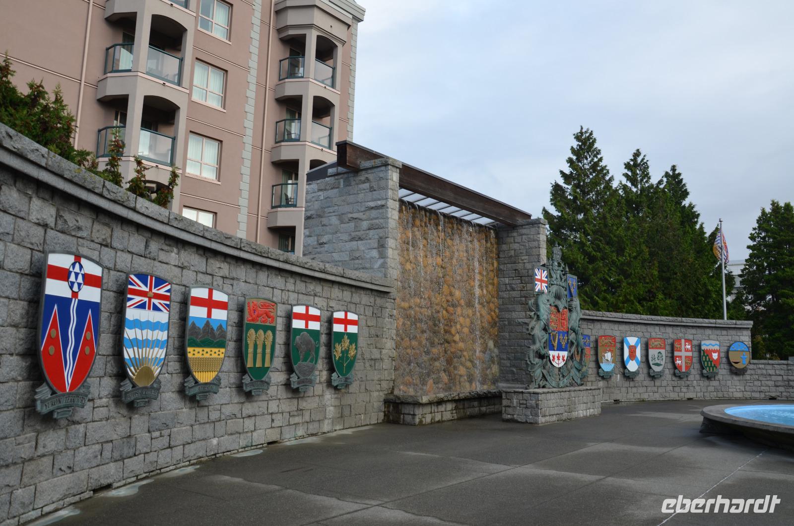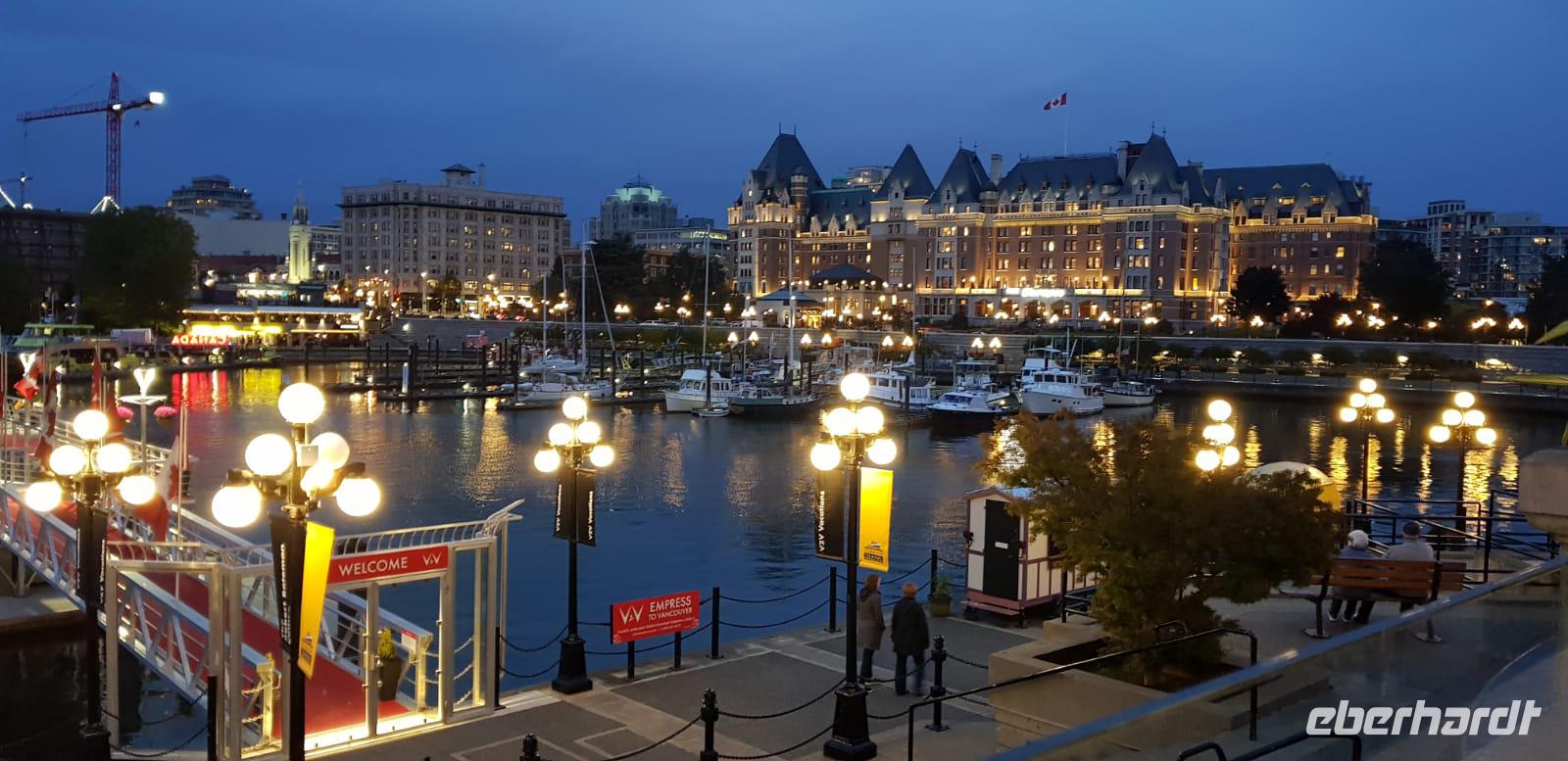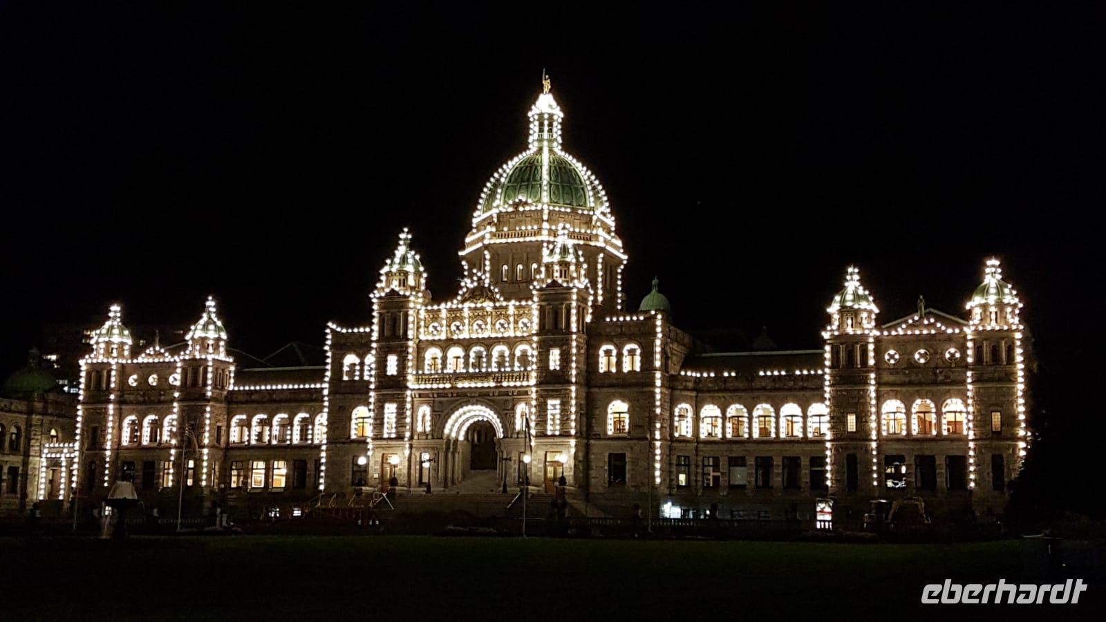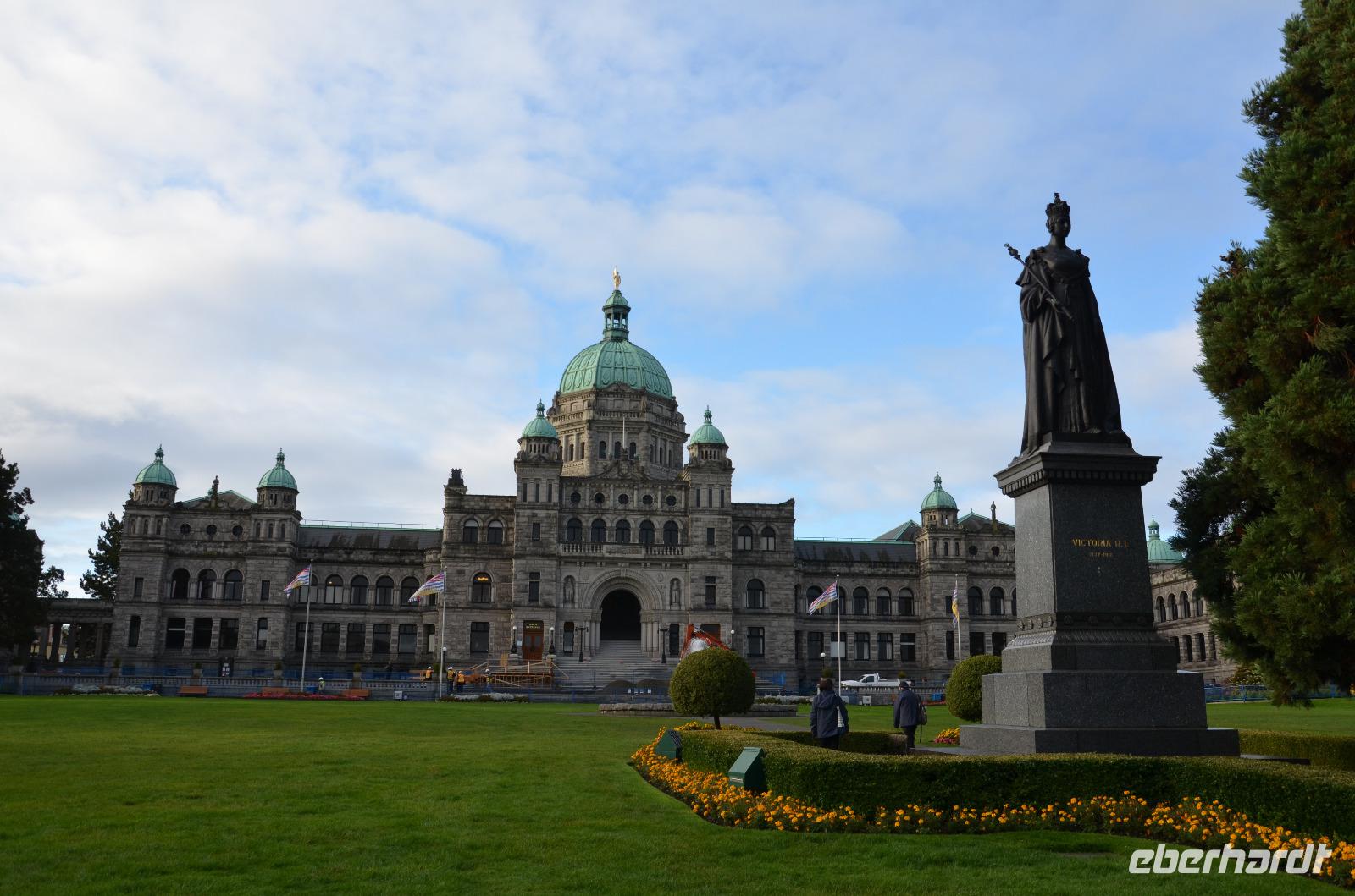 Nach einer kurzen Freizeit in Port Alberni an der River Front geht es weiter zu unserer wohlverdienten Mittagspause auf dem Markt in Coombs. Wahrscheinlich würden hier nicht so viele Touristen anhalten, obwohl der Markt wirklich vielfältig und reichlich bestückt ist, wenn da nicht die berühmten Ziegen auf dem Dach wären. Eine geniale Vermarktungsidee! Somit befindet sich auf dem Dach des Holzgebäudes eine begrünte Fläche, auf der mehrere Ziegen leben. Da sich das Gebäude direkt an der Straße befindet, sieht man die Tiere schon von Weitem. Im Anschluss fahren wir weiter nach Chemainus. Dieser kleine, beschauliche Ort ist bekannt für seine Wandmalereien, die zahlreiche Hausfassaden schmücken. Von Darstellungen der holzverarbeitenden Industrie bis hin zu Landschaftsmotiven und Portraits bekannter Indianer ist alles dabei. Zum Schluss gibt es noch das ein oder andere Souvenir aus den zahlreichen Geschäften und schon sind wir bereit zur Weiterfahrt. Als wir am frühen Abend in Victoria, der Hauptstadt Britisch-Kolumbiens, ankommen, schließen wir eine kleine Stadtrundfahrt an. Die britische Kolonialvergangenheit zeigt sich dabei ausgeprägt in der viktorianischen Architektur, wobei der Name der Stadt auf die britische Königin Victoria zurück geht. Das Parlamentsgebäude der Provinz sowie das Luxushotel „Fairmont Empress", welche sich beide in Hafennähe befinden, sind dabei besonders imposant ausgestaltet und befinden sich auf den wertvollsten Grundstücken der gesamten Provinz.