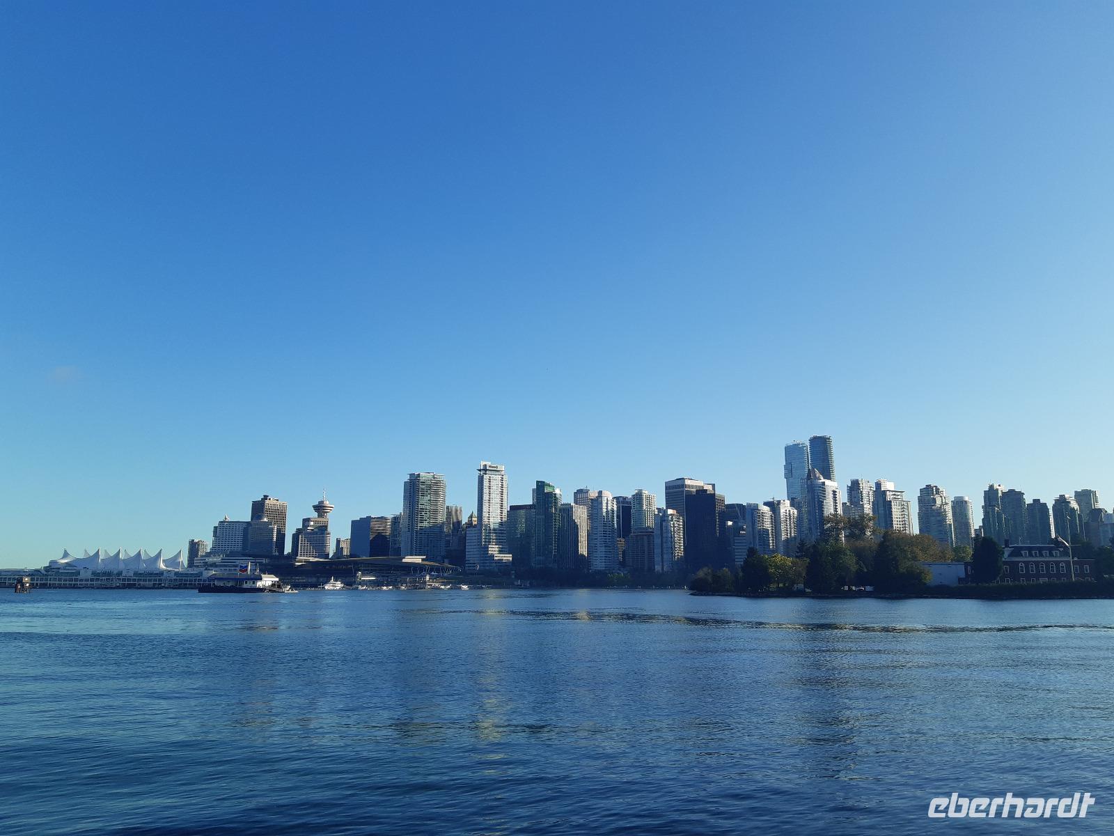 Am späten Nachmittag landen wir in Vancouver, der drittgrößten Stadt Kanadas. Auch hier schließen wir direkt eine Stadtrundfahrt an, die aufgrund des hohen Verkehrsaufkommens teils abenteuerlich verläuft. Um Dave aus der Ruhe zu bringen bedarf es allerdings wesentlich mehr. Obwohl dies normalerweise nicht umsetzbar ist, ermöglicht er uns zwei Fotostopps - an der Dampfuhr in Gastown, die bei unserer Ankunft zur vollen Stunde gerade Druck ablässt und am Canada Place, wo man einen herrlichen Blick über den Hafen hat. Wie man sich bereits denken kann, erschallt auch hier wieder sein Name bei lauten Jubelklängen im Chor. Weiter geht es zum Stanley Park, der mit einer Größe von 404,9 Hektar nicht nur der größte Stadtpark Kanadas ist, sonder auch der Drittgrößte ganz Nordamerikas. Als wir mit dem Bus hindurch fahren, sind seine Ausmaße wirklich beeindruckend. Ein regelrechtes Naherholungsgebiet für gestresste Großstädter. An einem Aussichtspunkt mit perfektem Blick auf die Silhouette Vancouvers, machen wir einen Stopp für Fotos und begutachten zusätzlich die aufgestellten Totempfähle. Bei unserer Ankunft im Hotel, perfekt zur Abendbrotzeit, hat nun jeder die Gelegenheit, den Tag nach eigenen Wünschen ausklingen zu lassen. Vorerst müssen wir nun aber auch Dave verabschieden. Unser treuer Gefährte im Westen Kanadas beschreitet nun neue Wege und das ohne uns. In einer feierlichen Zeremonie drücken wir unseren Dank aus und wünschen ihm alles Gute. Auch, wenn er mit seiner ruhigen Art nicht wirklich der Typ dafür ist, muss er einige Umarmungen über sich ergehen lassen. Aber er wird uns genauso vermissen wie wir ihn! Dies hat er mir bereits vor einigen Tagen verraten, als er meinte, was er dann ohne uns anstellen soll.