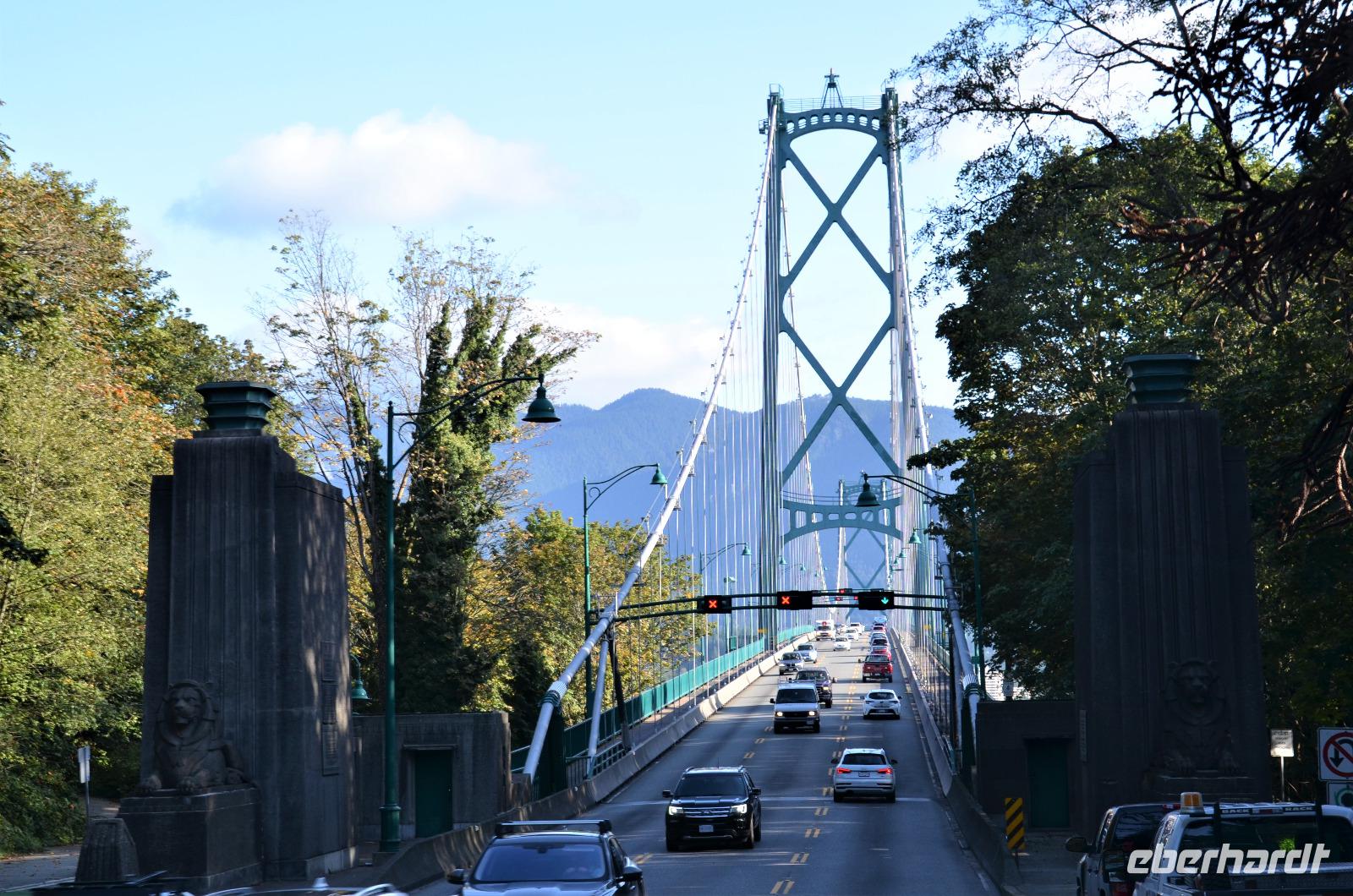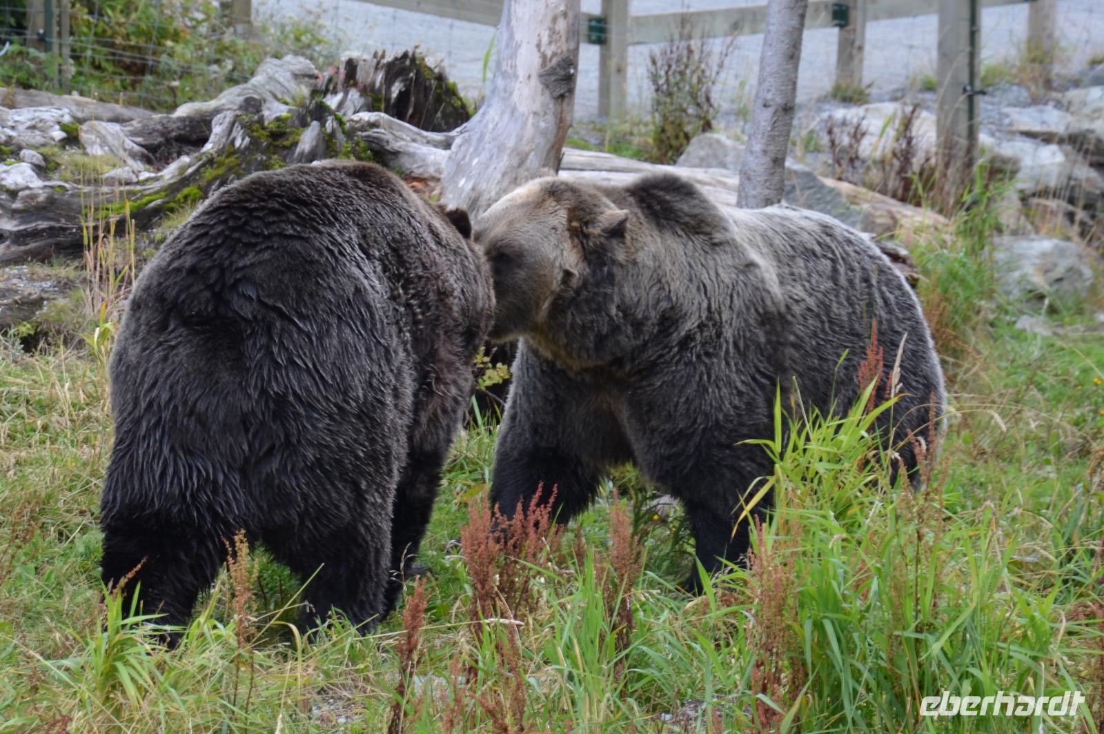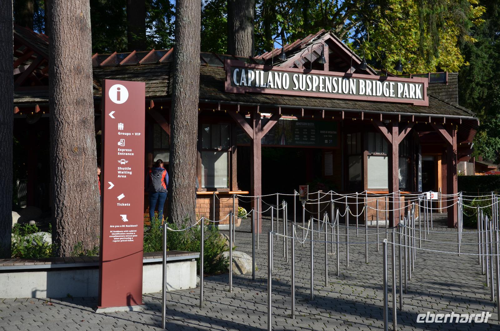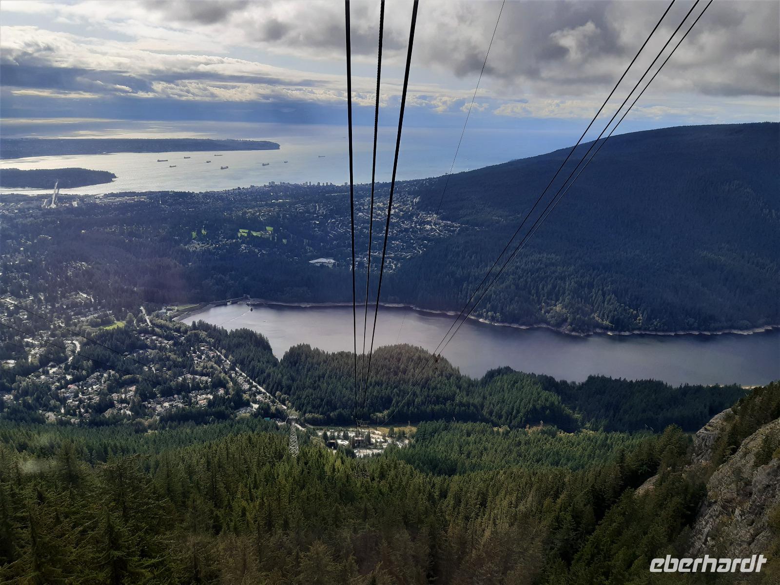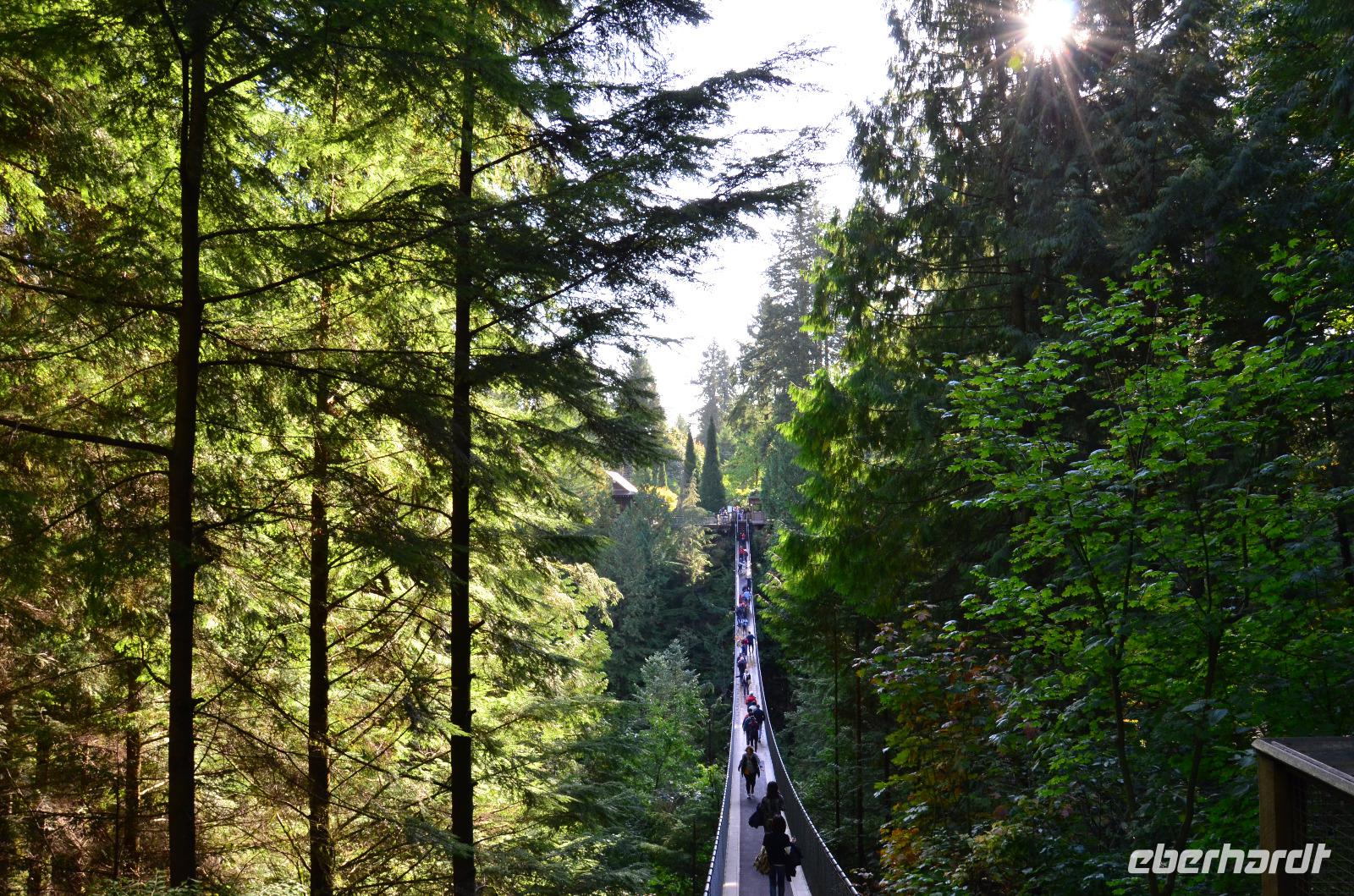 Die Sonne scheint und somit starten wir heute guter Dinge in unseren letzten Tag hier im grünen Norden Vancouvers. Bei der Fahrt über die „Lionsgate Bridge" genießen wir einmal wieder den Ausblick auf die Stadt. Als erstes erwarten uns zwei Stunden im „Capilano Suspension Bridge Park", wobei der Capilano der Fluss ist, über den die besagte freischwingende Seilbrücke in 70 Metern Höhe hinüber führt. Neben der 137 Meter langen Hauptattraktion, gibt es aber auch noch einen Baumwipfelpfad inmitten 8 aufragender Douglastannen und einen 213 Meter langen „Cliff Walk" (Klippenweg). Begleitet wird man dabei von zahlreichen Informationstafeln. Nachdem wir alle Wege beschritten haben, geht es weiter zum „Grouse Mountain", dem 1.200 Meter hohen Gipfel Vancouvers, mit einer fantastischen Panoramaaussicht über die Gegend. Hinauf geht es dabei mit einer 15 minütigen Gondelfahrt. Das wohl spannendste am Erklimmen des Berges, sind die zwei hier ansässigen Grizzlys Grinder und Coola, die bereits seit 18 Jahren hier leben. Ich hatte bereits zuvor gesagt, dass dies die Bärengattung ist, die uns zu unserem Glück noch fehlt und ich wusste bereits, dass wir wunschlos glücklich aus Kanada abreisen werden. Bei etwas kühleren Temperaturen lauschen wir gebannt den Ausführungen eines Rangers, der alles Wissenswerte über die Tiere berichtet. Da sie allein durch seine Anwesenheit auf Futter hoffen, sind sie zum Anfassen nah direkt hinter dem Zaun. Dabei demonstrieren sie immer wieder ihre Stärke und Anmut bei kleineren Interaktionen miteinander. Ich fühle mich wie in einem Dokumentarfilm - nur viel besser! In freier Wildbahn würde es ein derartiges Band zwischen zwei männlichen Grizzlys nie geben, zumal sie auch kein so stattliches Alter erreichen würden. So umstritten die Frage ist, ob man grundlegend verwaiste Bärenbabys aufnehmen sollte, um sie aufzuziehen, so sehr profitieren wir heute von der Rettung der beiden. Einen Grizzly live und in Farbe zu beobachten ist schon ein ganz besonderes Erlebnis.