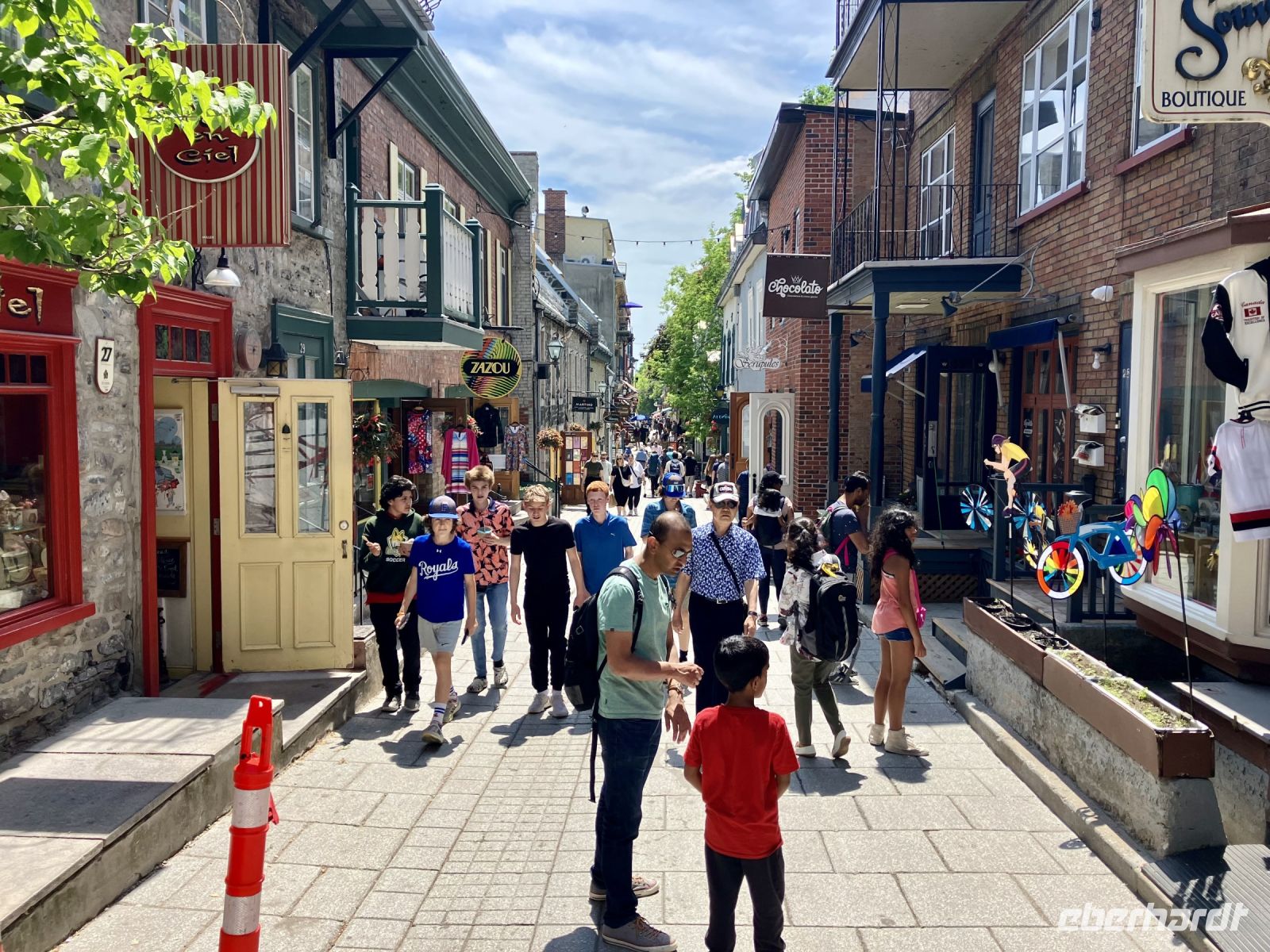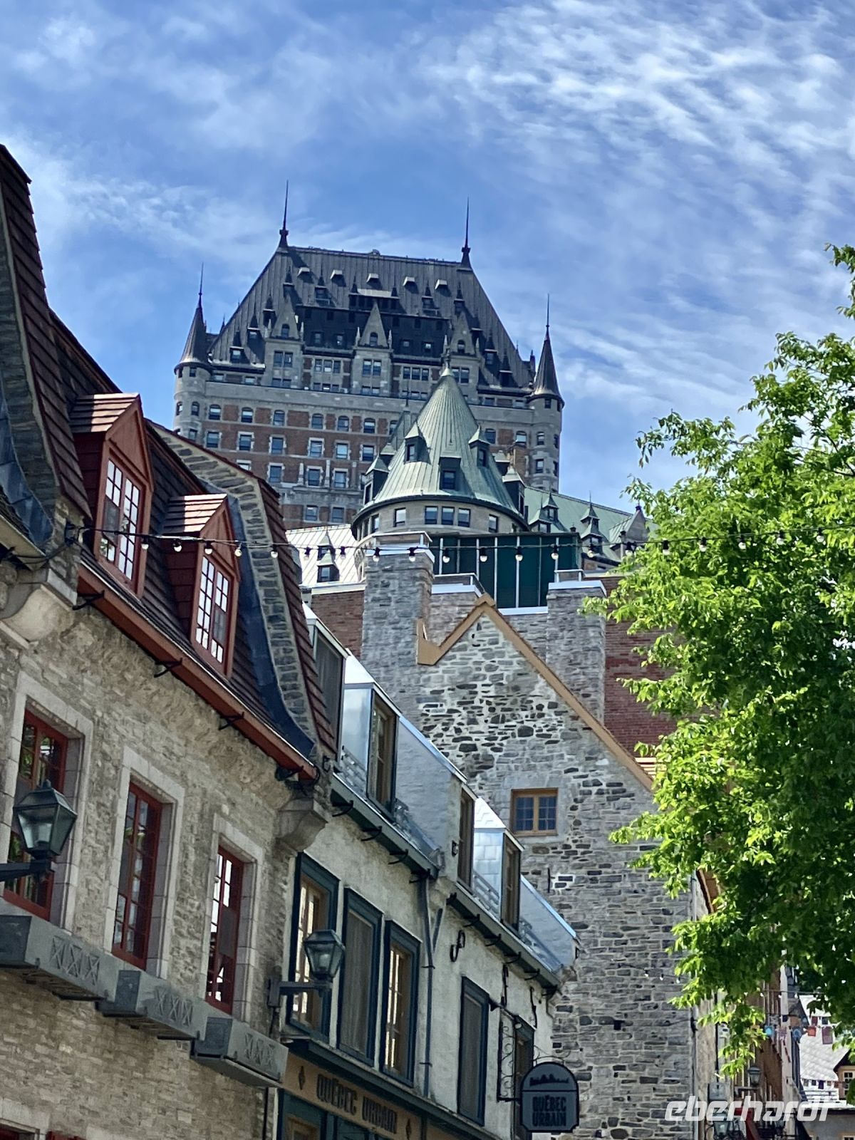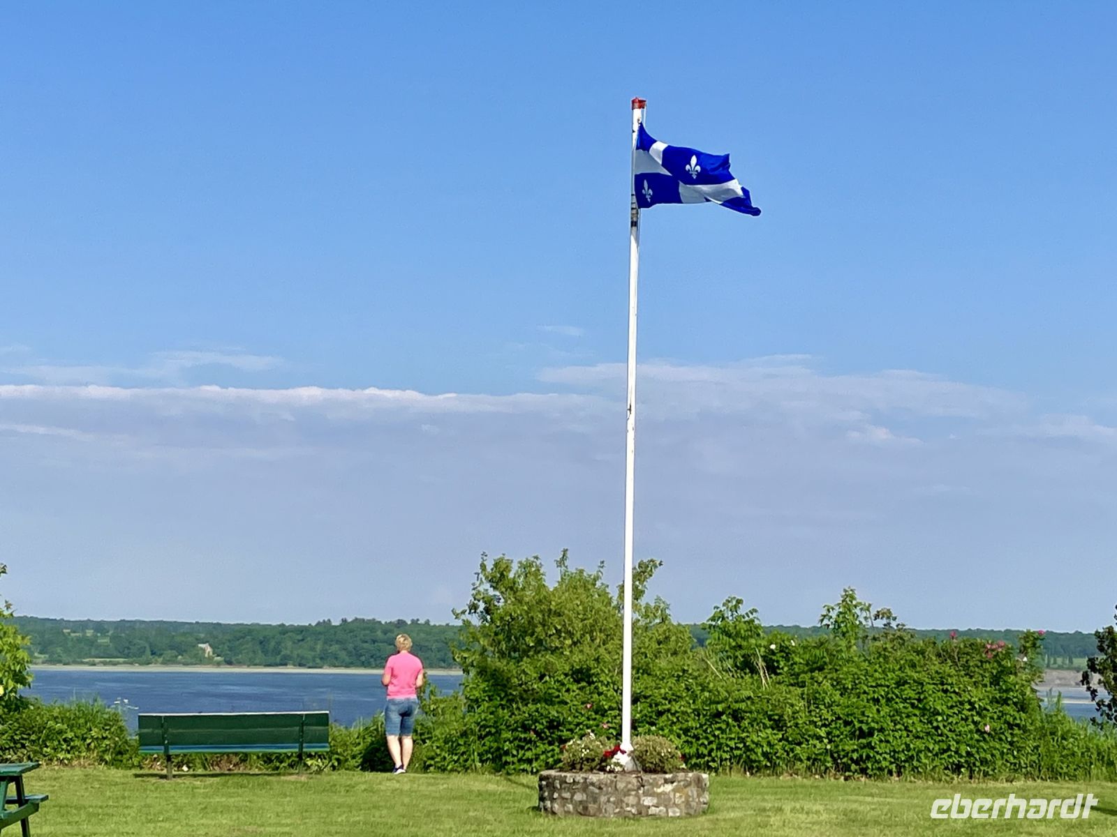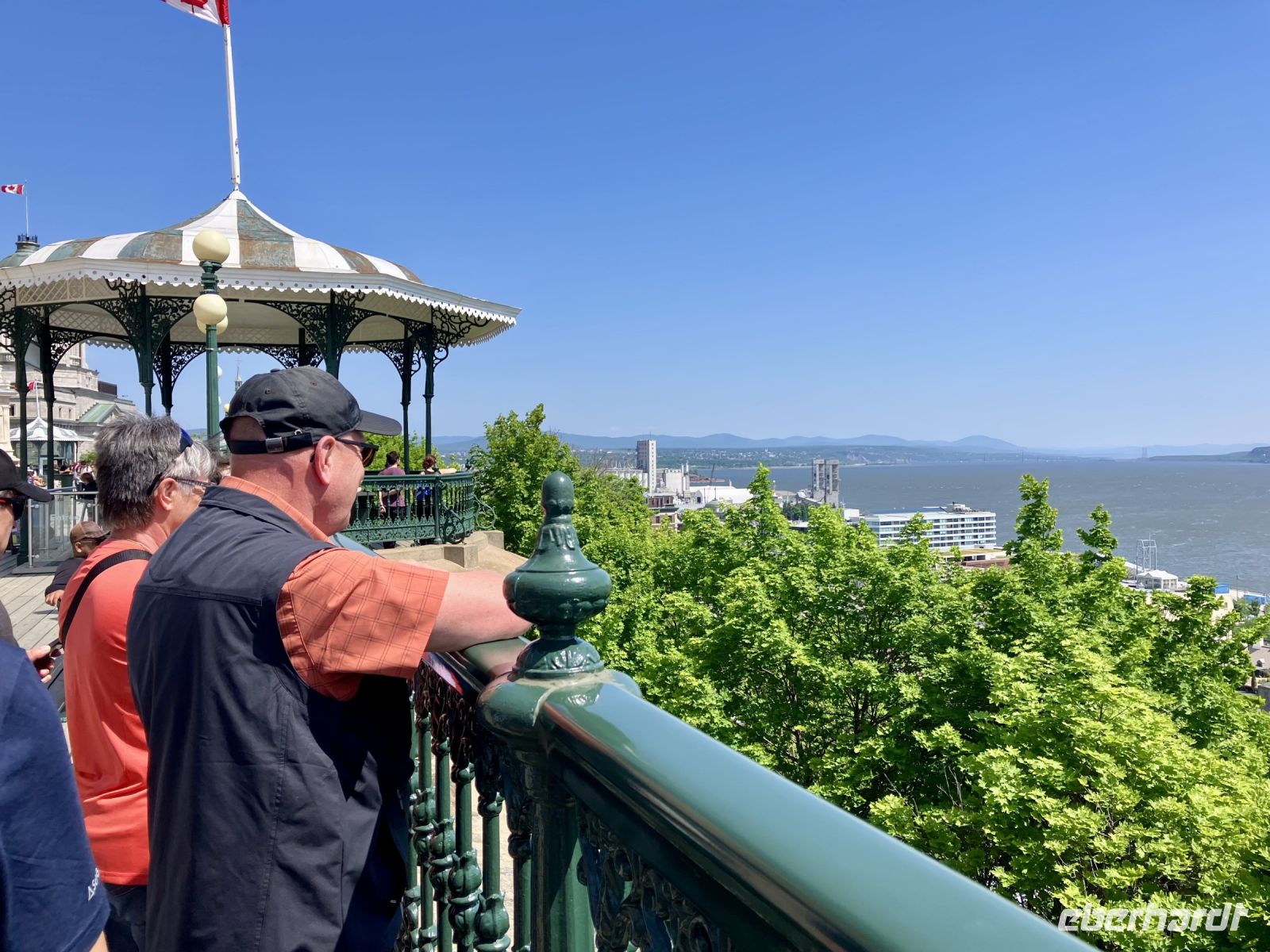 Gut ausgeschlafen treffen wir uns um 7:30 Uhr zum Fruehstueck. Das ist Urlaub. So lange schlafen, herrlich. Eine Stunde spaeter lernen wir die nette Marina kennen, sie ist unsere Stadtfuehrin in Quebec. Das Wetter ist praechtig und Elisabeth meint, dass wir alle Engel sind. Das Hotel ist wirklich sehr schoen, hat jedoch viele Gaenge zu den verschiedenen Fluegel und Aufzuegen. Es aehnelt sehr einem Labyrinth. Die Stadtrundfahrt ist wunderbar und sehr geruhsam. Vorerst zeigt uns Marina stolz den Park wo die 1/2 -stuendige Schlacht England gegen Frankreich stattfand. Heute sehen wir dort eine schoene Blumenanlagen, romantische Wege, Wasserspiele und schoene Aussichtsterrassen auf den Sankt Lorenz Strom. Beim Parlament halten wir an und staunen ueber den praechtigen Bau und den riesen Brunnen den wir gestern Abend beleuchtet schon besucht haben. Weiter gehts in die Obere Altstadt mit ihren schicken Haeuser und schoenen Strassen. Das Chateau Frontenac ist heute ein 5 Sterne Hotel der Fairmont Kette. Vor dem Chateau ist die grosse Terrasse mit der wohl allerschoensten Sicht auf den Strom und die vorliegende Insel. Marina erklaert uns alle Details und macht uns auf vieles Aufmerksam, was wir sonst gar nicht gesehen haetten. Weiter schlendern wir die Halsbrecher-treppe runter…ja, wir haben’s ueberlebt….und besuchen nun die reizende Untere Altstadt und denken wir seien eben in Frankreich gelandet. Ein Blumenparadies in engen Gassen mit vielen kleinen Geschaeften, Kaffees und Restaurants. Ah, es knurrt der Magen und Mittagszeit ist angesagt.