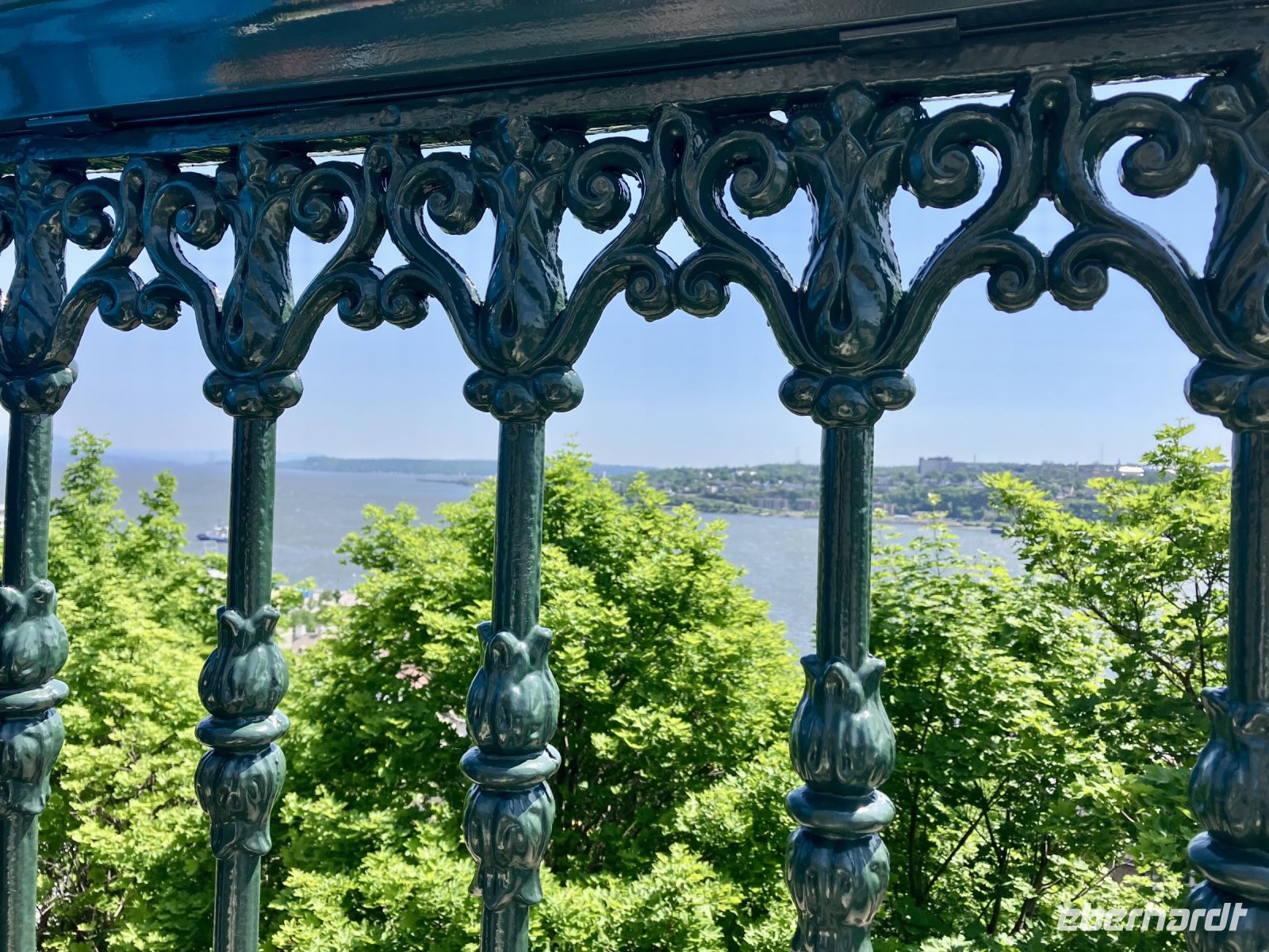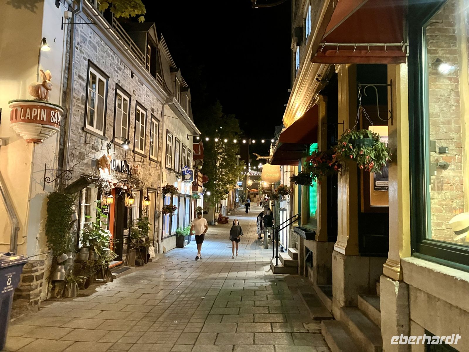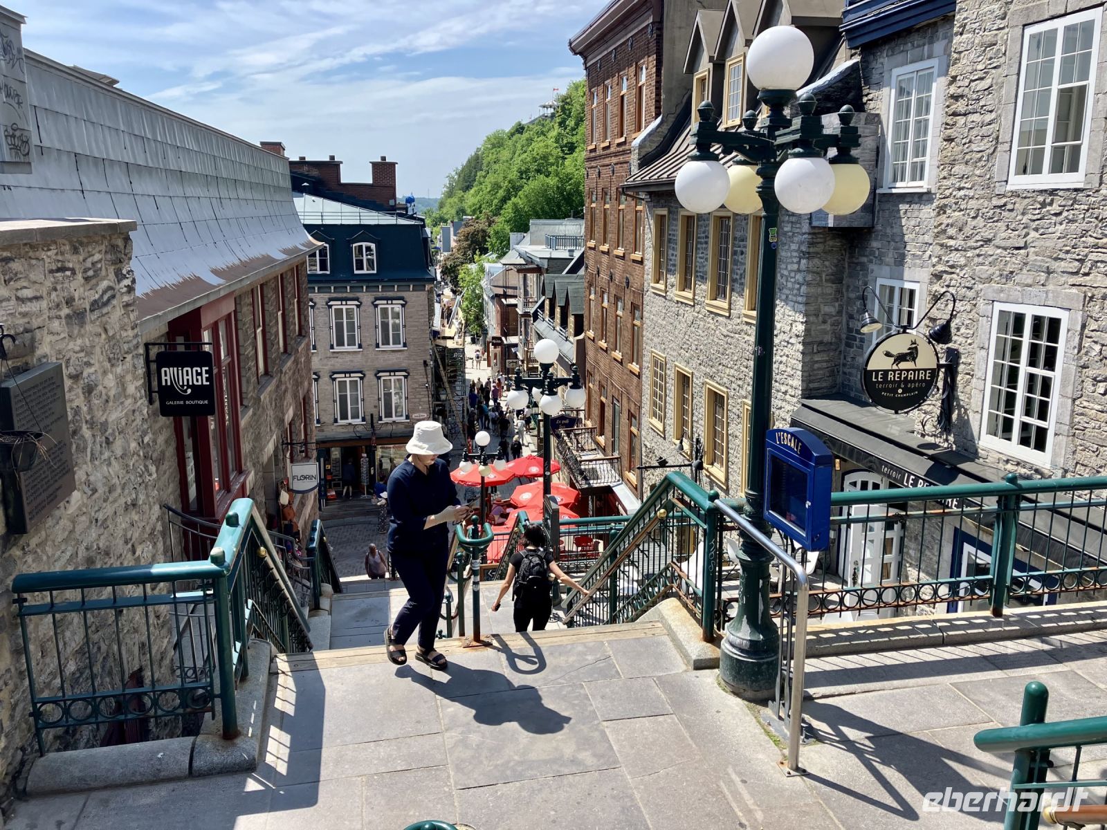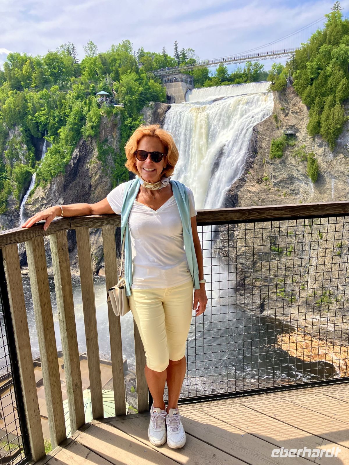 Gut ausgeschlafen treffen wir uns um 7:30 Uhr zum Fruehstueck. Das ist Urlaub. So lange schlafen, herrlich. Eine Stunde spaeter lernen wir die nette Marina kennen, sie ist unsere Stadtfuehrin in Quebec. Das Wetter ist praechtig und Elisabeth meint, dass wir alle Engel sind. Das Hotel ist wirklich sehr schoen, hat jedoch viele Gaenge zu den verschiedenen Fluegel und Aufzuegen. Es aehnelt sehr einem Labyrinth. Die Stadtrundfahrt ist wunderbar und sehr geruhsam. Vorerst zeigt uns Marina stolz den Park wo die 1/2 -stuendige Schlacht England gegen Frankreich stattfand. Heute sehen wir dort eine schoene Blumenanlagen, romantische Wege, Wasserspiele und schoene Aussichtsterrassen auf den Sankt Lorenz Strom. Beim Parlament halten wir an und staunen ueber den praechtigen Bau und den riesen Brunnen den wir gestern Abend beleuchtet schon besucht haben. Weiter gehts in die Obere Altstadt mit ihren schicken Haeuser und schoenen Strassen. Das Chateau Frontenac ist heute ein 5 Sterne Hotel der Fairmont Kette. Vor dem Chateau ist die grosse Terrasse mit der wohl allerschoensten Sicht auf den Strom und die vorliegende Insel. Marina erklaert uns alle Details und macht uns auf vieles Aufmerksam, was wir sonst gar nicht gesehen haetten. Weiter schlendern wir die Halsbrecher-treppe runter…ja, wir haben’s ueberlebt….und besuchen nun die reizende Untere Altstadt und denken wir seien eben in Frankreich gelandet. Ein Blumenparadies in engen Gassen mit vielen kleinen Geschaeften, Kaffees und Restaurants. Ah, es knurrt der Magen und Mittagszeit ist angesagt.
