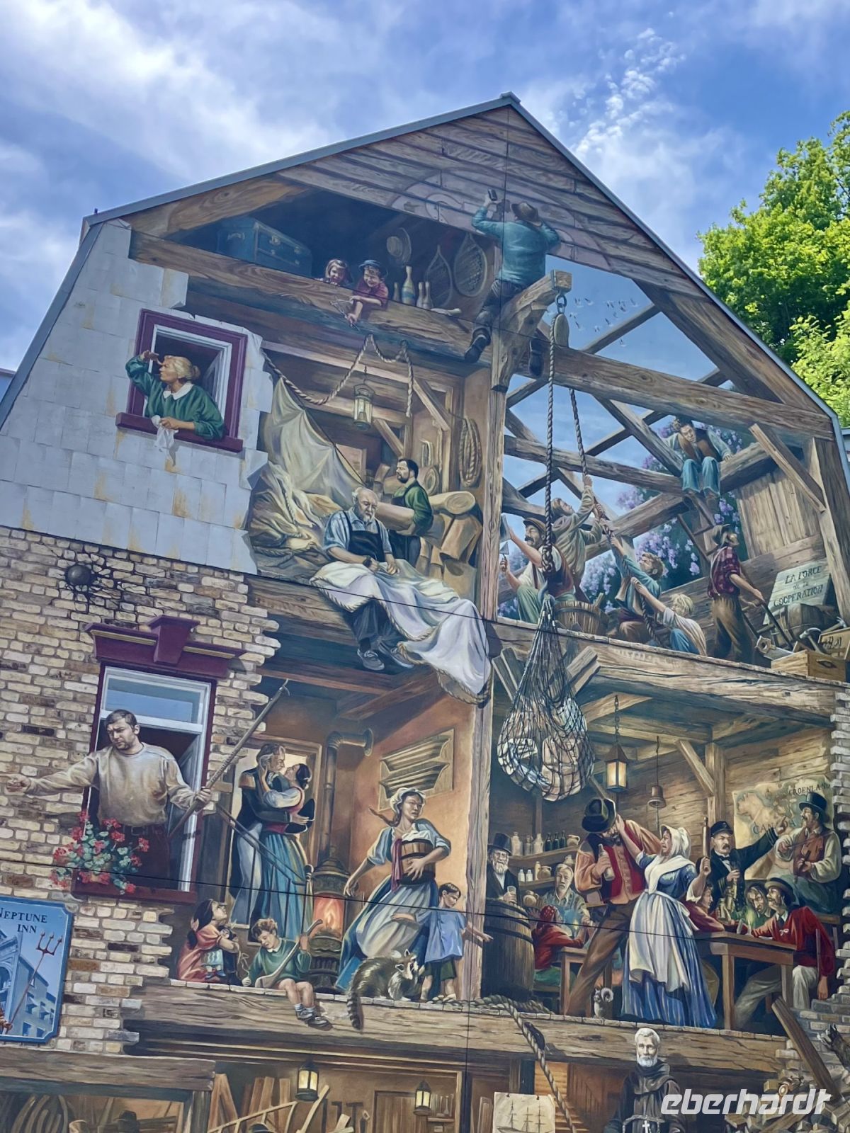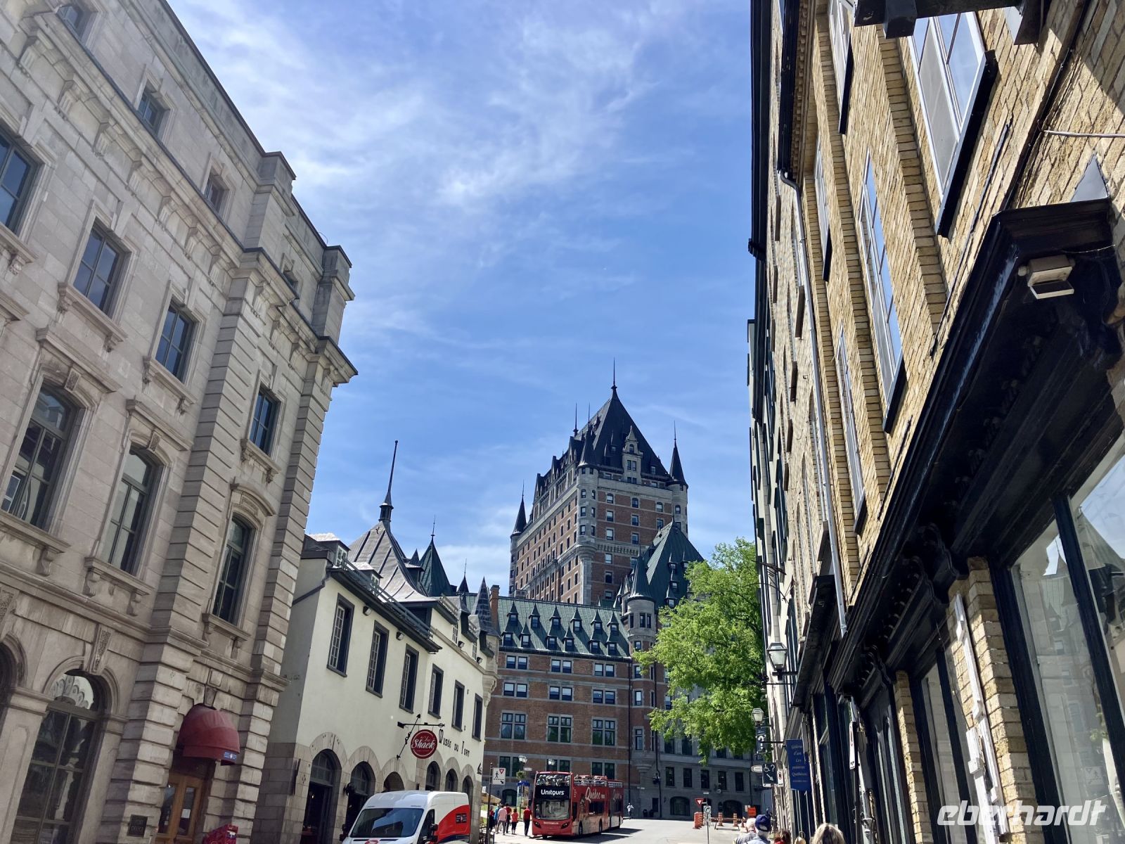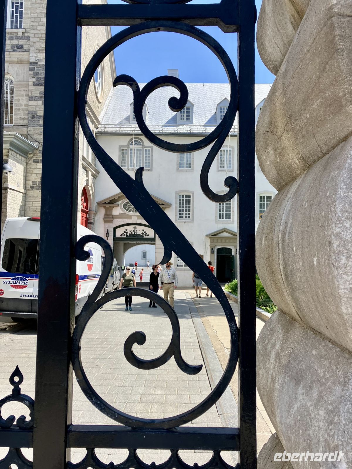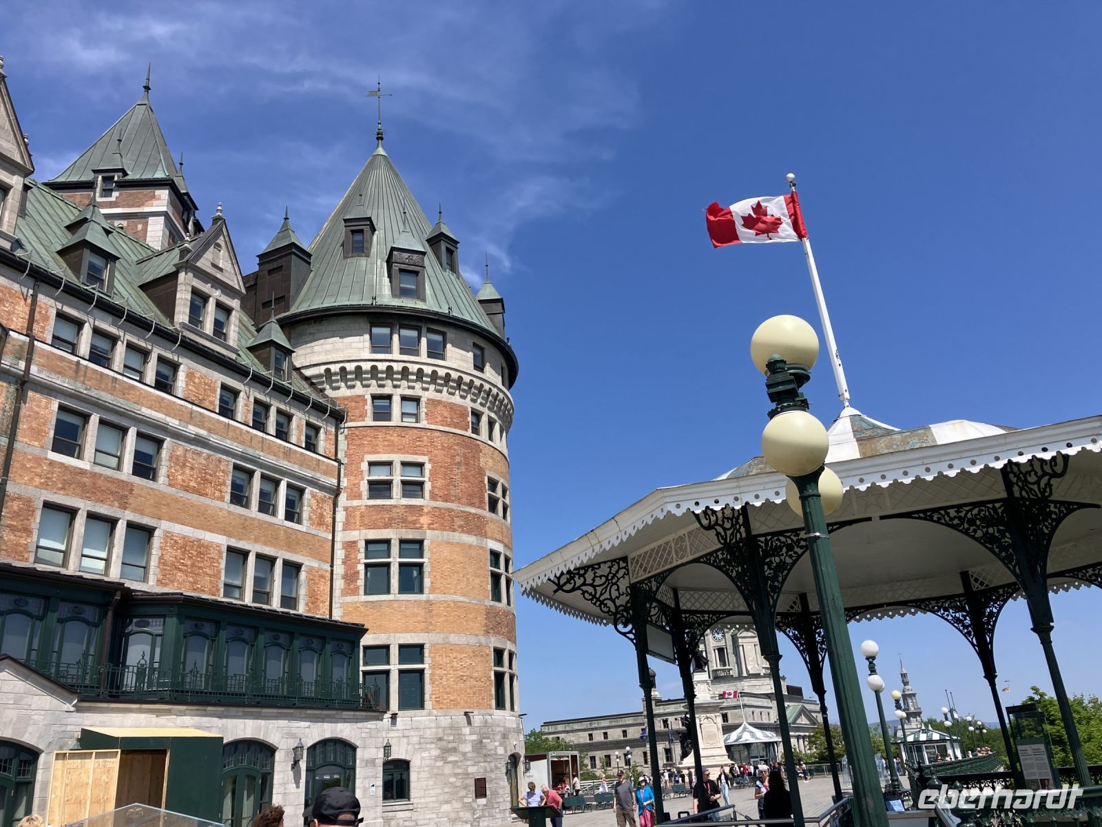 Gut ausgeschlafen treffen wir uns um 7:30 Uhr zum Fruehstueck. Das ist Urlaub. So lange schlafen, herrlich. Eine Stunde spaeter lernen wir die nette Marina kennen, sie ist unsere Stadtfuehrin in Quebec. Das Wetter ist praechtig und Elisabeth meint, dass wir alle Engel sind. Das Hotel ist wirklich sehr schoen, hat jedoch viele Gaenge zu den verschiedenen Fluegel und Aufzuegen. Es aehnelt sehr einem Labyrinth. Die Stadtrundfahrt ist wunderbar und sehr geruhsam. Vorerst zeigt uns Marina stolz den Park wo die 1/2 -stuendige Schlacht England gegen Frankreich stattfand. Heute sehen wir dort eine schoene Blumenanlagen, romantische Wege, Wasserspiele und schoene Aussichtsterrassen auf den Sankt Lorenz Strom. Beim Parlament halten wir an und staunen ueber den praechtigen Bau und den riesen Brunnen den wir gestern Abend beleuchtet schon besucht haben. Weiter gehts in die Obere Altstadt mit ihren schicken Haeuser und schoenen Strassen. Das Chateau Frontenac ist heute ein 5 Sterne Hotel der Fairmont Kette. Vor dem Chateau ist die grosse Terrasse mit der wohl allerschoensten Sicht auf den Strom und die vorliegende Insel. Marina erklaert uns alle Details und macht uns auf vieles Aufmerksam, was wir sonst gar nicht gesehen haetten. Weiter schlendern wir die Halsbrecher-treppe runter…ja, wir haben’s ueberlebt….und besuchen nun die reizende Untere Altstadt und denken wir seien eben in Frankreich gelandet. Ein Blumenparadies in engen Gassen mit vielen kleinen Geschaeften, Kaffees und Restaurants. Ah, es knurrt der Magen und Mittagszeit ist angesagt.
