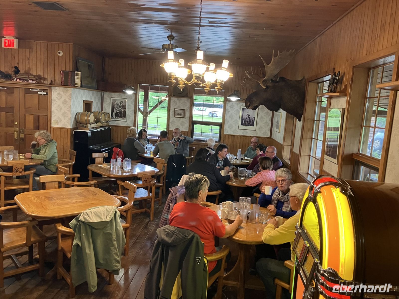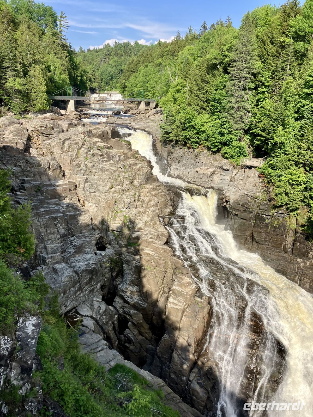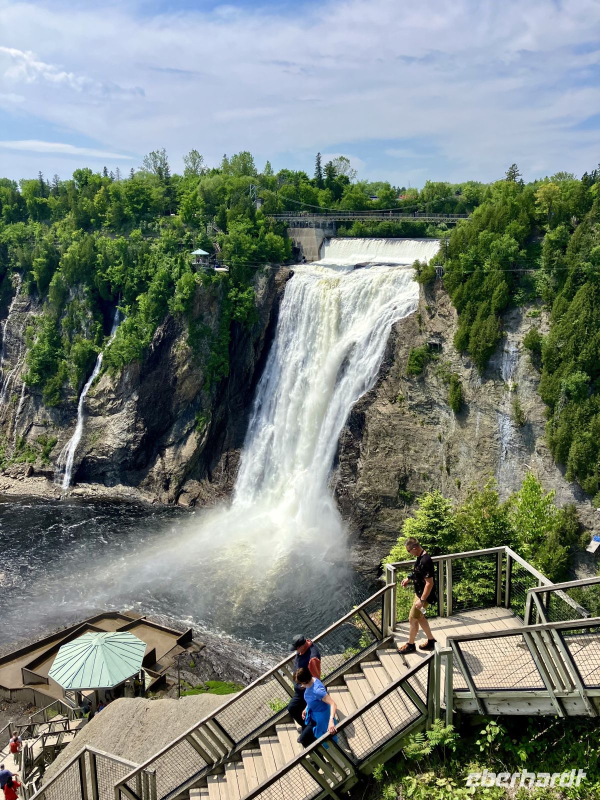 Am Nachmittag fahren wir zum 83Mt hohen Montmorency Wasserfall, gehen ueber die abenteuerliche Haengebruecke und staunen ueber das herrliche Naturspiel. Wir wollen gleich beim Thema Wasser bleiben und besuchen anschliessend eine Schlucht mit vielen tosenden Wasserfaellen in denen sich Regenbogen zeigen. Als nun bereits geuebte Haengebruecken-gaenger, taenzeln wir hier bereits sehr selbstsicher auf den hohen Wackel-bruecken. Schoen ist diese Schlucht von Saint Anne, einige Waghalsige unter uns machen sogar die ZipLine mit. Nun sind wir bereits unterwegs zu unserem naechsten Halt und…. Oh je, die schoene neue Uhr eines Mitreisenden wollte beim Canyon bleiben. Also fahren wir zurueck und holen den Ausreisser wieder zurueck. Nachdem wir das alles gut ueberlebt haben gehts nun ab zur gleichnahnigen Kathedrale. Wir sind 17 der rund 1 Mio Pilger die diese Staette jaehrlich besuchen. Es ist eine Riesenkathedrale. Nun muessen wir jedoch auch was Gutes fuer unser Leib tun und sind bereit alles ueber Ahornsirup zu lernen. In dem Sugar Shack fuehrt uns William in die Kunst der Ahornsirup-Herstellung ein. Ahorn- Wasser -Butter -Zucker -Aufstrich und -Sirup kosten wir. Mit einem Sugar-high, gehts jetzt weiter in den grossen Saal wo David mit seiner Gitarre bereits einige Gaeste mit schoenen alt-franzoesischen Volkslieder berieselt. An einem langen Tisch sitzend kosten wir viele lokale Speisen und horchen den Songs zu. Nach dem Mahl lernen wir Holzloeffel-klopfen und danach auch gleich die Schritte zu einem traditionellen Tanz . Alles ist sehr amuesant und wenn David dann einen Rock n’Roll anstimmt, sind wir alle auf der Tanzflaeche. Nun noch ein Ahorn-Lutscher geniessen, ein bisschen um das Lagerfeuer sitzen, den Tag ausklingen lassen und dann gehts zurueck nach Quebec, zu den weichen Betten. Hoffentlich ist heute das Zubett lose drauf ! Es war ein toller, voller und sonniger Tag.
