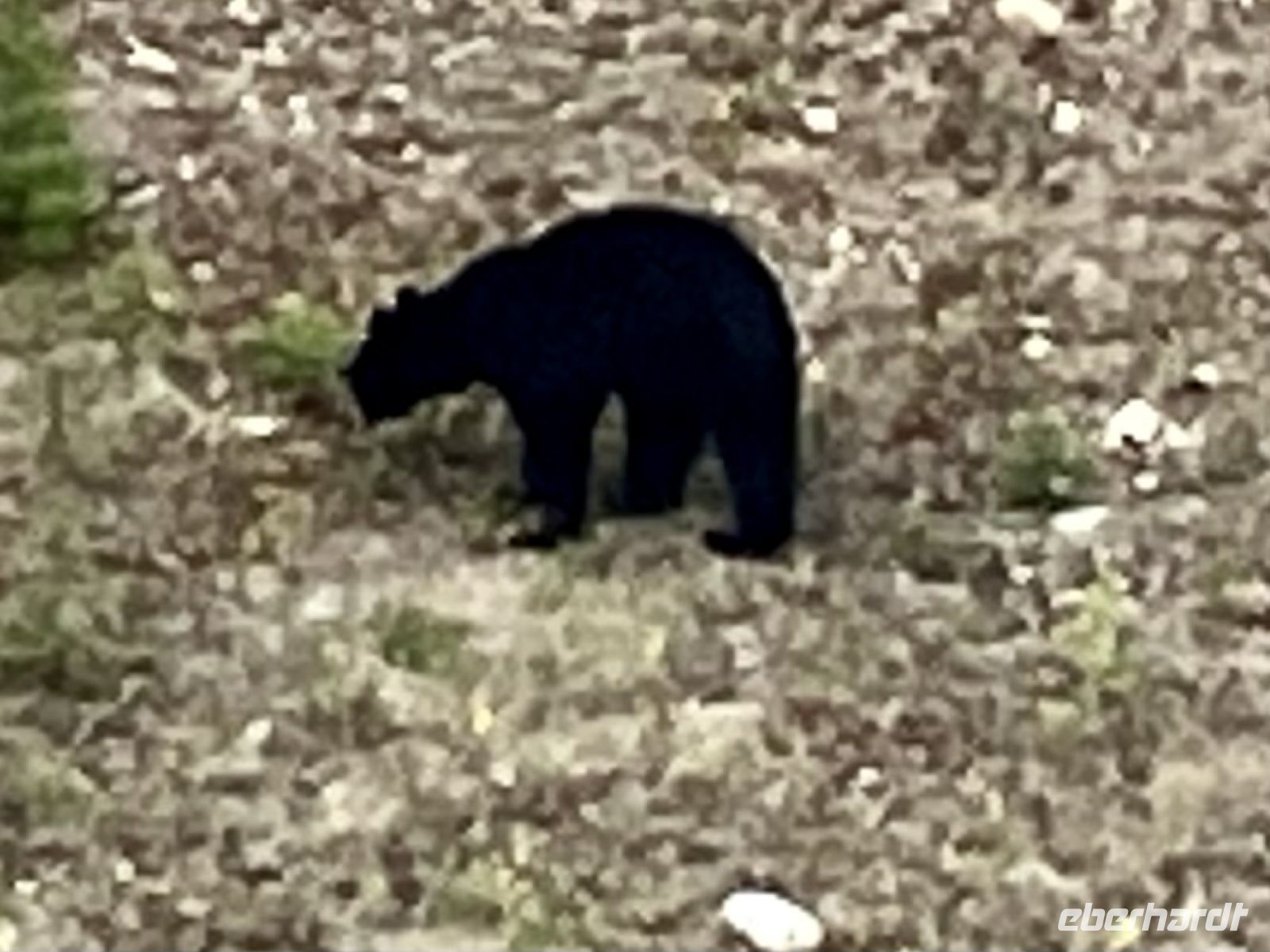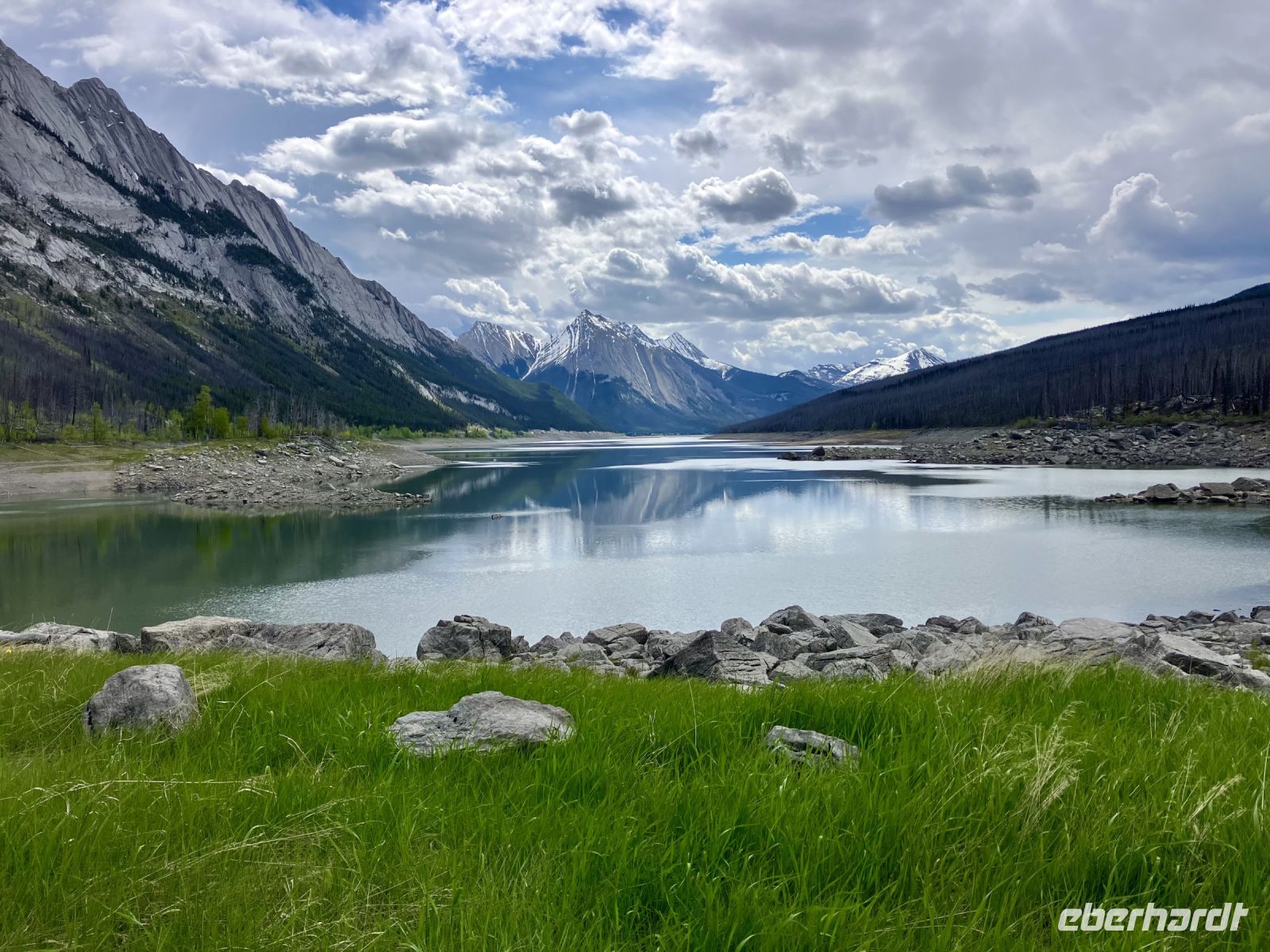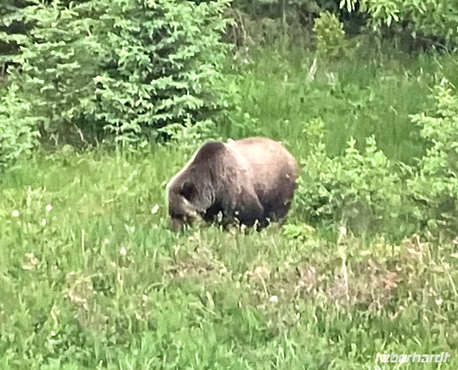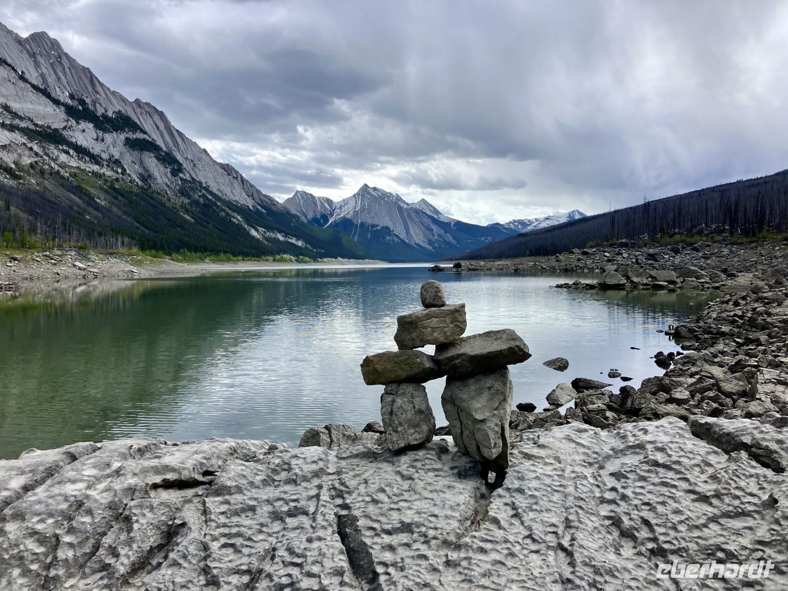 Wie schoen hier in Jasper aufwachen zu duerfen. Bing, macht mein Handy, schau hinein, ein Whatsup von unserer Gruppe. Ach ja, ein Paar hat bereits heute in der Frueh einen Schwarzbaeren vor ihrem Zimmer gesichtet und fotografiert. WOW. Nach dem Fruehstueck wollen wir nun gleich nach Jasper fahren. Halt…da steht ein Grizzly gleich am Strassenrand. Er ist sehr beschaeftigt frische junge Grasshalme zu fressen und kann sich nicht um die Auto-schar und einen Bus kuemmern. Der Grizzly ist hell braun mit einem dunkel braunen Strich auf dem Ruecken. Ein Paradestueck. Wir schauen zu bis der Parkwaechter kommt und uns alle verscheucht. Weiter gehts nach Jasper und danach in die Maligne Schlucht. Einige unter uns wandern die 1 1/2 Stunden den Schluchtweg hinauf und andere spazieren oben eine gute 1/2 Stunde. Es ist ein sehr fotogener Morgen, der reissende Maligne-Fluss, seine Schluchten, seine Wasserfaelle, die Marmiten und die misterioesen Zu- und Abfluesse sind alle sehr beliebte Motive. Ein “to go” Kaffee danach fahren wir weiter. Bei Medicin Lake halten wir nun an um den Kurs 101 Inukshuk-Bau zu absolvieren. Ja, wir haben die Eberhardt Freiluft Galerie 2024 eroeffnet und unsere Kunstwerke kann man, ohne Aufpreis besuchen.