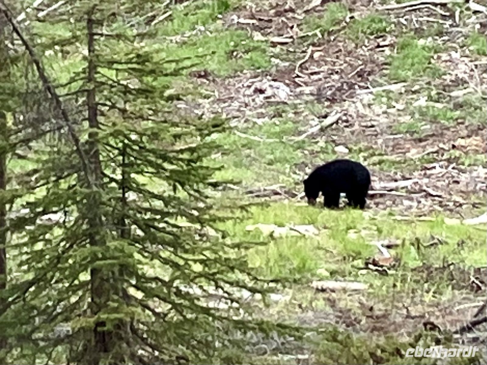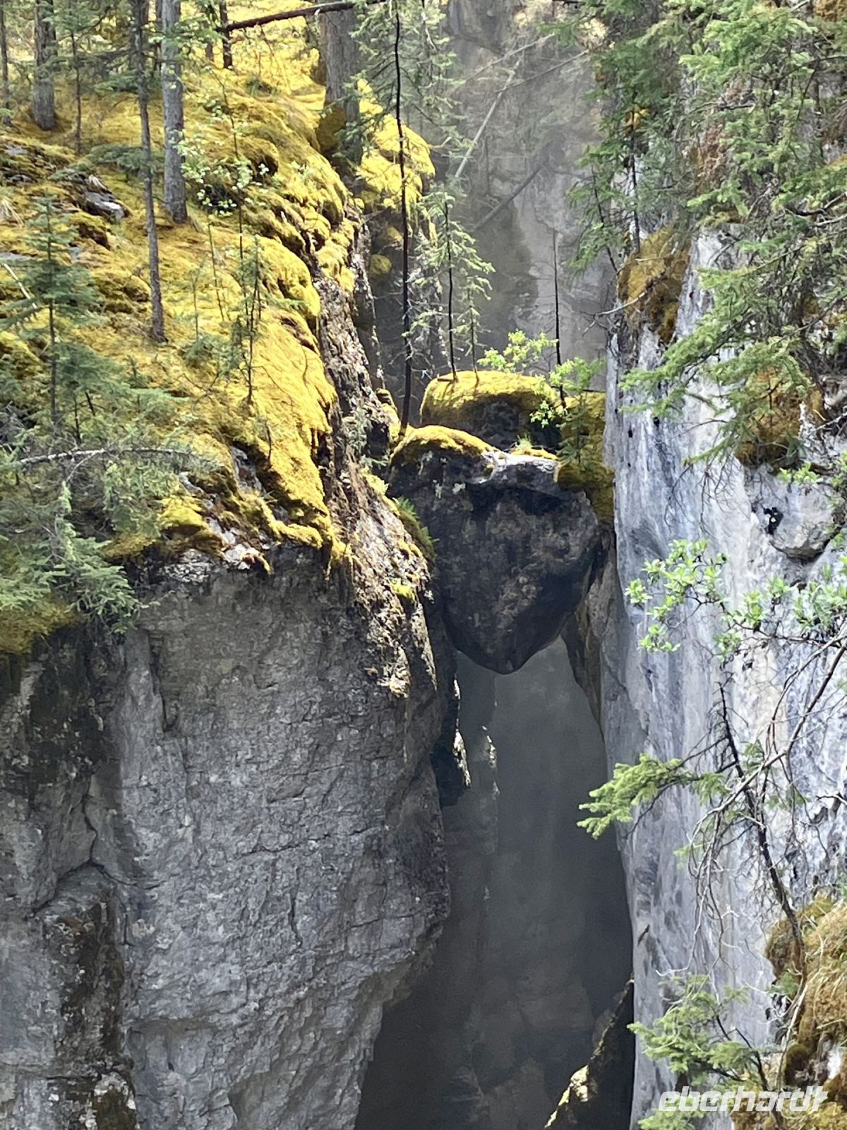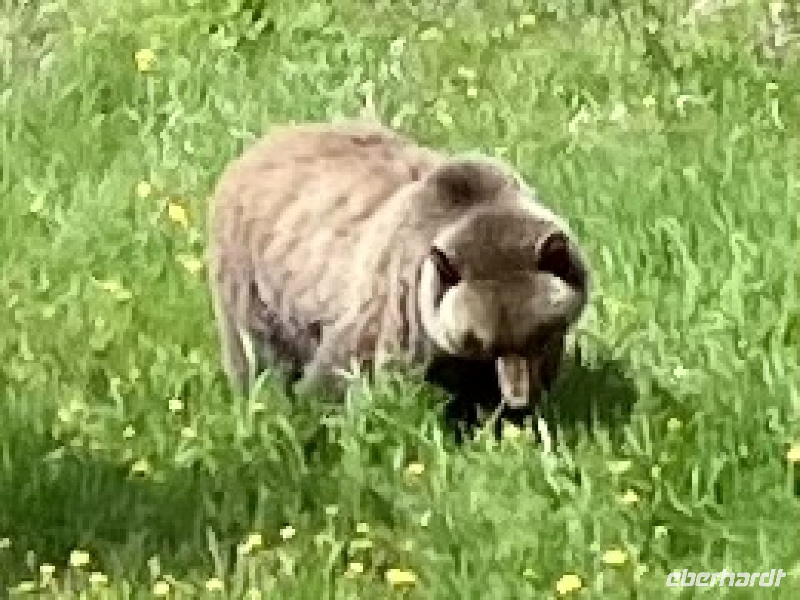 Wie schoen hier in Jasper aufwachen zu duerfen. Bing, macht mein Handy, schau hinein, ein Whatsup von unserer Gruppe. Ach ja, ein Paar hat bereits heute in der Frueh einen Schwarzbaeren vor ihrem Zimmer gesichtet und fotografiert. WOW. Nach dem Fruehstueck wollen wir nun gleich nach Jasper fahren. Halt…da steht ein Grizzly gleich am Strassenrand. Er ist sehr beschaeftigt frische junge Grasshalme zu fressen und kann sich nicht um die Auto-schar und einen Bus kuemmern. Der Grizzly ist hell braun mit einem dunkel braunen Strich auf dem Ruecken. Ein Paradestueck. Wir schauen zu bis der Parkwaechter kommt und uns alle verscheucht. Weiter gehts nach Jasper und danach in die Maligne Schlucht. Einige unter uns wandern die 1 1/2 Stunden den Schluchtweg hinauf und andere spazieren oben eine gute 1/2 Stunde. Es ist ein sehr fotogener Morgen, der reissende Maligne-Fluss, seine Schluchten, seine Wasserfaelle, die Marmiten und die misterioesen Zu- und Abfluesse sind alle sehr beliebte Motive. Ein “to go” Kaffee danach fahren wir weiter. Bei Medicin Lake halten wir nun an um den Kurs 101 Inukshuk-Bau zu absolvieren. Ja, wir haben die Eberhardt Freiluft Galerie 2024 eroeffnet und unsere Kunstwerke kann man, ohne Aufpreis besuchen.
