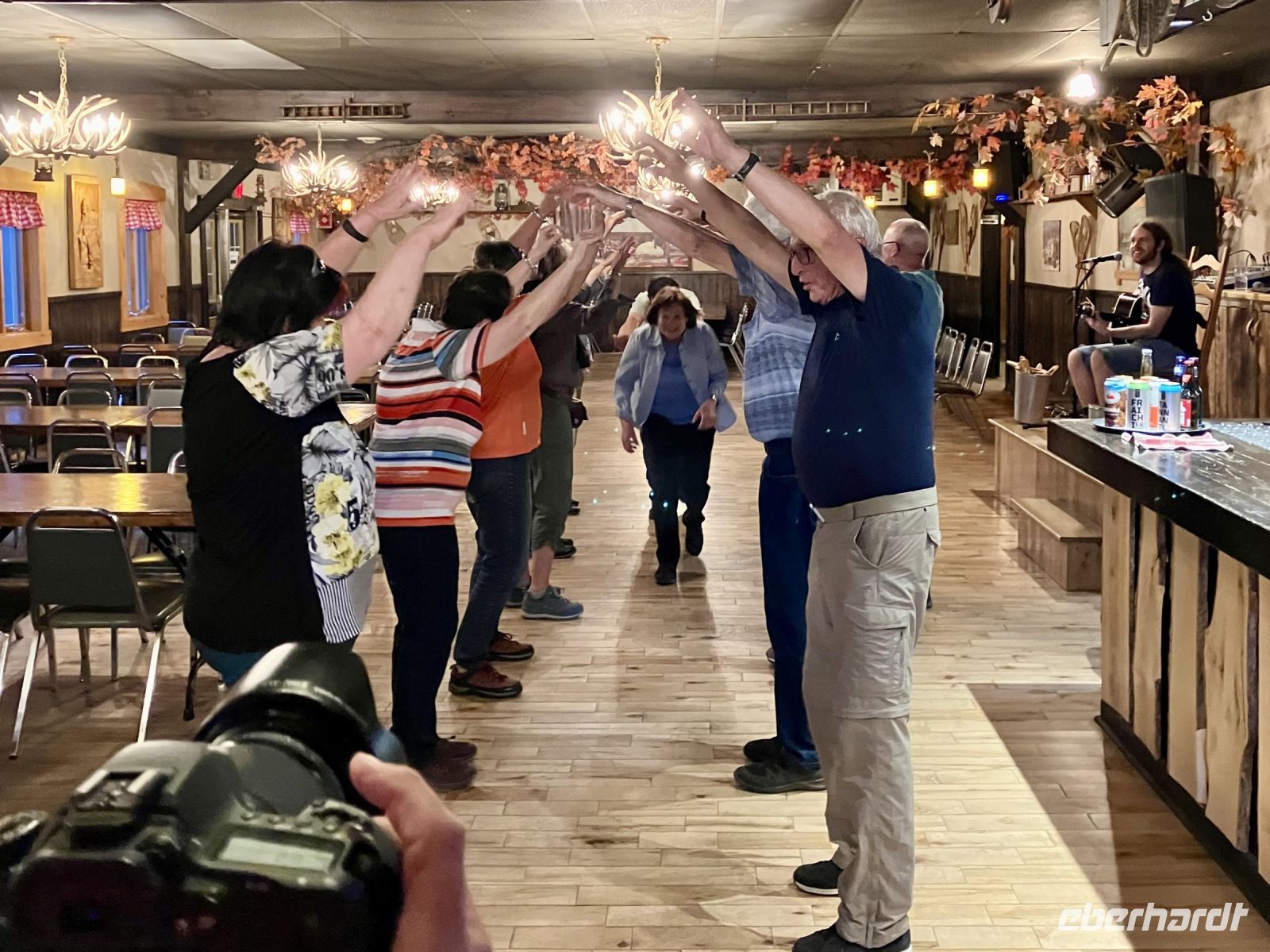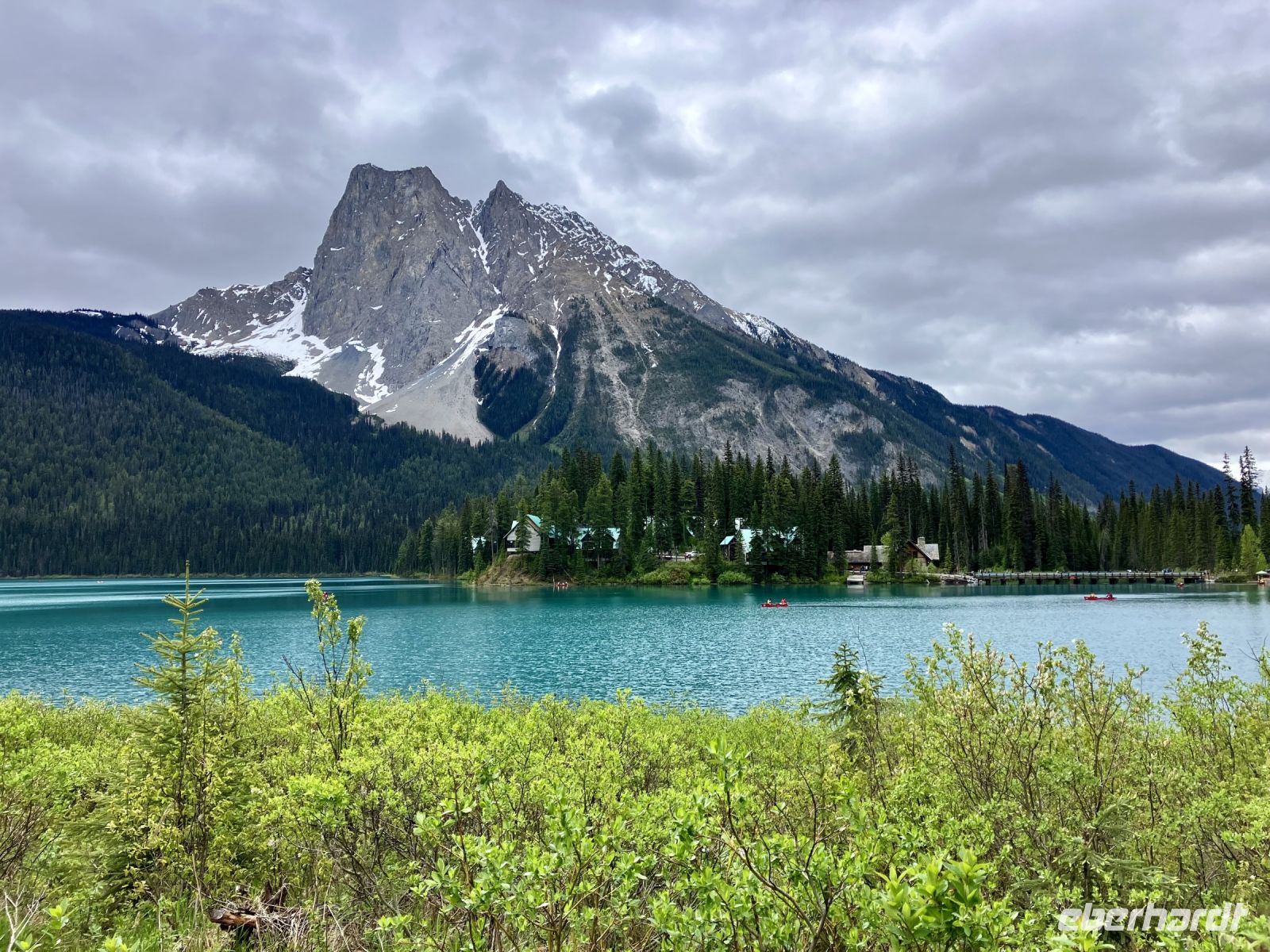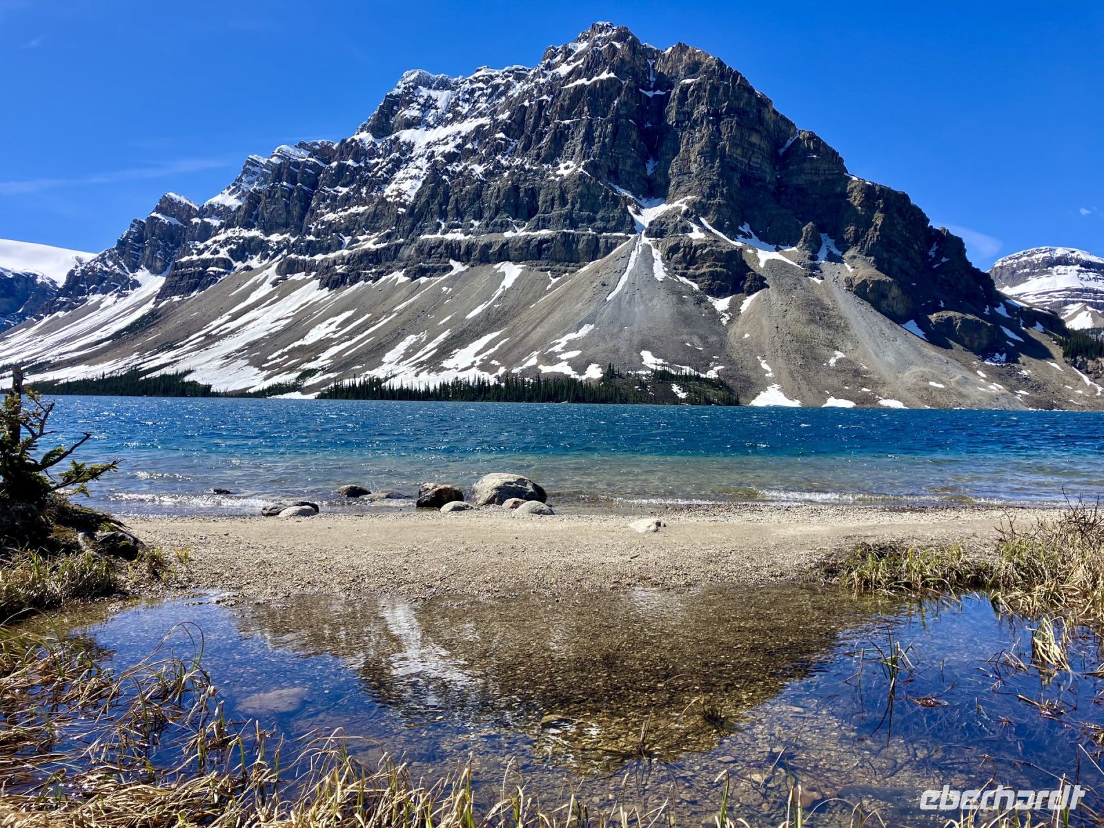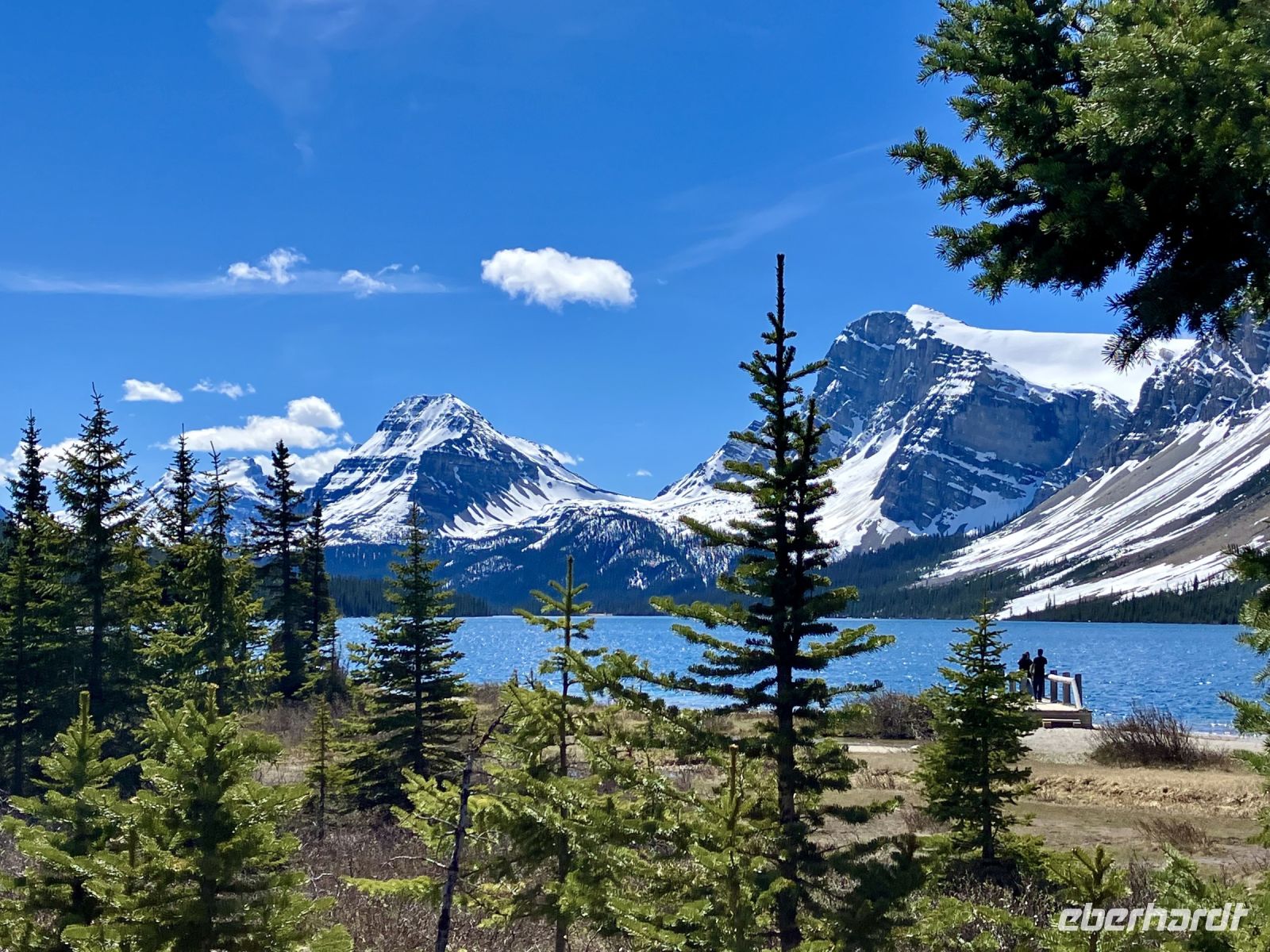 Wie schoen hier in Jasper aufwachen zu duerfen. Bing, macht mein Handy, schau hinein, ein Whatsup von unserer Gruppe. Ach ja, ein Paar hat bereits heute in der Frueh einen Schwarzbaeren vor ihrem Zimmer gesichtet und fotografiert. WOW. Nach dem Fruehstueck wollen wir nun gleich nach Jasper fahren. Halt…da steht ein Grizzly gleich am Strassenrand. Er ist sehr beschaeftigt frische junge Grasshalme zu fressen und kann sich nicht um die Auto-schar und einen Bus kuemmern. Der Grizzly ist hell braun mit einem dunkel braunen Strich auf dem Ruecken. Ein Paradestueck. Wir schauen zu bis der Parkwaechter kommt und uns alle verscheucht. Weiter gehts nach Jasper und danach in die Maligne Schlucht. Einige unter uns wandern die 1 1/2 Stunden den Schluchtweg hinauf und andere spazieren oben eine gute 1/2 Stunde. Es ist ein sehr fotogener Morgen, der reissende Maligne-Fluss, seine Schluchten, seine Wasserfaelle, die Marmiten und die misterioesen Zu- und Abfluesse sind alle sehr beliebte Motive. Ein “to go” Kaffee danach fahren wir weiter. Bei Medicin Lake halten wir nun an um den Kurs 101 Inukshuk-Bau zu absolvieren. Ja, wir haben die Eberhardt Freiluft Galerie 2024 eroeffnet und unsere Kunstwerke kann man, ohne Aufpreis besuchen.