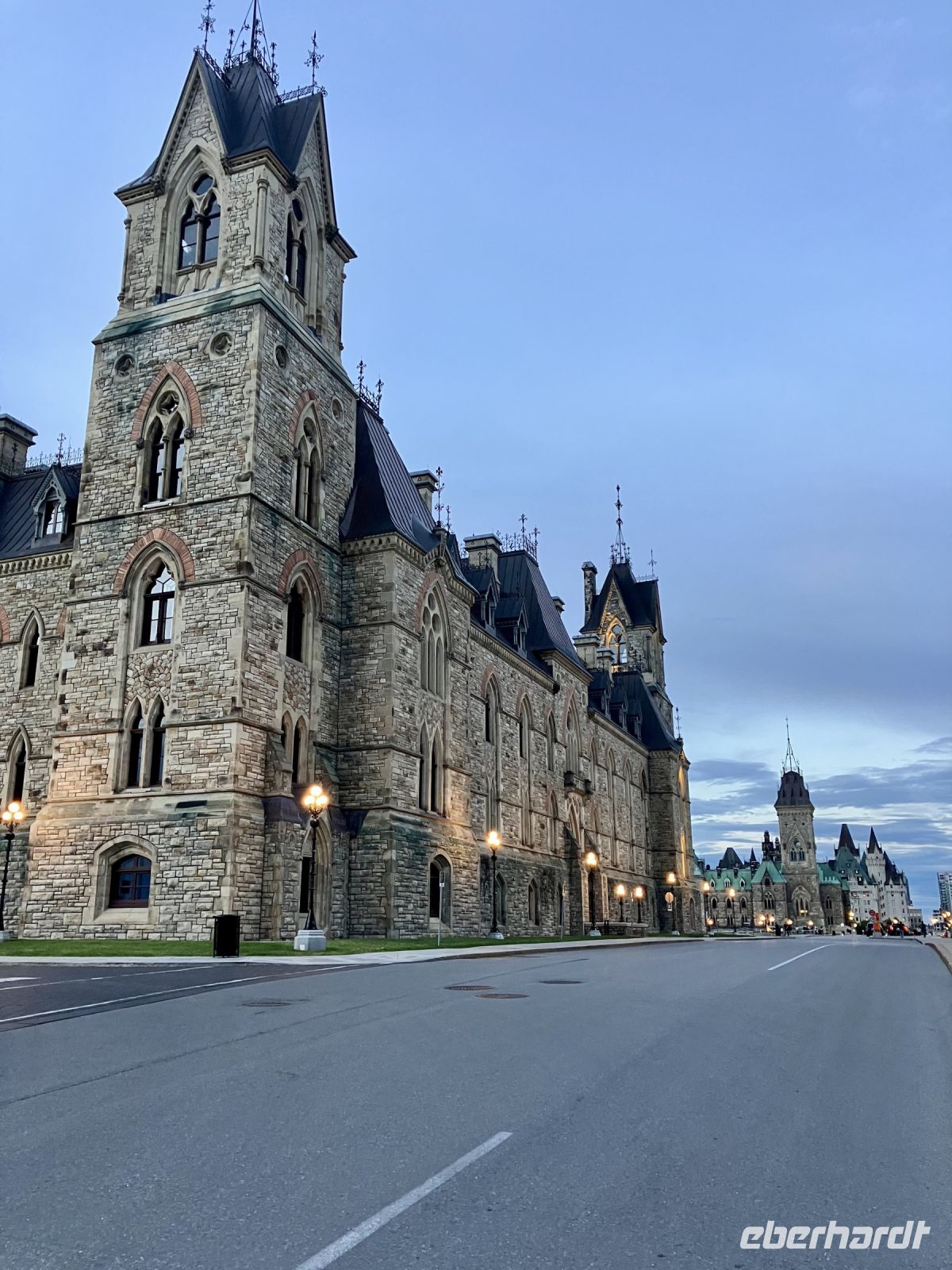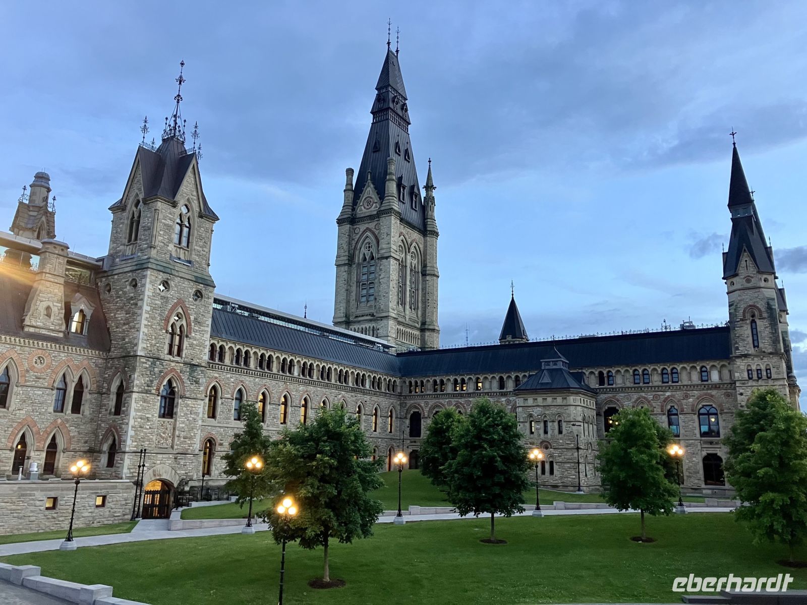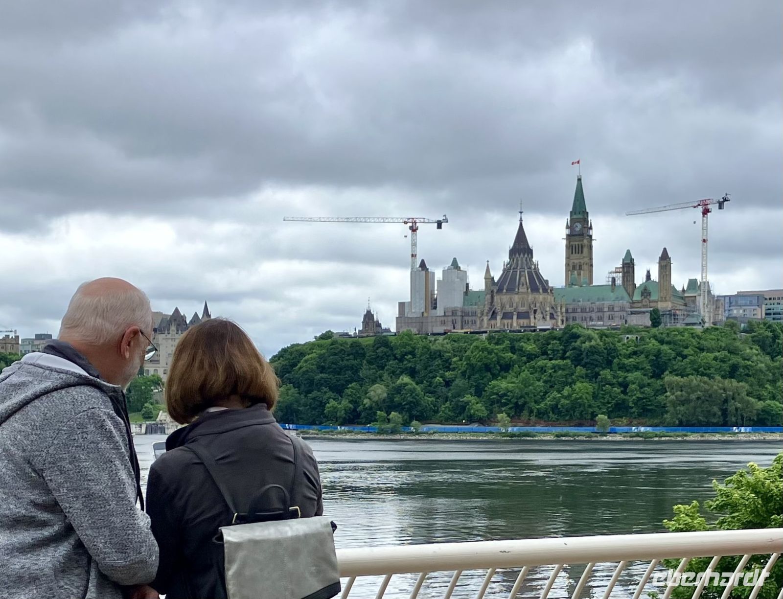 Heute muessen wir etwas frueher los, da die Reise von Quebec ueber Montreal nach Ottawa doch lange ist. Im Bus haben wir heute Zeit um die Photos aufzuarbeiten, das mitgebrachte Buch zu lesen, auszuruhen, whatsups an die Lieben zuhause vorzubereiten, einige interessante Themen durchzunehmen und Geschichten zuzuhoeren. Wir wollen uns auch mal einfach so miteinander unterhalten und besser kennen lernen. So vergehen die 4 Stunden wie im Fluge und wir sind bereits im Chateau Montebello. Dieses 5-Sterne Hotel ist ein besonders schoenes Blockhaus und wir sind die gluecklichen, die hier Mittagessen duerfen. Danach gehts gleich weiter zum Omega Park. Dieser kanadische Safari-Park ist genial. 12 Km schlaengeln wir mit einem Safari-Bus durch 900 Hektar Land und sehen Hirsche aller Arten, Elche, Bisons, Caribou, Baeren, Woelfe, Wildscheine sowie Schneeziegen, Berggeissen, Fuechse usw. Nun wissen wir genau, was wir in den Rockies naechste Woche nochmals in freier Wildbahn sehen moechten. Ein genialer Wildpark. Wir wollen aber weiter in die Hauptstadt Kanadas, nach Ottawa. Es ist nicht mehr weit, da sind wir schon im gruenen Ottawa. Auch hier ist unser Hotel sehr zentral, gleich neben dem Parlament, gelegen. Stephanie, unsere Ottawa Reiseleiterin, findet uns auch bald und sie zeigt uns die Regierungsgebaeude, das 5 Sterne Hotel Chateau Laurier, den beruehmten Rideau Kanal mit seinen Schleusen und Geschichten. Wir gehen und fahren an vielen Monumente, Brunnen, Statuen vorbei. Sehen das National Museum und seine atemberaubende Sicht ueber den Rideau Fluss auf das Parlamentsgebaeude und das Chateau Laurier. Danach faehrt uns Paul auch auf die Strasse der Botschaften und wir staunen ueber die maechtigen Villen der Residenzen. Am Abend spazieren alle noch ein wenig in der schoenen Stadt herum um das beleuchtet Parlament auf ewig fotografisch festzuhalten.