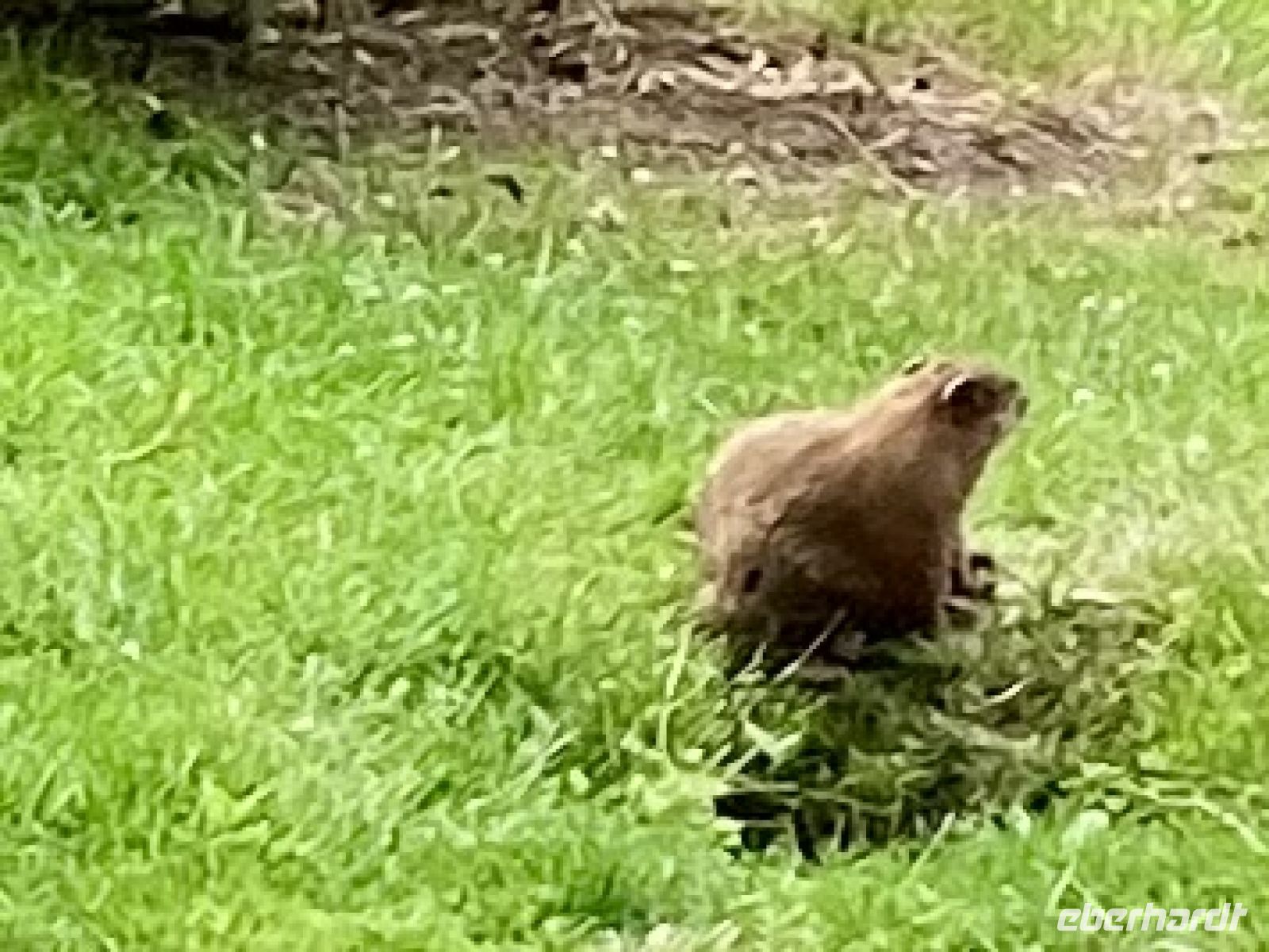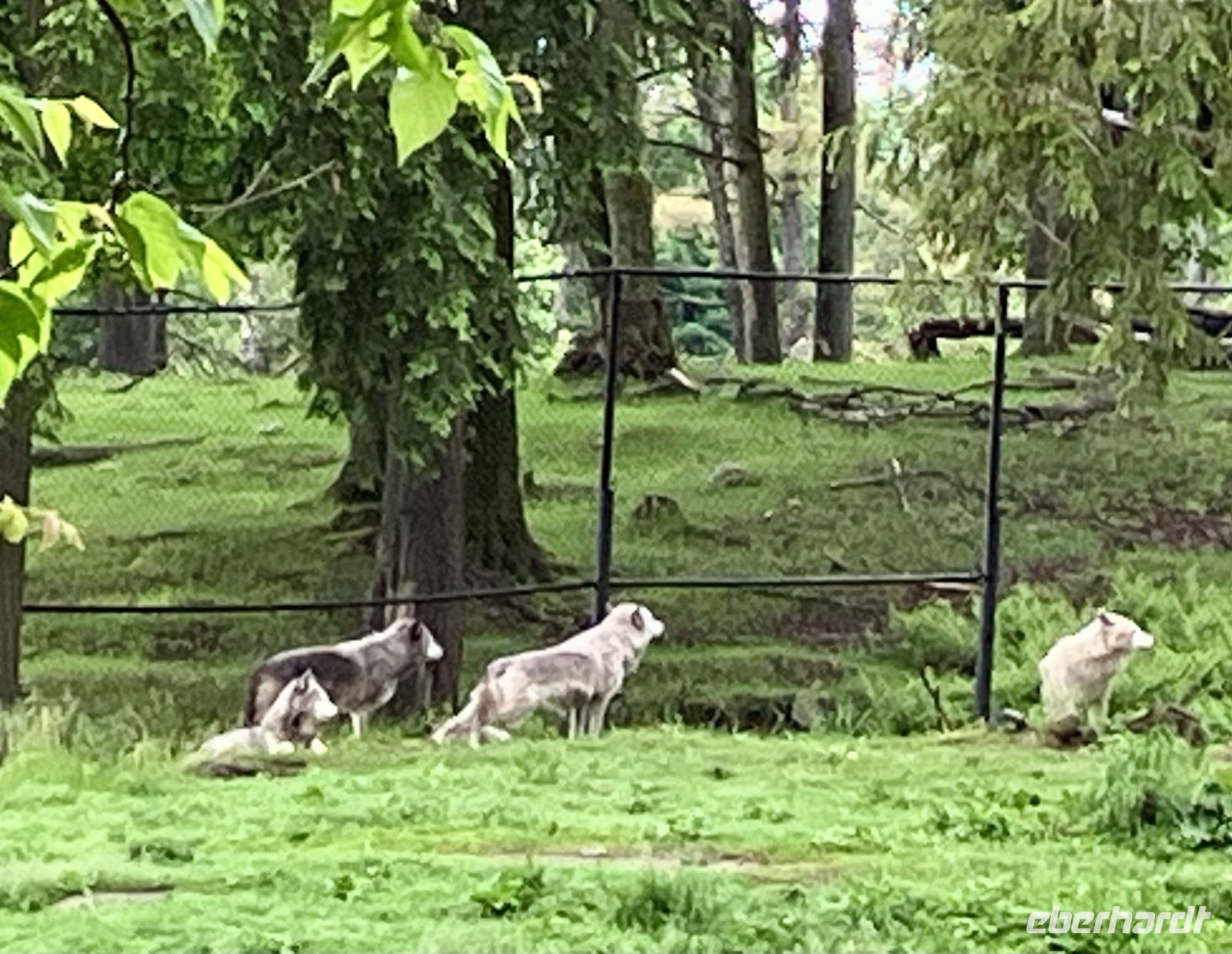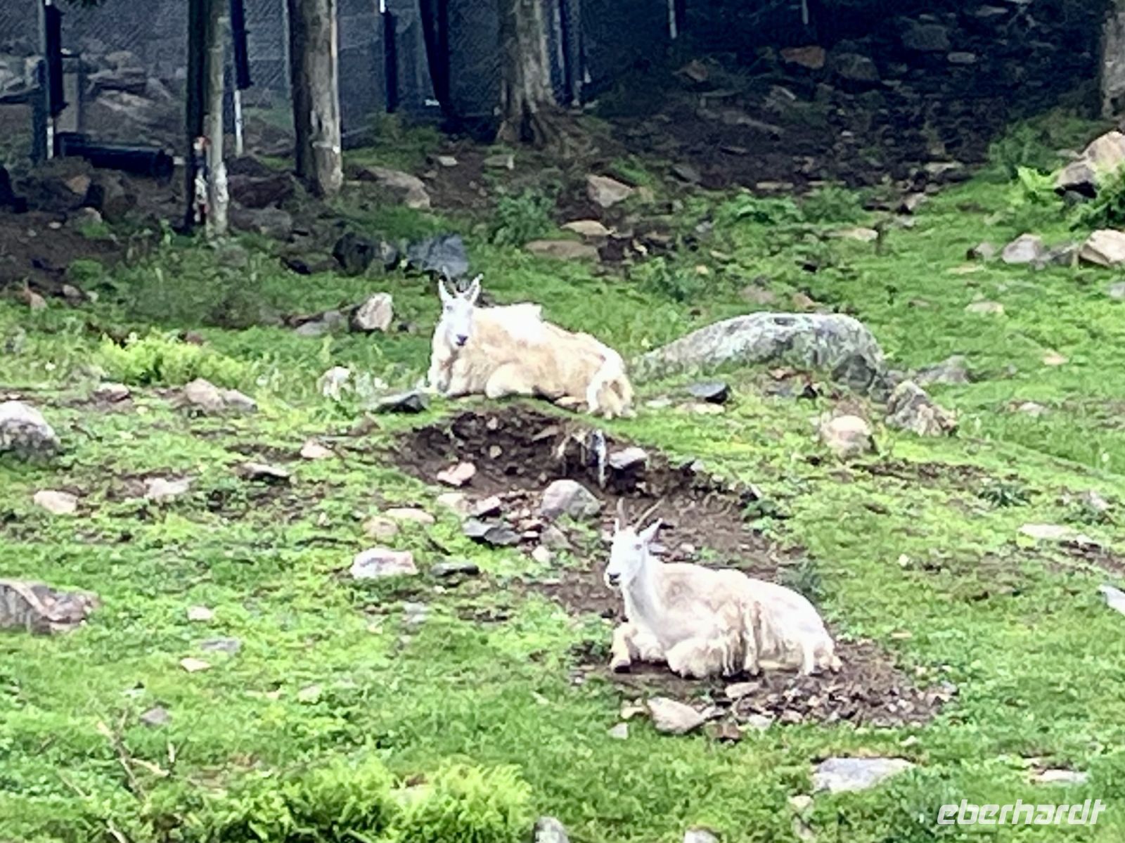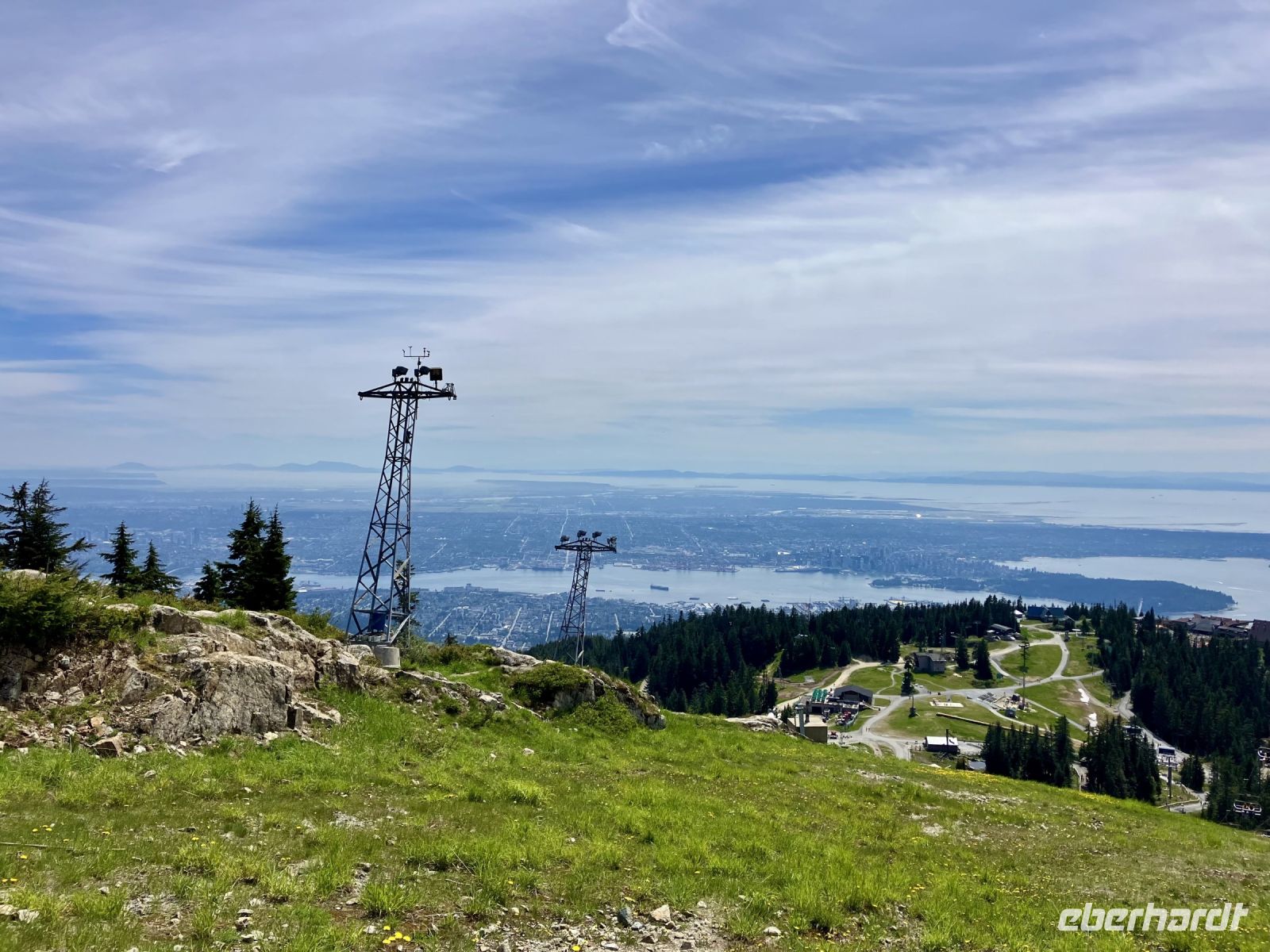 Hier oben spazieren wir auch gleich zu der Holzhacker-Show, die leider bereits in der letzten Runde ist. Also ab zum Sessellifte und hinauf auf Grouse Mountain Peak. Was fuer eine tolle Sicht auf des grosse Vancouver. Der Lift geht soooo langsam, man koennte schneller runterlaufen. Aber sitzend haben wir eine bessere Aussicht. Vieles haben wir bereits ueber die zwei Waisengrizzly Grinder und Coola gehoert. Die beiden wurden vor 20 Jahren hier aufgenommen und leben seither in einem grossen Gehege hier oben. Bei genauerem Hingucken finden wir auch Coola, er sitzt im Gebuesch und zeigt uns bloss seinen schoenen Kopf mit den runden Ohren und der niedlichen, wenn auch enormen, Nase. Grinder ist momentan nicht zu sehen. Bloss spaeter wird er gesichtet auf einem Huegel des Geheges stehend. Es ist so warm, dass die beiden sich eher im Dickicht des Waldes aufhalten. Ein paar Fotos koennen wir knipsen aber die Grizzlies in den Rockies, bei Jasper, an jene denken wir alle. Wir hatten ja so ein enormes Glueck.