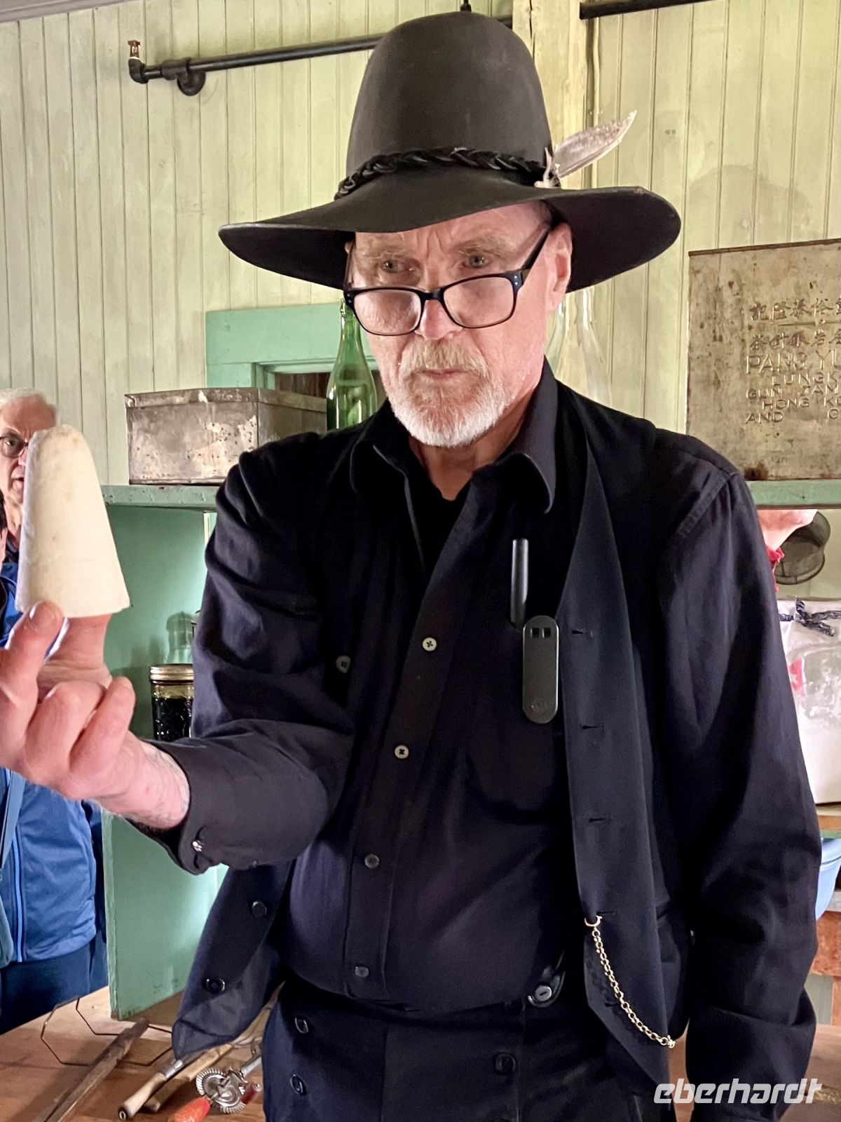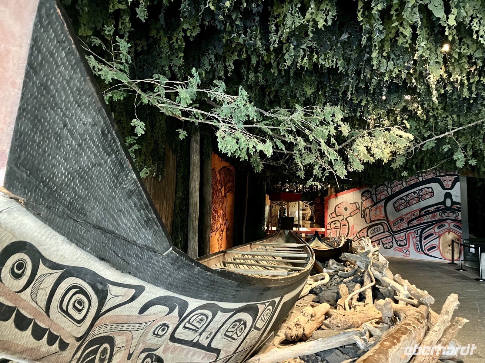 Craig, der Museumsfuehrer nimmt uns gleich an der Hand und fuehrt uns vorerst zum Schmidt der gerade einen schoenen Nagel schmiedet und fuehrt uns danach ins Hotel weiter. Er ist in Epochen Bekleidung, zeigt uns den Saloon, den Parlour, die Kueche und die Zimmer dieses Gebaeudes. Noch einen Blick ins Nebenhaus wo der damalige Besitzer dieses Hotels mit seinen 11 Kinder und Squaw-Frau gewohnt haben. Ach schau, da ist ja Lucille, sie fuehrt uns nun ins Leben der Sushwap First Nations ein. Lucille ist eigentlich in die Lillooet Nation geboren, gehoert nun aber durch Heirat auch dem Bonaparte Clan der Shushwap Nation an. Sie fuehrt uns in ein Tepeeh und spricht ueber ihre Lebensweisen und Gepflogenheiten. Nach einem gemeinsamen Spaziergang zeigt sie uns stolz auch ein Kekuli. Es ist die Winterbehausung der Sippe. Wir duerfen auch hinein und uns das anschauen und fotografieren. Alles ist sehr interessant und schoen aber der Magen knurrt und die Staeks sind bereits auf dem Grill. Also, gehts zum Restaurant und wir geniessen das schoene Essen. Nun nieselt es ein wenig, also sitzen wir draussen unter Dach. Da wir heute noch nach Whistler fahren werden, verabschieden wir uns nach 2 1/2 Stunden Aufenthalt und machen mal ein Nickerchen im Bus, bis wir zum Fraser Canyon kommen. Toll wie sich hier dieser grosse Fluss sein Bett so tief gegraben hat. Eine herrliche Fahrt. Am Seton Lake, gleich nach Lillooet halten wir an, da wir nun eine kleine Whisky Pause brauchen. Ja, es gibt auch kanadischen Whisky und er schmeckt sogar lecker ohne Halskratzen. Mit der tollen Aussicht und dem Deko Holz schmeckt er noch besser. Der Whisky kommt aus dem Keller von Wayne Gretzky in Niagara on the lake, wo wir letzte Woche waren. Bald darauf fahren wir weiter auf der Duffey Lake Road nach Whistler. Es ist unterdessen schon spaet Nachmittag wir eilen in die Zimmer damit wir auch auf der Fussgaengerzone ein geeignetes Restaurant finden. Heute darf naemlich jeder essen was und wann er moechte. Es ist ein schoener Abend, die Zimmer sind auch hier in dieser Skistation aeusserst bequem und gross, und die Badetuecher besonders weich wir schlafen wie die Herrgoettchen.
