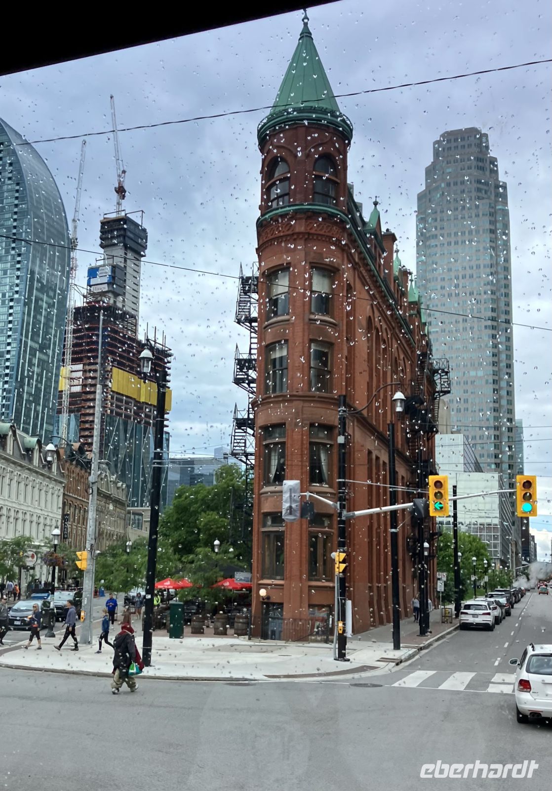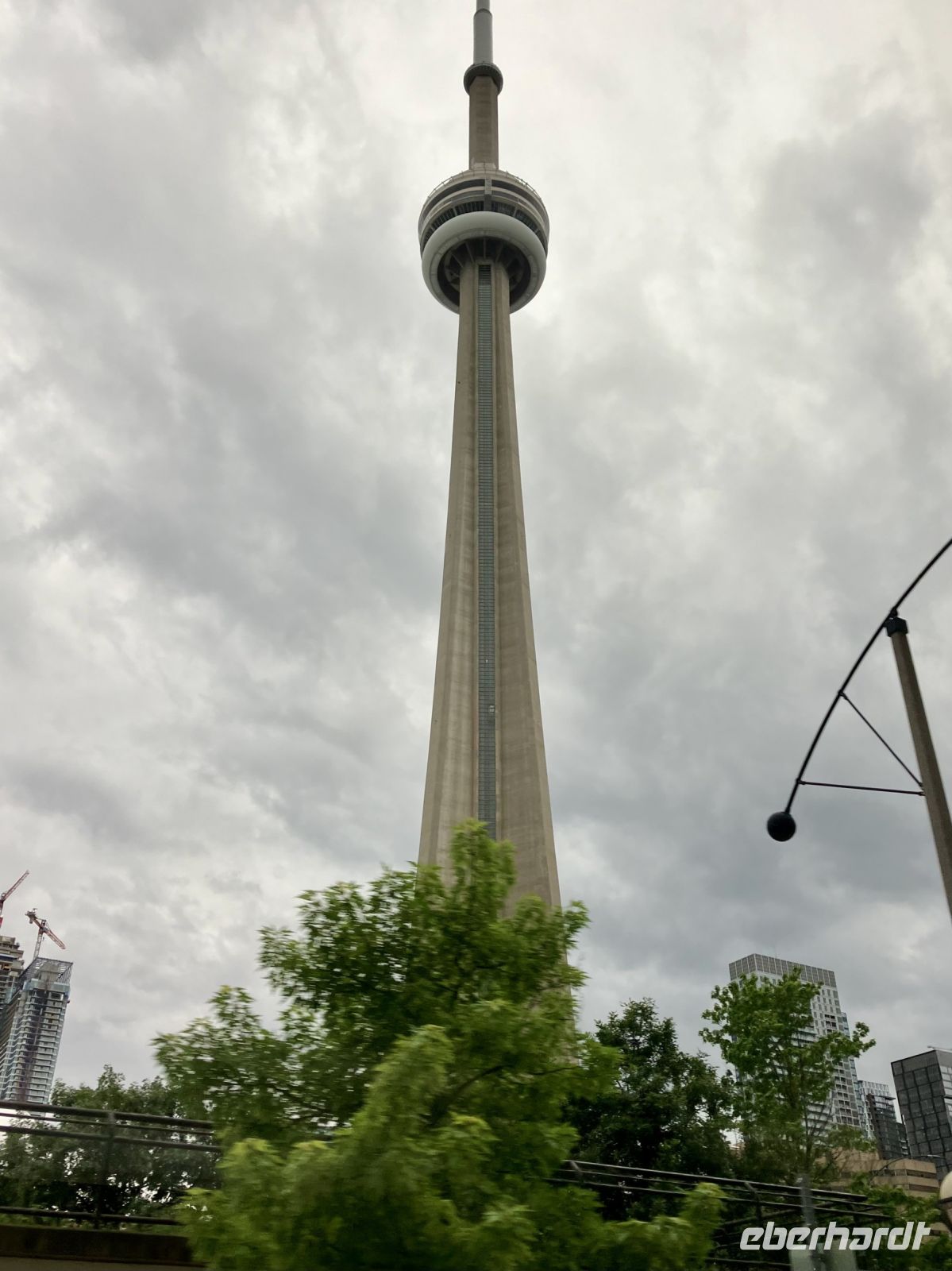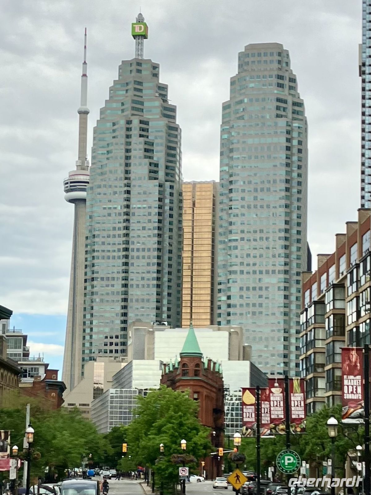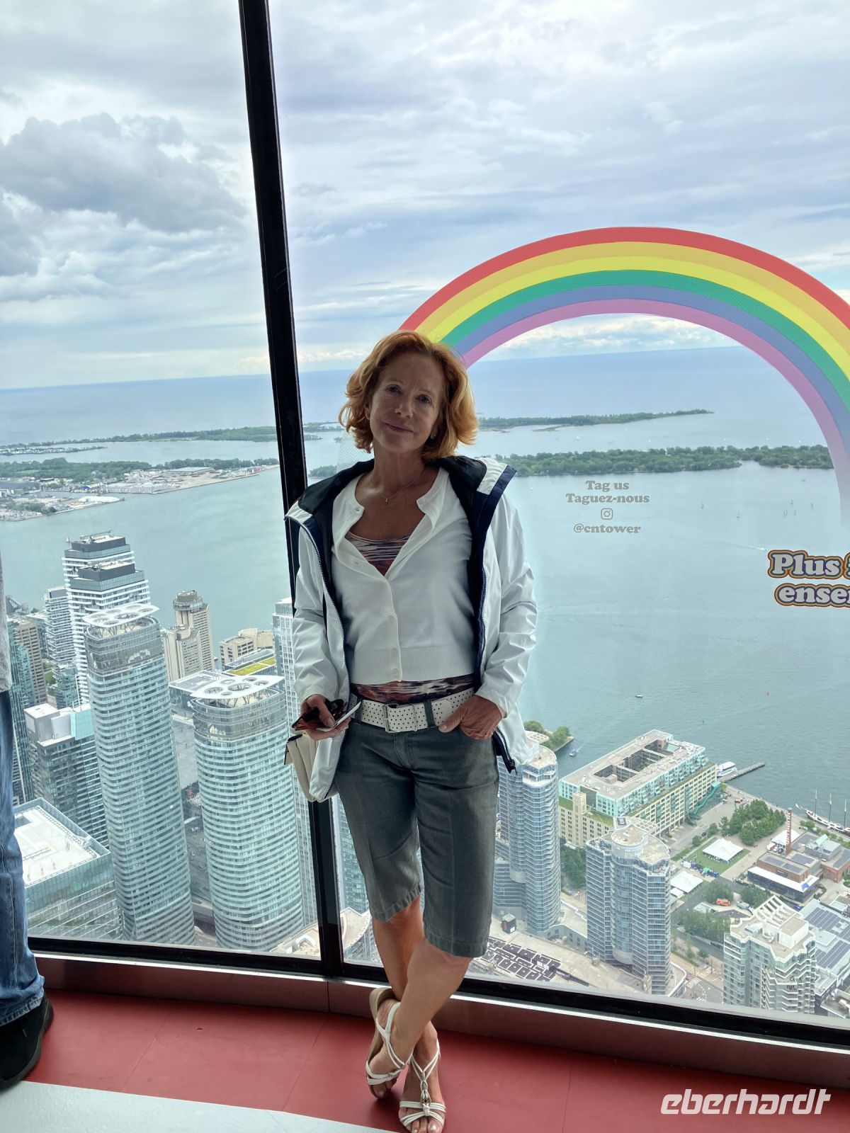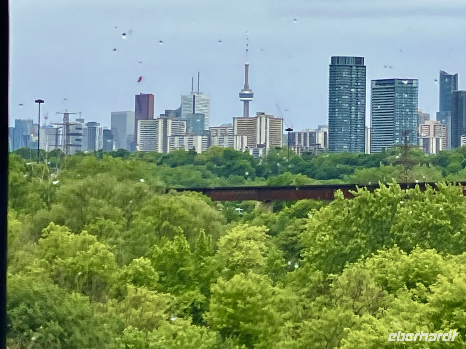 Die Aussicht heute in der Frueh auf die Hochhaeuser Torontos bei Sonnenaufgang vom Zimmer aus ist fantastisch. Schaut die Photogalerie an. Heute steigt Margarith zu uns in den Bus und zeigt uns IHR Toronto. Ploetzlich wird Toronto eine schoene, tolle, lebhafte und interessante Stadt. Sie zeigt uns vorerst das “brave” Viertel. Ja wir steigen auch aus und schauen uns die schoenen Haeuser der 30er Jahre an. Sie erzaehlt uns wie es auch noch in den 60er Jahren war, als sie als junge Schweizerin in diese Stadt zog. Diese Gegend von Bloor und Yorkeville ist sehr lebenswert wir wuerden auch gleich hierher ziehen. So viele Baeume sogar ein Kardinal singt auf einem Ast. Auf unserer Stadtrundfahrt kommen wir nun an riesen Wolkenkratzer vorbei. Ja, sagt Margarith, Verdichtung muss sein und kann auch sehr schoen ausschauen wie hier in Toronto. Ach ja, da sind sie ja auch, alle Luxusgeschaefte sind hier vereint. Na ja, wenn eine kleine Wohnung 1 Million kostet, gibt es auch dementsprechende Laeden. Nun zeigt uns Margarith auch das alte und neue Rathaus, die Universitaetsgegend mit all den schoenen Bauten aus dem fruehen 19. Jhdt. Die Kombination von Alt- und Neubauten ist faszinierend. Die Villen-Gegend mit dem Schloss Casa Loma ist reizend, wir koennten gleich ins “Gartenhaeuschen” einziehen. Der Garten soll anscheinend beheizbar sein ! Nun fahren wir durch Chinatown und gehen dann zu Fuss durch Kensington Town. Kensington ist echt hip, wir denken wir waeren in der Karibik oder sonst wo auf einer suedlichen Insel. Wir fahren auch beim Museum von Franz Gehri vorbei und sehen danach das neue tolle Rathaus von Toronto. Ehe wir zum CN Tower kommen fahren wir noch am Hafen entlang und vorbei dem Bahnhof . Als Abschluss dieser schoenen Stadtrundfahrt fahren wir nun auf den CN Tower hinauf. Der Blick von da oben bleibt uns auf Ewigkeit erhalten. Heute Nachmittag ist Programm-los. Die Wolken zeigen sich etwas dichter und wir haben alle erst mal Durst und auch Hunger. Ich wollte mit der Gruppe auf Toronto Island fahren aber leider schuettet es nun wie aus Kuebeln und das geplante Nachmittagsprogramm muss gestrichen werden. Wir entdecken anstatt dessen die unterirdische Stadt, gehen da ein wenig entlang aber entscheiden uns dann doch fuer Helligkeit auch wenn wir von Regen uebergossen werden. Nun gehen einige noch schwimmen, andere ruhen sich aus andere wieder gehen in die Markthallte und bestaunen dort die riesen Tomahawk Steaks und so klingt dieser Tag dann doch bei Sonnenschein aus. Der Tag war sehr interessant und abwechslungsreich, die Betten superb und die Traeume persoenlich.