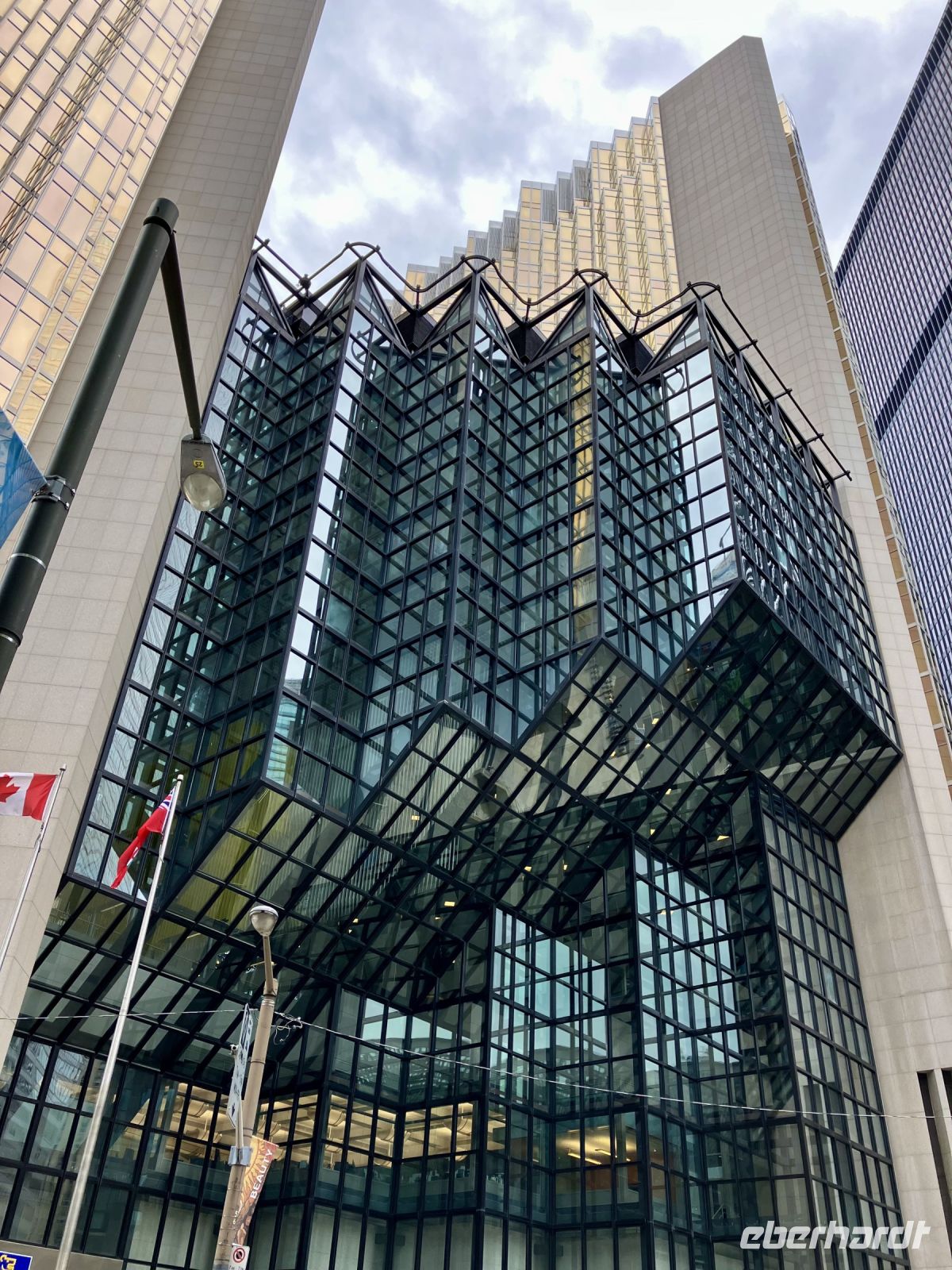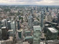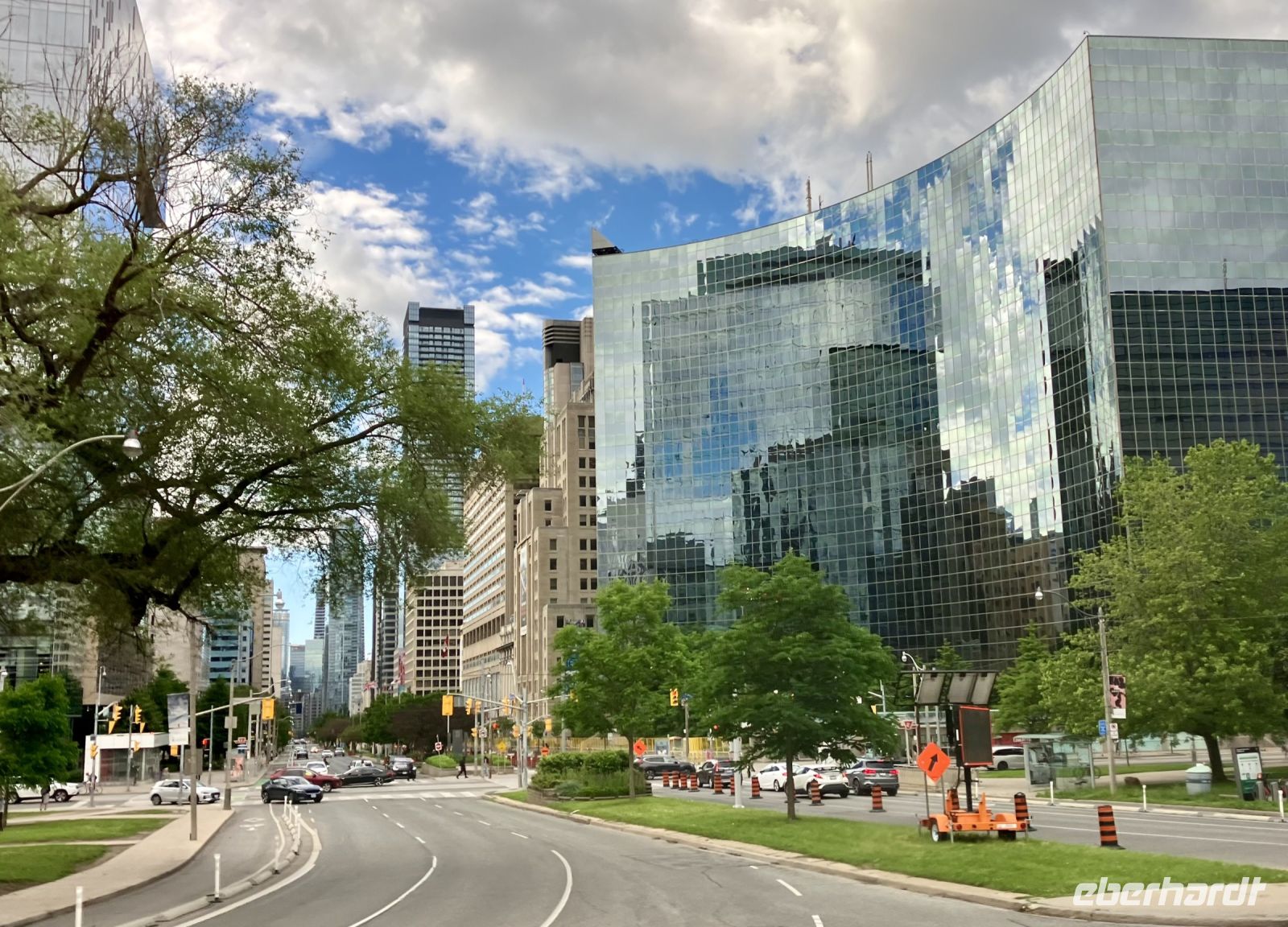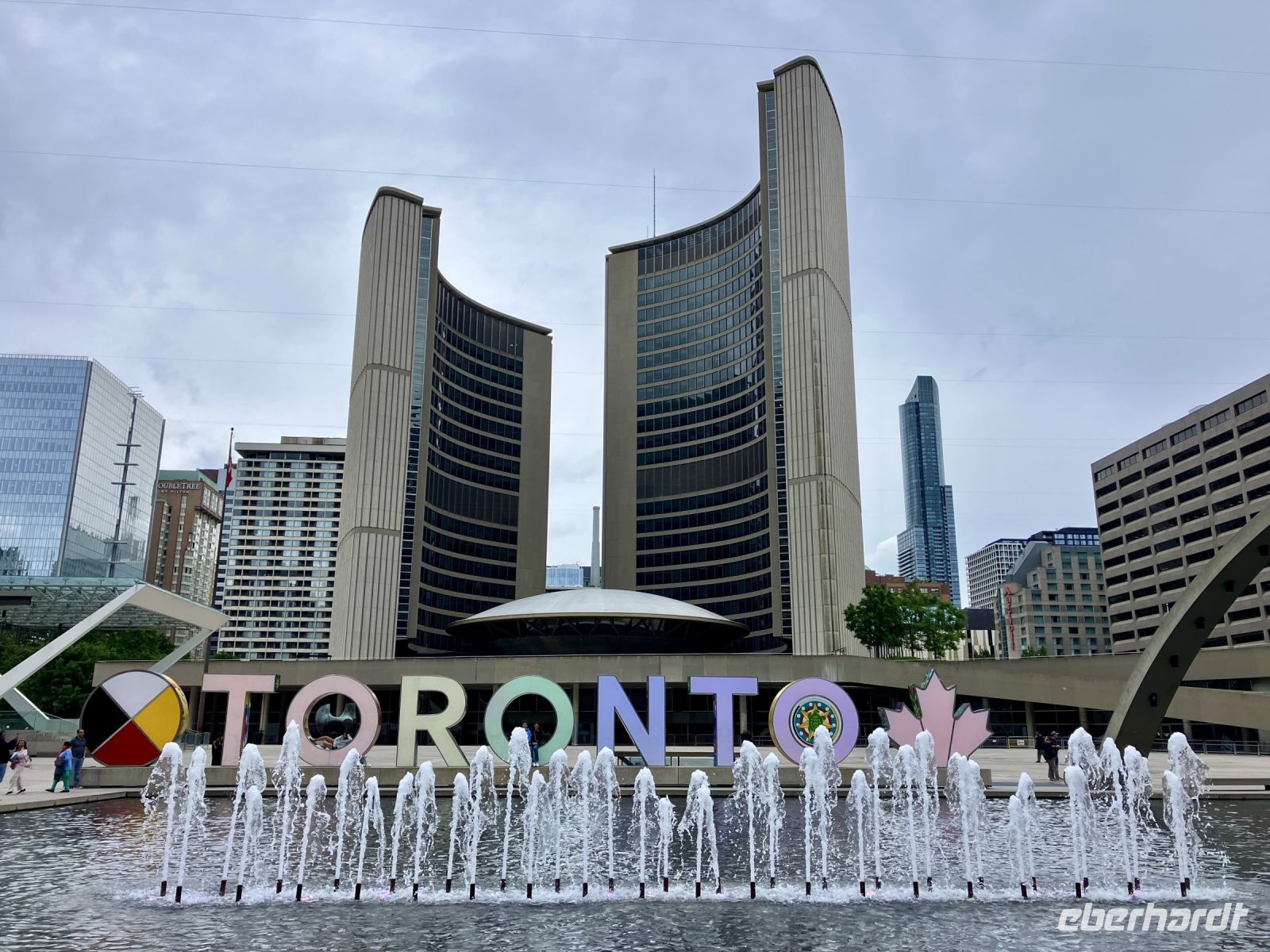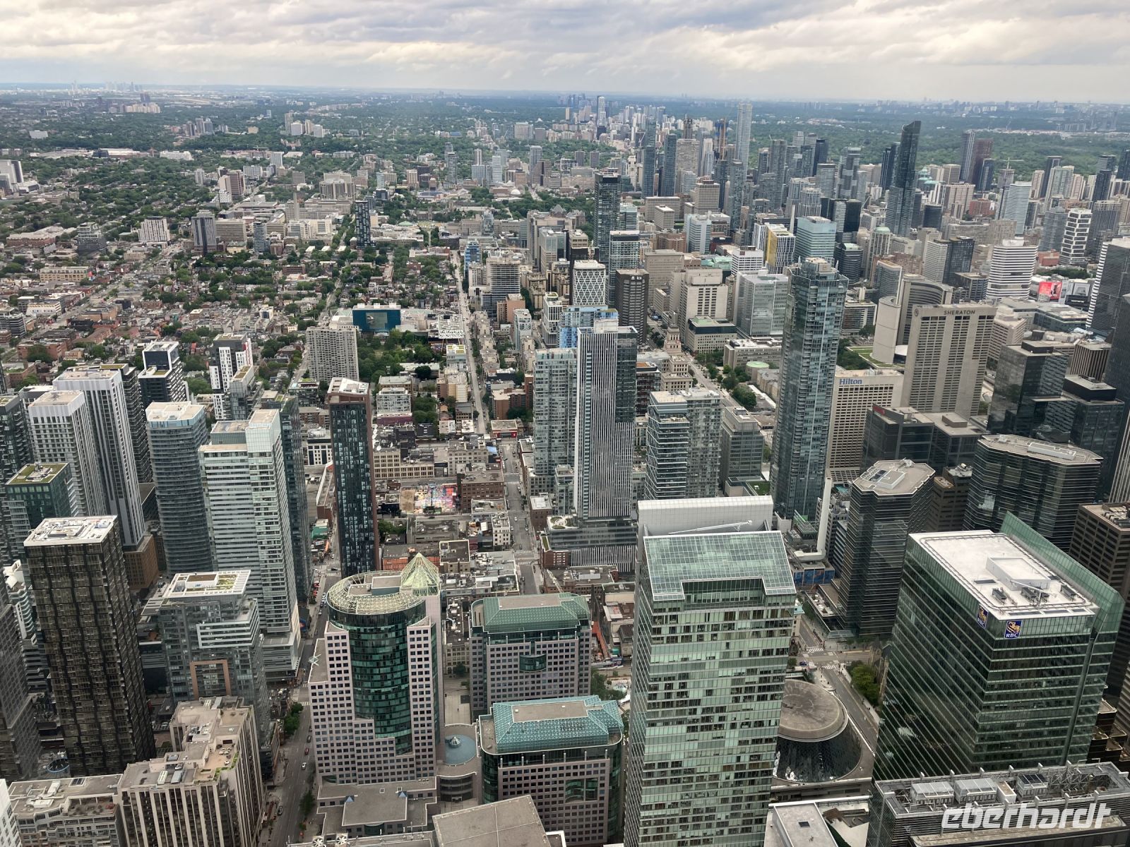 Die Aussicht heute in der Frueh auf die Hochhaeuser Torontos bei Sonnenaufgang vom Zimmer aus ist fantastisch. Schaut die Photogalerie an. Heute steigt Margarith zu uns in den Bus und zeigt uns IHR Toronto. Ploetzlich wird Toronto eine schoene, tolle, lebhafte und interessante Stadt. Sie zeigt uns vorerst das “brave” Viertel. Ja wir steigen auch aus und schauen uns die schoenen Haeuser der 30er Jahre an. Sie erzaehlt uns wie es auch noch in den 60er Jahren war, als sie als junge Schweizerin in diese Stadt zog. Diese Gegend von Bloor und Yorkeville ist sehr lebenswert wir wuerden auch gleich hierher ziehen. So viele Baeume sogar ein Kardinal singt auf einem Ast. Auf unserer Stadtrundfahrt kommen wir nun an riesen Wolkenkratzer vorbei. Ja, sagt Margarith, Verdichtung muss sein und kann auch sehr schoen ausschauen wie hier in Toronto. Ach ja, da sind sie ja auch, alle Luxusgeschaefte sind hier vereint. Na ja, wenn eine kleine Wohnung 1 Million kostet, gibt es auch dementsprechende Laeden. Nun zeigt uns Margarith auch das alte und neue Rathaus, die Universitaetsgegend mit all den schoenen Bauten aus dem fruehen 19. Jhdt. Die Kombination von Alt- und Neubauten ist faszinierend. Die Villen-Gegend mit dem Schloss Casa Loma ist reizend, wir koennten gleich ins “Gartenhaeuschen” einziehen. Der Garten soll anscheinend beheizbar sein ! Nun fahren wir durch Chinatown und gehen dann zu Fuss durch Kensington Town. Kensington ist echt hip, wir denken wir waeren in der Karibik oder sonst wo auf einer suedlichen Insel. Wir fahren auch beim Museum von Franz Gehri vorbei und sehen danach das neue tolle Rathaus von Toronto. Ehe wir zum CN Tower kommen fahren wir noch am Hafen entlang und vorbei dem Bahnhof . Als Abschluss dieser schoenen Stadtrundfahrt fahren wir nun auf den CN Tower hinauf. Der Blick von da oben bleibt uns auf Ewigkeit erhalten. Heute Nachmittag ist Programm-los. Die Wolken zeigen sich etwas dichter und wir haben alle erst mal Durst und auch Hunger. Ich wollte mit der Gruppe auf Toronto Island fahren aber leider schuettet es nun wie aus Kuebeln und das geplante Nachmittagsprogramm muss gestrichen werden. Wir entdecken anstatt dessen die unterirdische Stadt, gehen da ein wenig entlang aber entscheiden uns dann doch fuer Helligkeit auch wenn wir von Regen uebergossen werden. Nun gehen einige noch schwimmen, andere ruhen sich aus andere wieder gehen in die Markthallte und bestaunen dort die riesen Tomahawk Steaks und so klingt dieser Tag dann doch bei Sonnenschein aus. Der Tag war sehr interessant und abwechslungsreich, die Betten superb und die Traeume persoenlich.