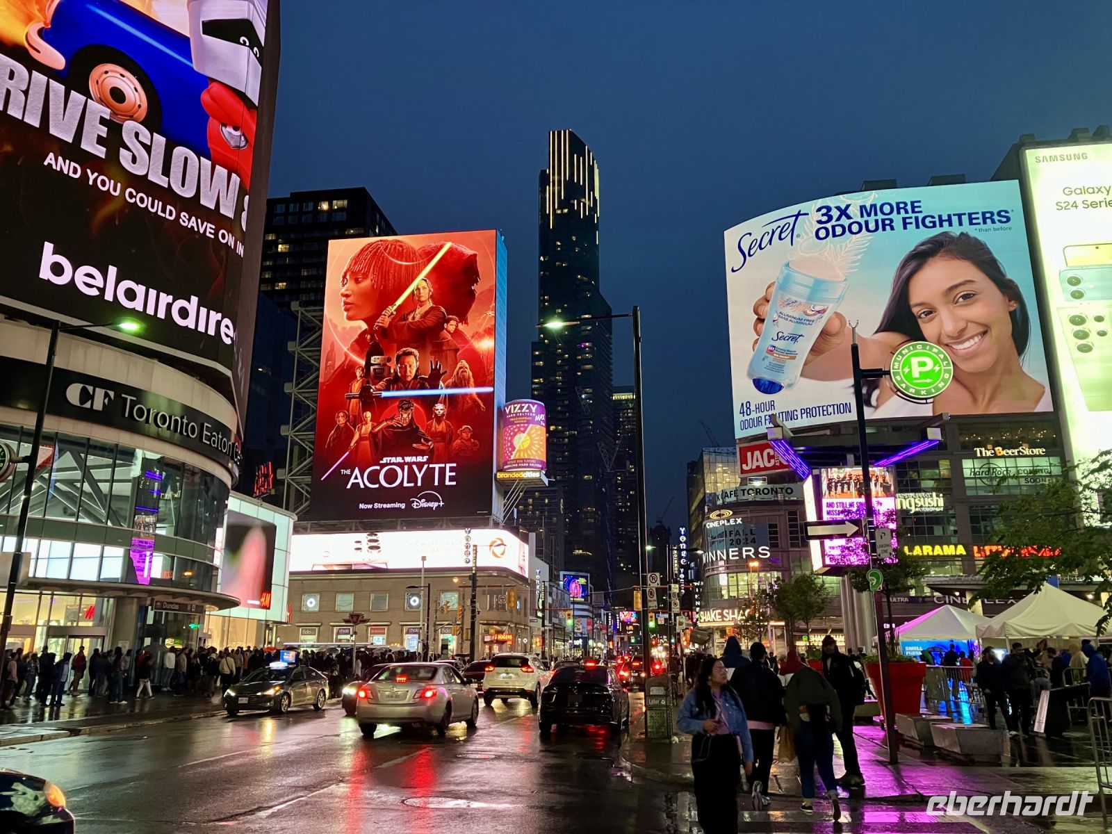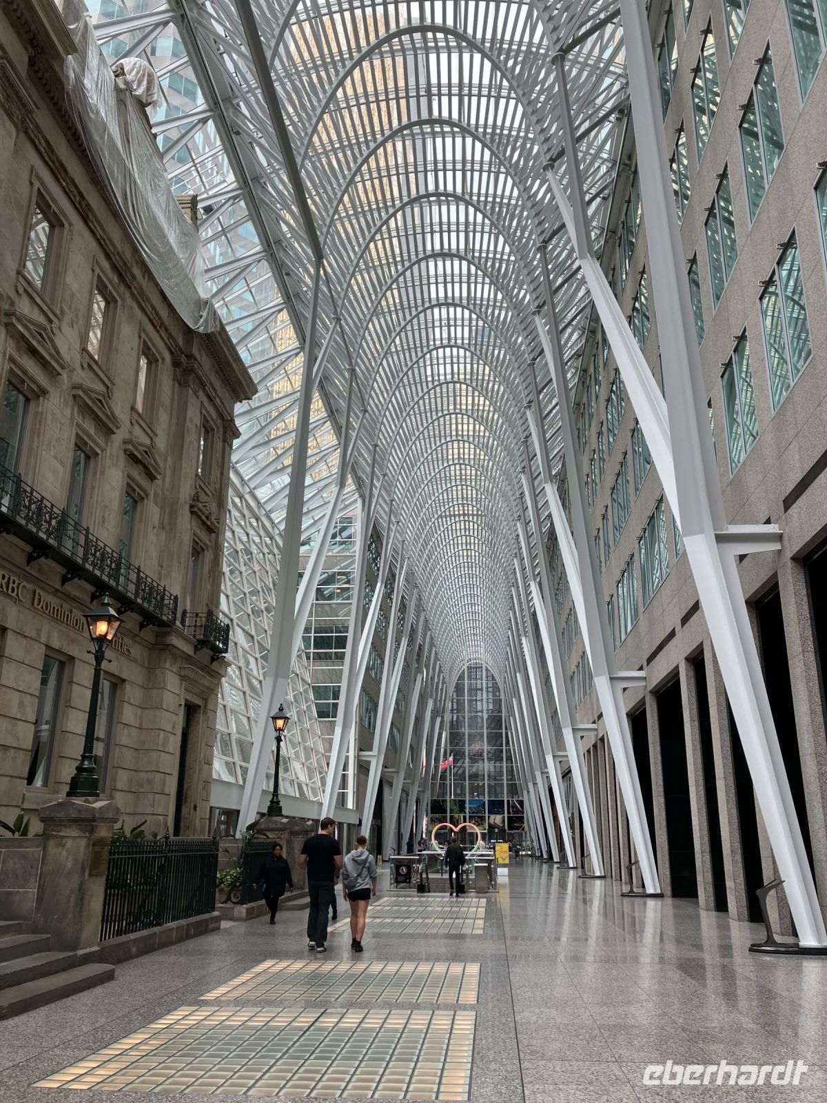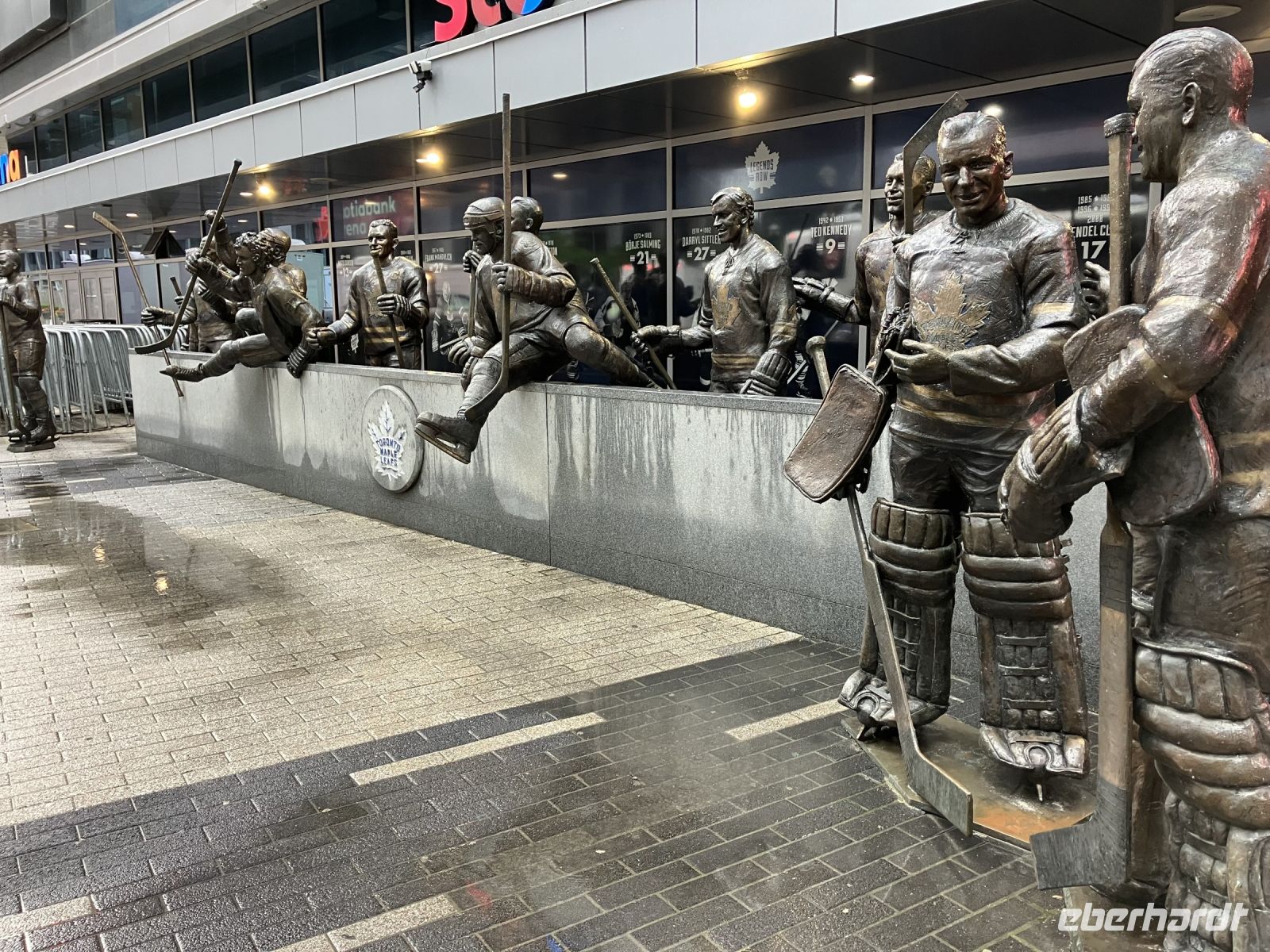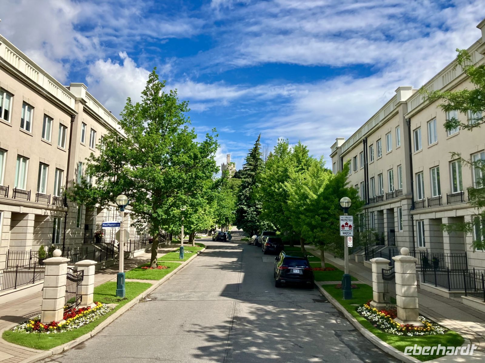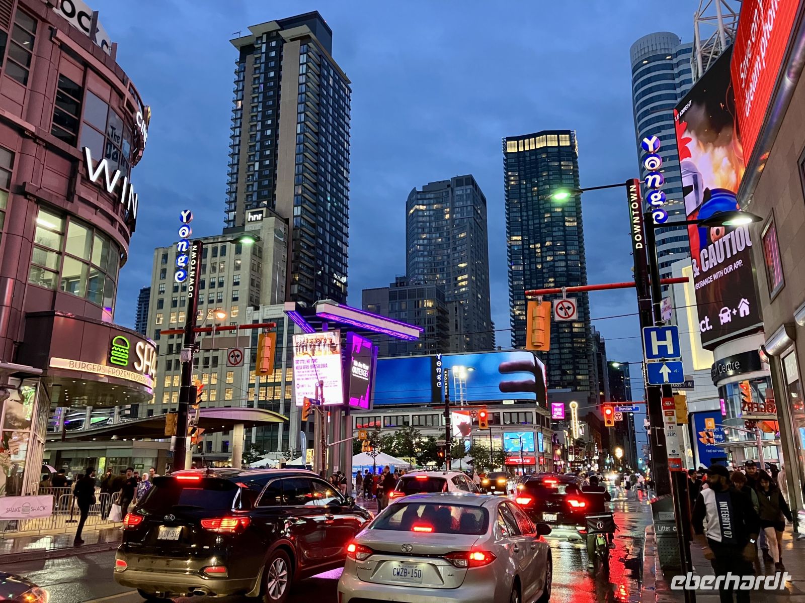 Die Aussicht heute in der Frueh auf die Hochhaeuser Torontos bei Sonnenaufgang vom Zimmer aus ist fantastisch. Schaut die Photogalerie an. Heute steigt Margarith zu uns in den Bus und zeigt uns IHR Toronto. Ploetzlich wird Toronto eine schoene, tolle, lebhafte und interessante Stadt. Sie zeigt uns vorerst das “brave” Viertel. Ja wir steigen auch aus und schauen uns die schoenen Haeuser der 30er Jahre an. Sie erzaehlt uns wie es auch noch in den 60er Jahren war, als sie als junge Schweizerin in diese Stadt zog. Diese Gegend von Bloor und Yorkeville ist sehr lebenswert wir wuerden auch gleich hierher ziehen. So viele Baeume sogar ein Kardinal singt auf einem Ast. Auf unserer Stadtrundfahrt kommen wir nun an riesen Wolkenkratzer vorbei. Ja, sagt Margarith, Verdichtung muss sein und kann auch sehr schoen ausschauen wie hier in Toronto. Ach ja, da sind sie ja auch, alle Luxusgeschaefte sind hier vereint. Na ja, wenn eine kleine Wohnung 1 Million kostet, gibt es auch dementsprechende Laeden. Nun zeigt uns Margarith auch das alte und neue Rathaus, die Universitaetsgegend mit all den schoenen Bauten aus dem fruehen 19. Jhdt. Die Kombination von Alt- und Neubauten ist faszinierend. Die Villen-Gegend mit dem Schloss Casa Loma ist reizend, wir koennten gleich ins “Gartenhaeuschen” einziehen. Der Garten soll anscheinend beheizbar sein ! Nun fahren wir durch Chinatown und gehen dann zu Fuss durch Kensington Town. Kensington ist echt hip, wir denken wir waeren in der Karibik oder sonst wo auf einer suedlichen Insel. Wir fahren auch beim Museum von Franz Gehri vorbei und sehen danach das neue tolle Rathaus von Toronto. Ehe wir zum CN Tower kommen fahren wir noch am Hafen entlang und vorbei dem Bahnhof . Als Abschluss dieser schoenen Stadtrundfahrt fahren wir nun auf den CN Tower hinauf. Der Blick von da oben bleibt uns auf Ewigkeit erhalten. Heute Nachmittag ist Programm-los. Die Wolken zeigen sich etwas dichter und wir haben alle erst mal Durst und auch Hunger. Ich wollte mit der Gruppe auf Toronto Island fahren aber leider schuettet es nun wie aus Kuebeln und das geplante Nachmittagsprogramm muss gestrichen werden. Wir entdecken anstatt dessen die unterirdische Stadt, gehen da ein wenig entlang aber entscheiden uns dann doch fuer Helligkeit auch wenn wir von Regen uebergossen werden. Nun gehen einige noch schwimmen, andere ruhen sich aus andere wieder gehen in die Markthallte und bestaunen dort die riesen Tomahawk Steaks und so klingt dieser Tag dann doch bei Sonnenschein aus. Der Tag war sehr interessant und abwechslungsreich, die Betten superb und die Traeume persoenlich.
