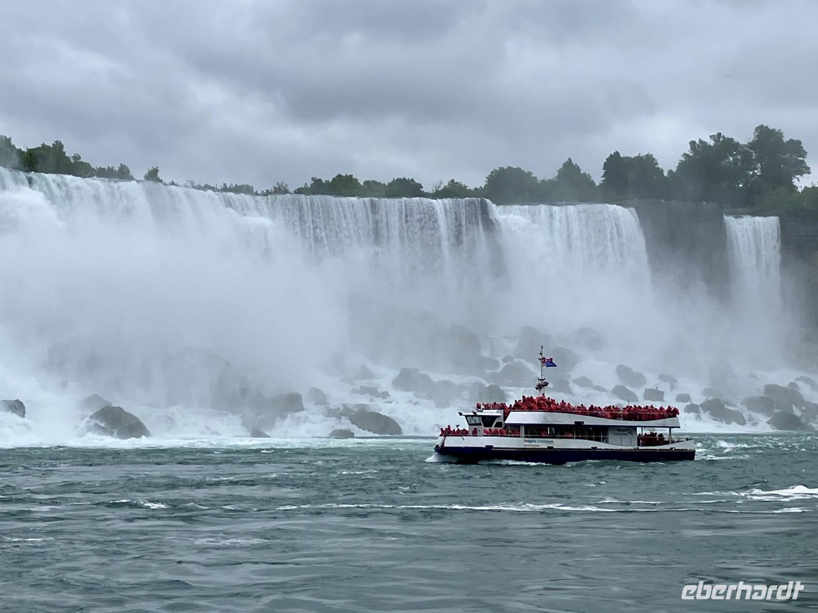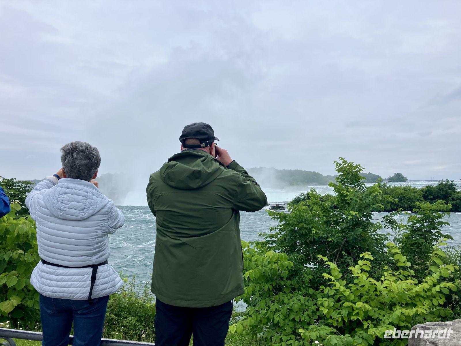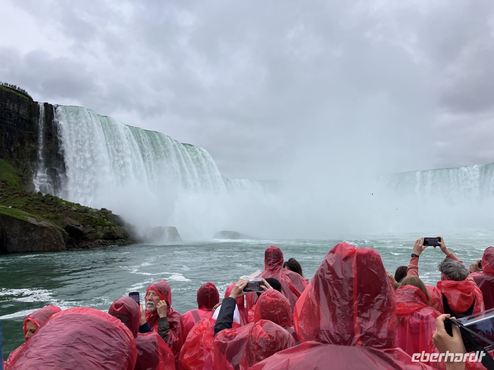 Nun gehts angeheitert weiter… Ein Nickerchen von einer halben Stunde bringt uns nun nach Niagara Falls gleich zur Schiffsanlegestelle. Vorerst wollen wir die Sicht auf die Wasserfaelle, ein UNESCO Weltnaturerbe, einfach geniessen. Heute sind nicht viele Leute hier und so organisiert Elisabeth gleich die Tickets um auf die Bootstour zu gehen. Moralisch sind wir ja bereits vorbereitet, was da hier nun mit uns geschehen wird. Aber dies Ereigniss muss man selbst erleben. Vorerst werden wir mit roten Ponchos versehen, stuelpen die ueber und stehen nun bereit. Jetzt koennen wir in das grosse Schiff einsteigen. Oben auf dem Aussendeck stehen wir nun erwartungsvoll und fahren los. Da sind sie bereits, die amerikanischen Faelle, ganz toll stuerzt hier das Wasser runter und faellt auf vorliegende Felsen, ein bisschen sind wir bereits angesprenkelt worden aber ploetzlich gehts los. Der kanadische Wasserfall, welcher eigentlich bloss 45 Meter hoch und hufeisen-foermig ist hat eine enorme Kraft und fuehrt unmengen Wasser. Die Gischt ist so stark, dass wir bloss noch lachen koennen. Alles ist patsch-nass. Das Boot geht so nahe ran, man sieht kaum mehr was und wenn man auch was saehe, muesste man die Augen schliessen, da die Dusche allzu stark eingestellt ist. Nach diesem lustigen sowie beeindruckenden Erlebniss steigen wir wieder aus und entledigen uns der Ponchos. Es geht ein kleiner Wind, und so trocknen unsere Hosenbeine und Haare auch gleich wieder. Toll war das und es wird uns immer in Erinnerung bleiben. Nun haben sich einige unter uns fuer einen Helikopterflug ueber die beiden Wasserfaelle entschlossen, aber leider ist die Wolkendecke noch zu niedrig. Also gibts mal Pause um etwas zu essen, ein Bierchen oder einen Kaffee zu trinken.