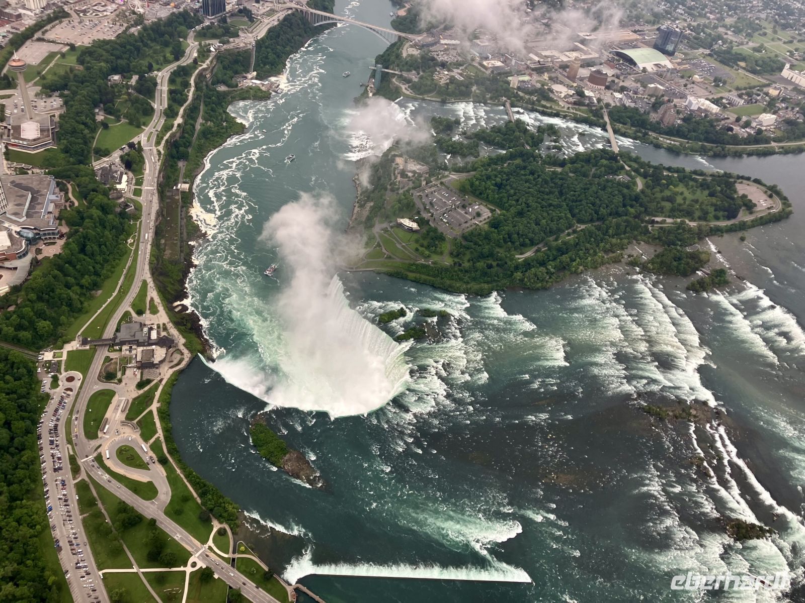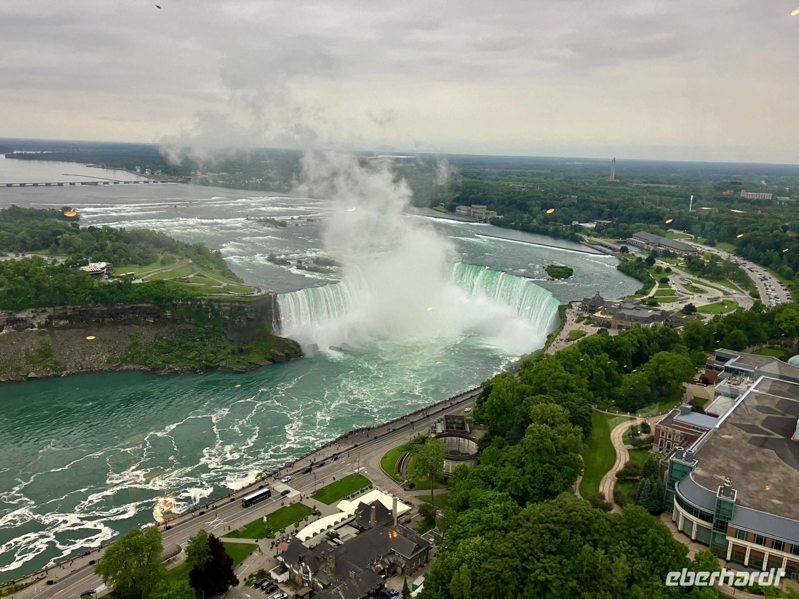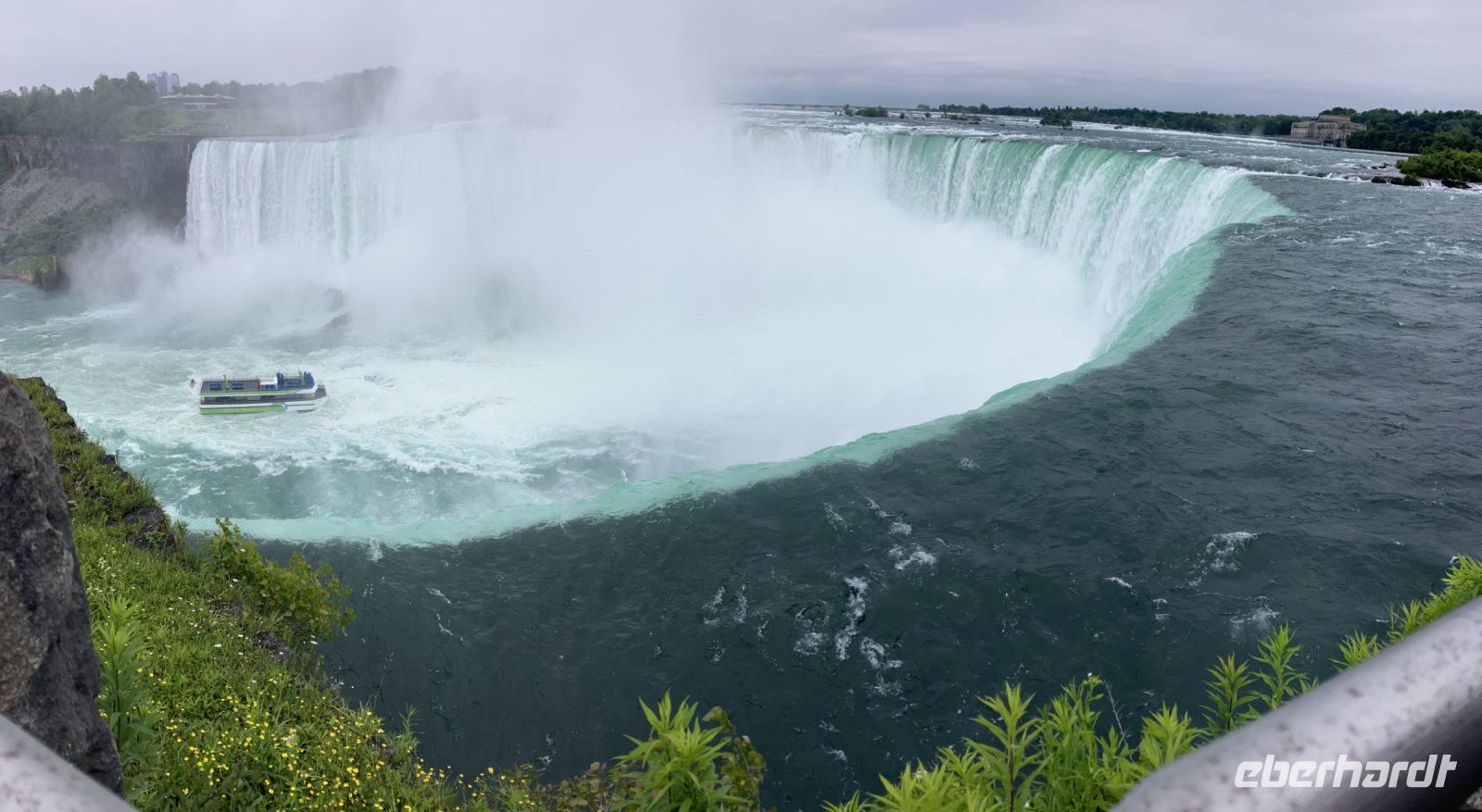 Nun gehts angeheitert weiter… Ein Nickerchen von einer halben Stunde bringt uns nun nach Niagara Falls gleich zur Schiffsanlegestelle. Vorerst wollen wir die Sicht auf die Wasserfaelle, ein UNESCO Weltnaturerbe, einfach geniessen. Heute sind nicht viele Leute hier und so organisiert Elisabeth gleich die Tickets um auf die Bootstour zu gehen. Moralisch sind wir ja bereits vorbereitet, was da hier nun mit uns geschehen wird. Aber dies Ereigniss muss man selbst erleben. Vorerst werden wir mit roten Ponchos versehen, stuelpen die ueber und stehen nun bereit. Jetzt koennen wir in das grosse Schiff einsteigen. Oben auf dem Aussendeck stehen wir nun erwartungsvoll und fahren los. Da sind sie bereits, die amerikanischen Faelle, ganz toll stuerzt hier das Wasser runter und faellt auf vorliegende Felsen, ein bisschen sind wir bereits angesprenkelt worden aber ploetzlich gehts los. Der kanadische Wasserfall, welcher eigentlich bloss 45 Meter hoch und hufeisen-foermig ist hat eine enorme Kraft und fuehrt unmengen Wasser. Die Gischt ist so stark, dass wir bloss noch lachen koennen. Alles ist patsch-nass. Das Boot geht so nahe ran, man sieht kaum mehr was und wenn man auch was saehe, muesste man die Augen schliessen, da die Dusche allzu stark eingestellt ist. Nach diesem lustigen sowie beeindruckenden Erlebniss steigen wir wieder aus und entledigen uns der Ponchos. Es geht ein kleiner Wind, und so trocknen unsere Hosenbeine und Haare auch gleich wieder. Toll war das und es wird uns immer in Erinnerung bleiben. Nun haben sich einige unter uns fuer einen Helikopterflug ueber die beiden Wasserfaelle entschlossen, aber leider ist die Wolkendecke noch zu niedrig. Also gibts mal Pause um etwas zu essen, ein Bierchen oder einen Kaffee zu trinken.