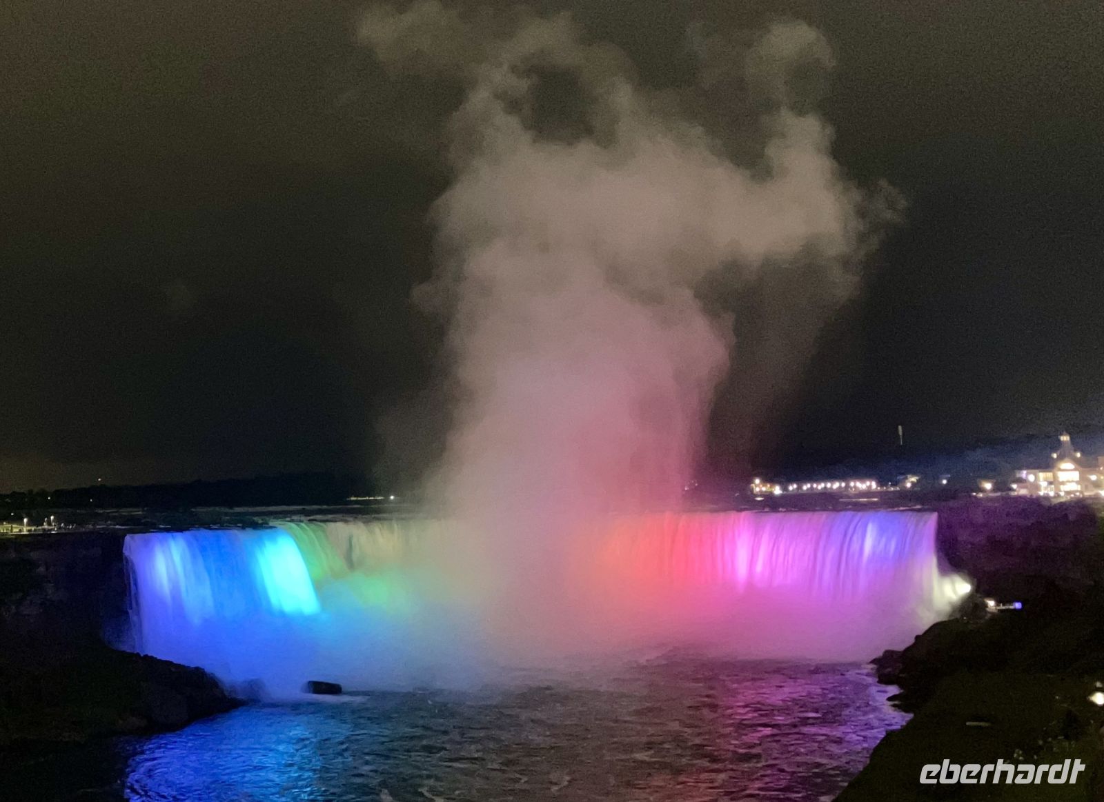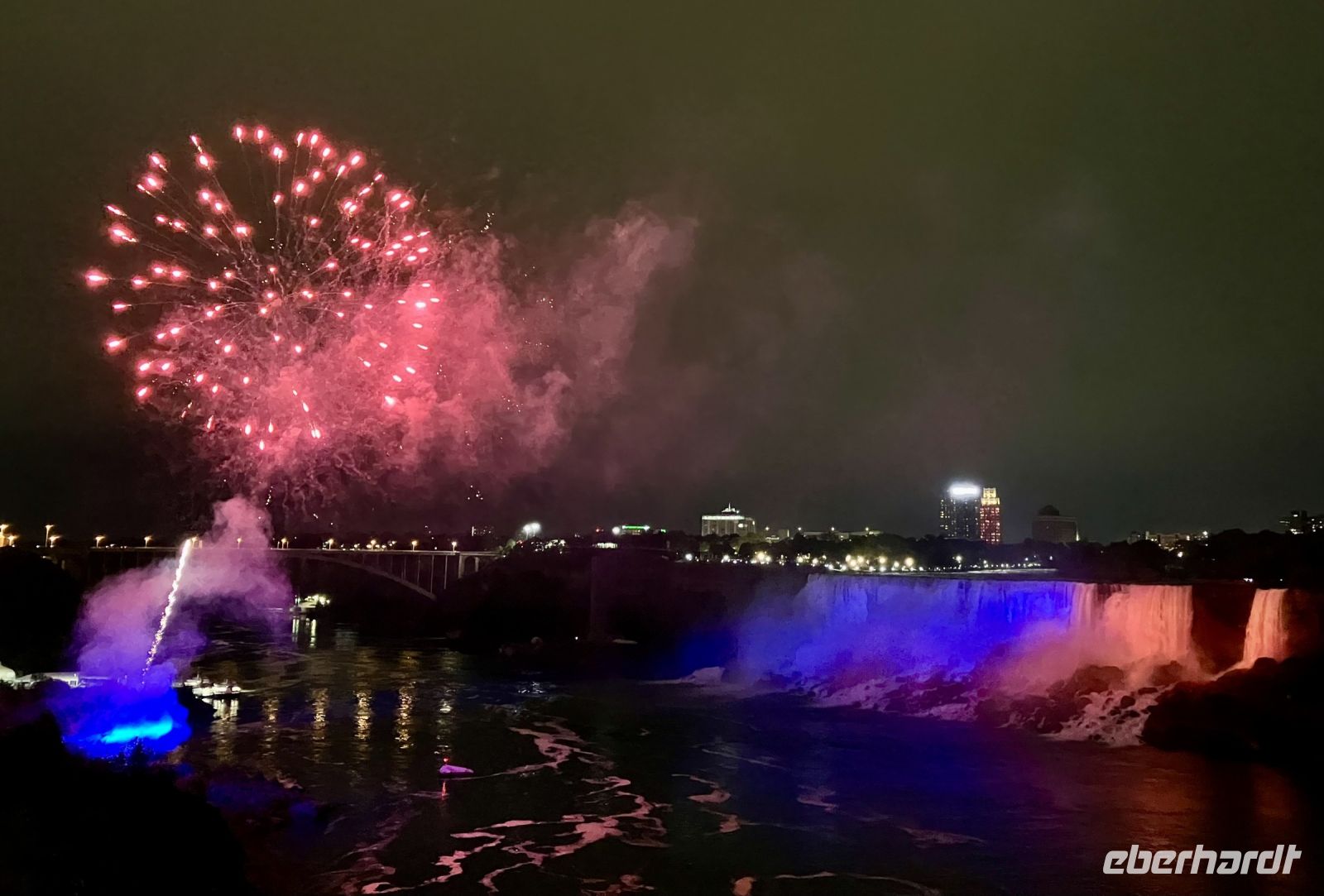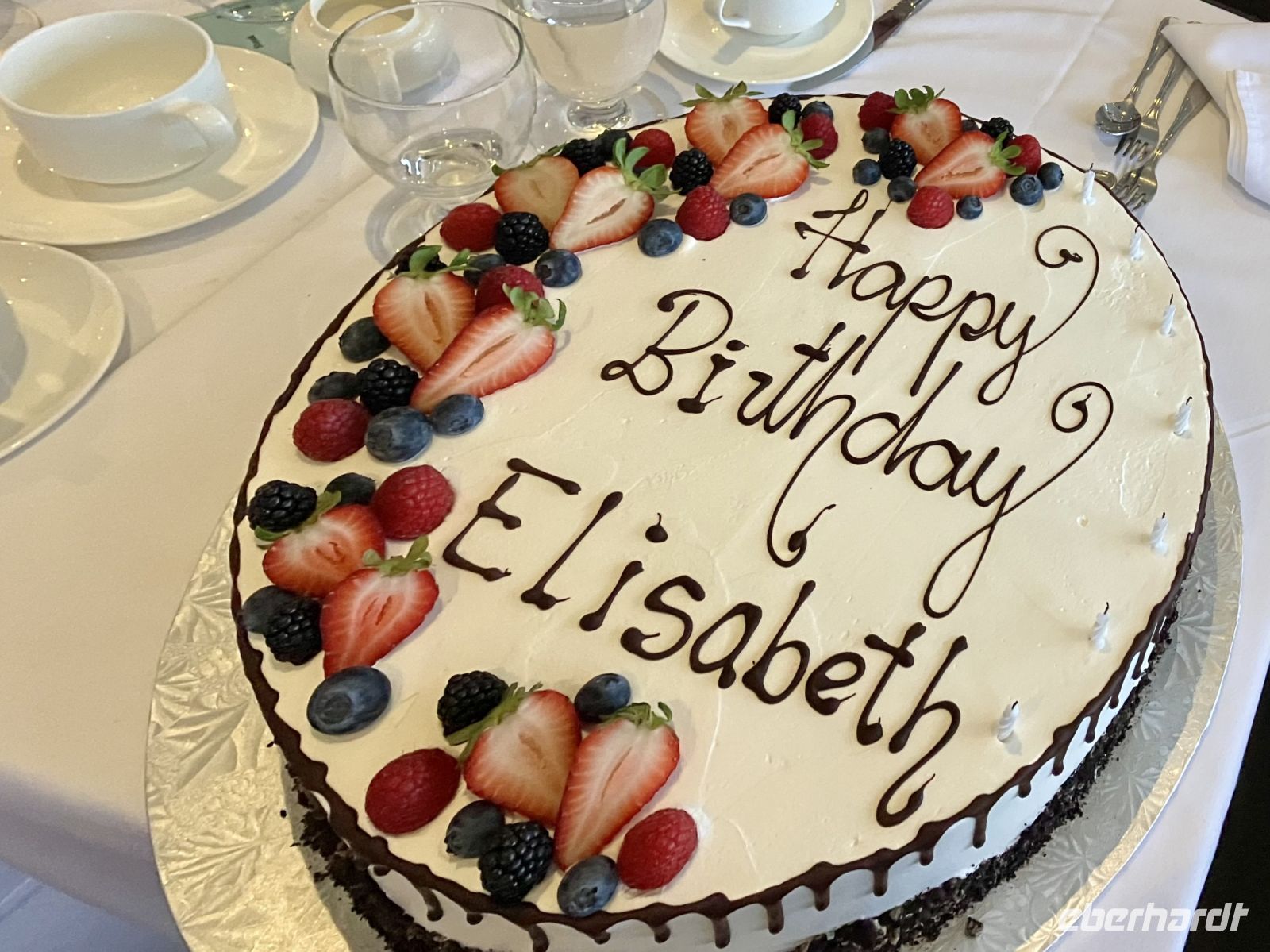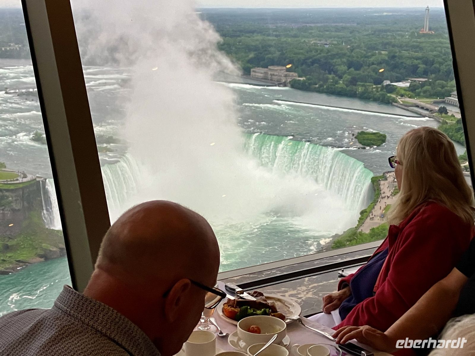 Um 16:30 erfaehrt Elisabeth, dass wir nun doch fliegen koennen. Also checken wir jene ins Hotel ein, die nicht fliegen wollen (danke Annette) und fahren flugs zum Helipad mit den anderen. Nach einer kurzen Wartezeit ist es soweit und wir koennen in die beiden Heli einsteigen und die ersehnten Niagara Faelle von oben anschauen. Ach wie wunderbar, was fuer ein Erlebniss. Die Faelle nun von oben zu sehen ist einfach fantastisch. Unsere Helis kreisen problemlos ueber sie und ausser schauen und staunen, horchen wir auch dem deutschen Kommentar zu. Der Flug ist nicht lange aber sehr intensif. Am Abend sind wir heute auf den Aussichtsturm geladen. Das feudale Abendessen in dem Drehrestaurant ist einmalig und das Essen schmeckt vorzueglich. Auf einmal kommt eine Serviererin mit der wohl groessten Torte daher, erweckt grosses Aufsehen im ganzen Restaurant und…..stellt sie vor Elisabeth auf den Tisch. So eine wunderschoene grosse Torte. Wir staunen, stehen auf, lachen und freuen uns riesig ueber dies Dessert. Die kleinen Teller reichen nicht um ein Stueck Kuchen, der ja 20 cm hoch ist, zu tragen, nein, nein, ein grosser Ess-Teller muss fuer jedermann gebracht werden. Schaut Euch die Photogallerie an, wie gluecklich E ist. Unterdessen ist es Nacht geworden, die Wasserfaelle werden in allen Farben beleuchtet und ein schoenes Feuerwerk schliesst diesen herrlichen Tag ab. In der Lobby des Hotels checken wir uns nun noch fuer den morgigen Flug ein und dann gehts schnell haia.