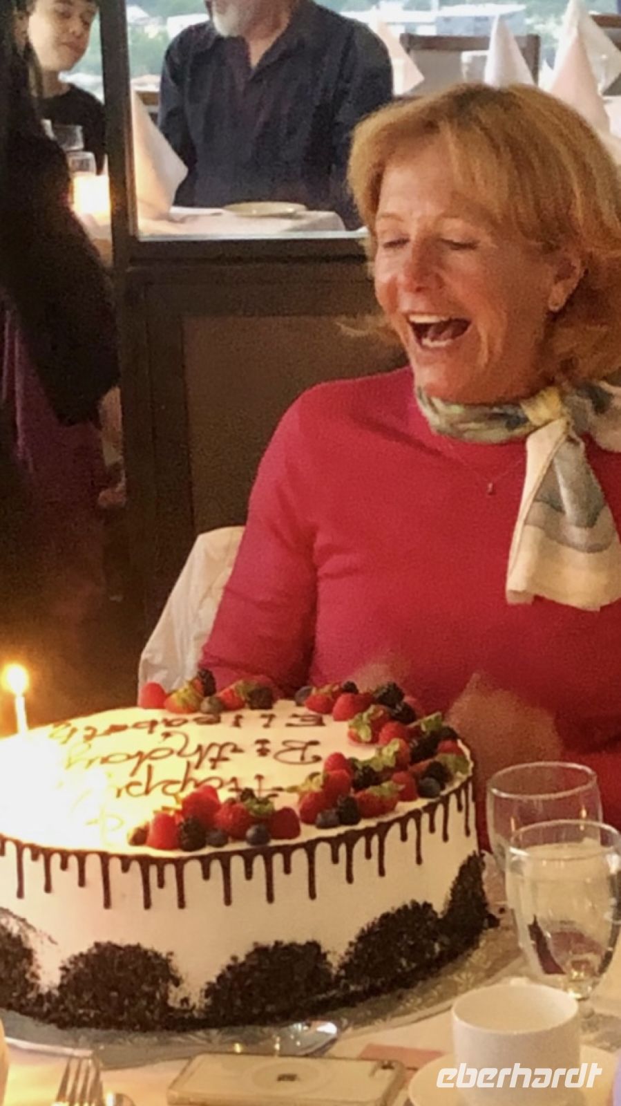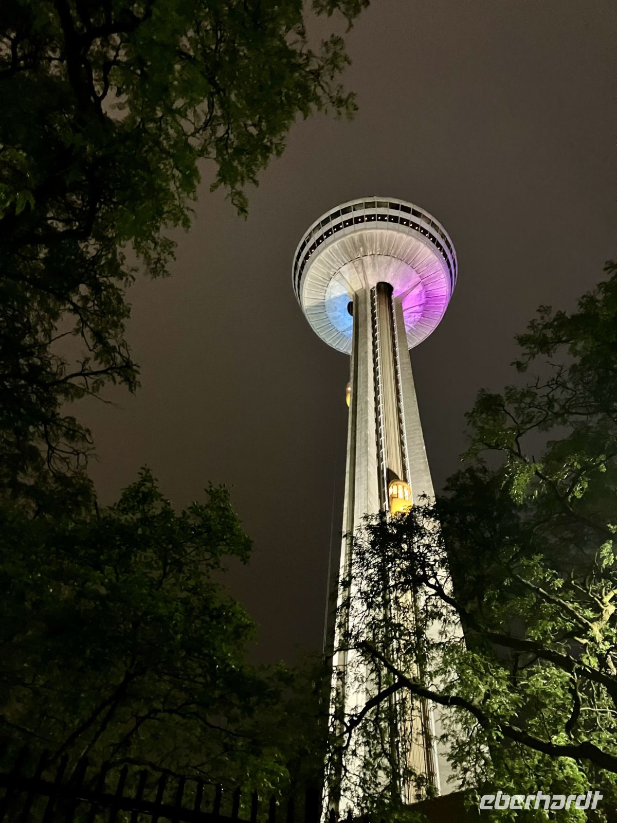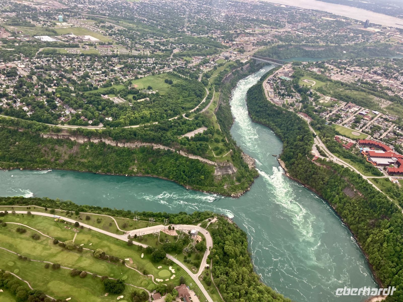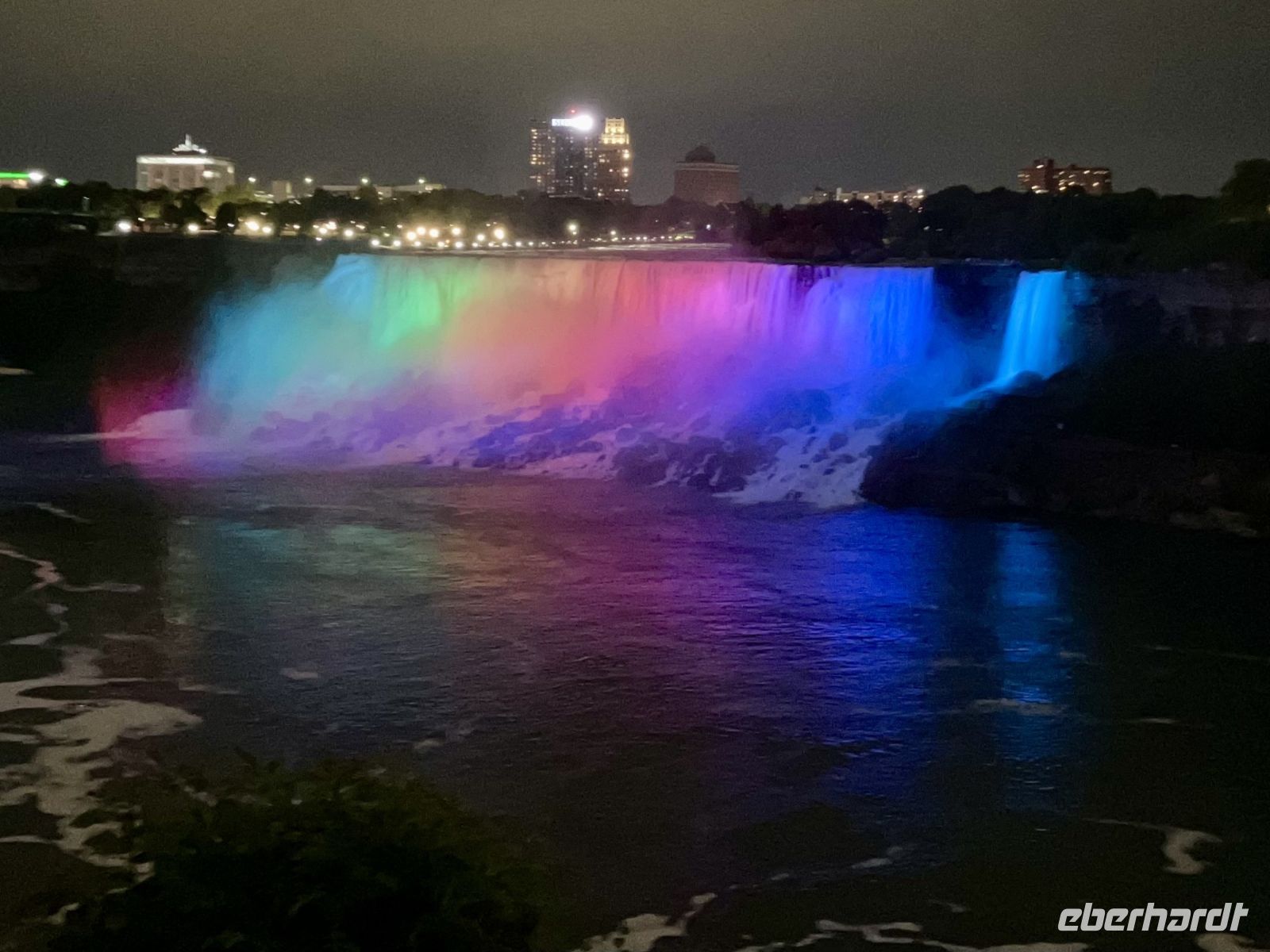 Um 16:30 erfaehrt Elisabeth, dass wir nun doch fliegen koennen. Also checken wir jene ins Hotel ein, die nicht fliegen wollen (danke Annette) und fahren flugs zum Helipad mit den anderen. Nach einer kurzen Wartezeit ist es soweit und wir koennen in die beiden Heli einsteigen und die ersehnten Niagara Faelle von oben anschauen. Ach wie wunderbar, was fuer ein Erlebniss. Die Faelle nun von oben zu sehen ist einfach fantastisch. Unsere Helis kreisen problemlos ueber sie und ausser schauen und staunen, horchen wir auch dem deutschen Kommentar zu. Der Flug ist nicht lange aber sehr intensif. Am Abend sind wir heute auf den Aussichtsturm geladen. Das feudale Abendessen in dem Drehrestaurant ist einmalig und das Essen schmeckt vorzueglich. Auf einmal kommt eine Serviererin mit der wohl groessten Torte daher, erweckt grosses Aufsehen im ganzen Restaurant und…..stellt sie vor Elisabeth auf den Tisch. So eine wunderschoene grosse Torte. Wir staunen, stehen auf, lachen und freuen uns riesig ueber dies Dessert. Die kleinen Teller reichen nicht um ein Stueck Kuchen, der ja 20 cm hoch ist, zu tragen, nein, nein, ein grosser Ess-Teller muss fuer jedermann gebracht werden. Schaut Euch die Photogallerie an, wie gluecklich E ist. Unterdessen ist es Nacht geworden, die Wasserfaelle werden in allen Farben beleuchtet und ein schoenes Feuerwerk schliesst diesen herrlichen Tag ab. In der Lobby des Hotels checken wir uns nun noch fuer den morgigen Flug ein und dann gehts schnell haia.