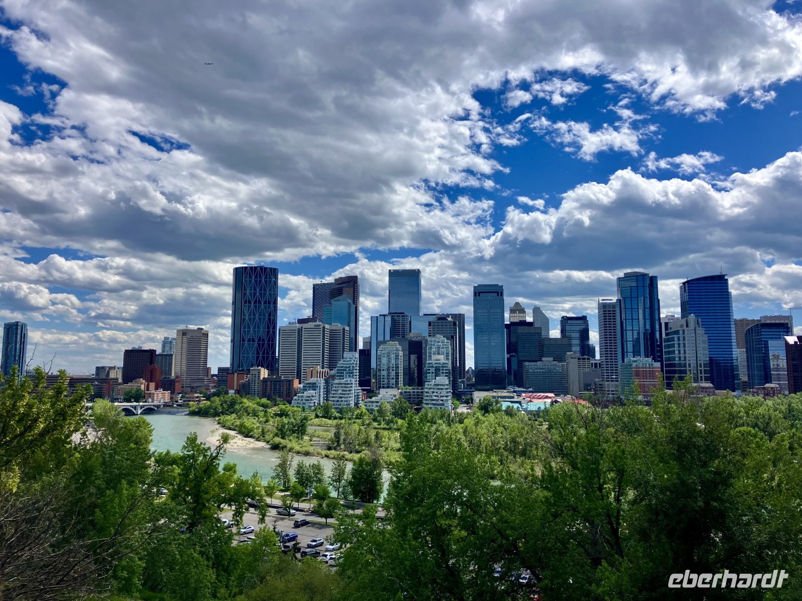 Heute gehts ein bisschen frueher los und die Fruehstuecks-Boxen stehen bereit. Halb verschlafen haendigen wir brav die kleinen Voucher aus, damit auch jeder so eine Box erhaelt. Die Fahrt zum Flughafen Pearson in Toronto dauert wie immer 2 Stunden, da es doch immer Stau gibt. Das einchecken ist easy und bald sitzen wir 4 Stunden gemuetlich ausruhend in dem Flieger der Air Canada nach Calgary. Alles verlaeuft planmaessig, wir fliegen ueber die 3 grossen Binnenseen und dann ueber die Praerie die mit tausenden von Seen und Fluessen bestueckt ist. Es ist teilweise wolkig aber ueber Winnipeg, Regina und Saskatoon sieht man die grossen Kornfelder und die geraden Strassen. Man sagt, dass man hier dem fortgelaufenen Hund drei Tage lang zuschauen kann wie er rennt ! Wir koennen das nun bewahrheiten. Puenktlich kommen wir am fruehen Vormittag in Calgary an. Es ist aber bloss 2 Stunden spaeter als bei Abflug, da wir 2 Stunden Zeitverschiebung verloren haben. Unser neuer Chauffeur heisst Genesis und er fuehrt uns vorerst auf eine herrliche Terrasse um ein schoenes Bild von Calgary zu ergattern. Das Wetter ist super, schoen warm mit Woelkchen am blauen Himmel. Wir sehen auch den Saddle Dome, das Stadion wo das grosse Fest “die Stampede” jaehrlich stattfindet. Es ist das groesste Rodeo im Westen Kanadas und da wird Bronco wild. Wir machen nun bloss noch einen Halt beim Olympiazentrum ausserhalb Calgarys um uns ein Bild zu machen wo im 88 unsere Katarina Witt ihre Eislaufschuhe hat vergolden lassen, wo die Jamaikaner Bob gefahren sind und wo Eddy the Eagel fliegen gelernt hat. In der Ferne sehen wir bereits die Rocky Mountains, also nichts wie hin, denn die Berge rufen. Ploetzlich wird aus den einzelnen kleinen Woelkchen eine dicke Wolkendecke und es beginnt zu schuetten wie nur geht. Berge sind alle weg. Nach 20 Minuten sind die Berge wieder da und der Himmel zeigt auch wieder blaue Farbe zwischen den Wolken. Da wir frueher gelandet sind, wollen wir auch gleich Banff kennenlernen. So besuchen wir das tolle gediegene Banff Springs Hotel, den Bow Wasserfall, Surprise Corner mit der hoelzernen Terrasse mit Sicht auf das Banff Springs Hotel und Sulphur Mountain ehe wir bei den Hoodoos einen kleinen Spaziergang unternehmen, um diese lustigen Steinformationen zu betrachten. Jetzt gehts aber zum Hotel. Auch die Aspen Lodge ist wieder sehr zentral in Banff gelegen, mit herrlicher Sicht auf hohe, breite, steile Berge. Das Abendessen ist ganz in der Naehe und der Steak schmeckt vorzueglich. Nach ein paar Bierchen und/oder Glaeschen Wein sind wir nun echt muede, adieu meine Freunde, das Bett ruft, sorry bin schon weg.