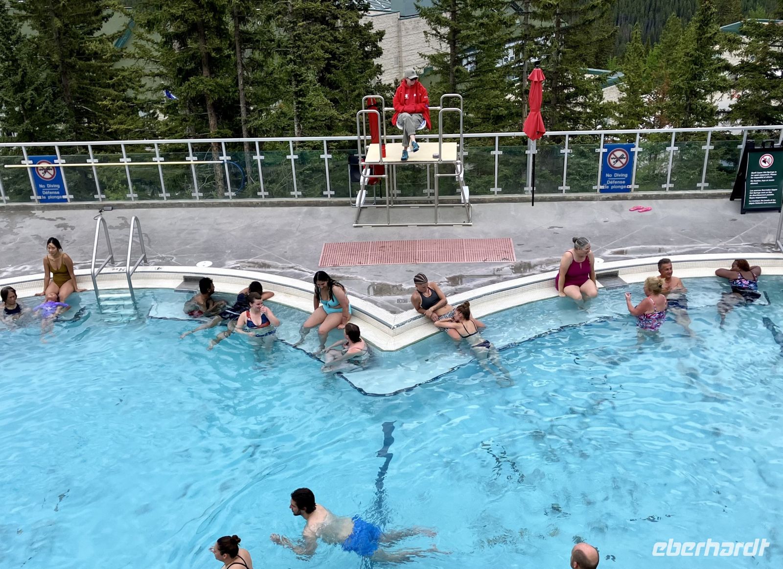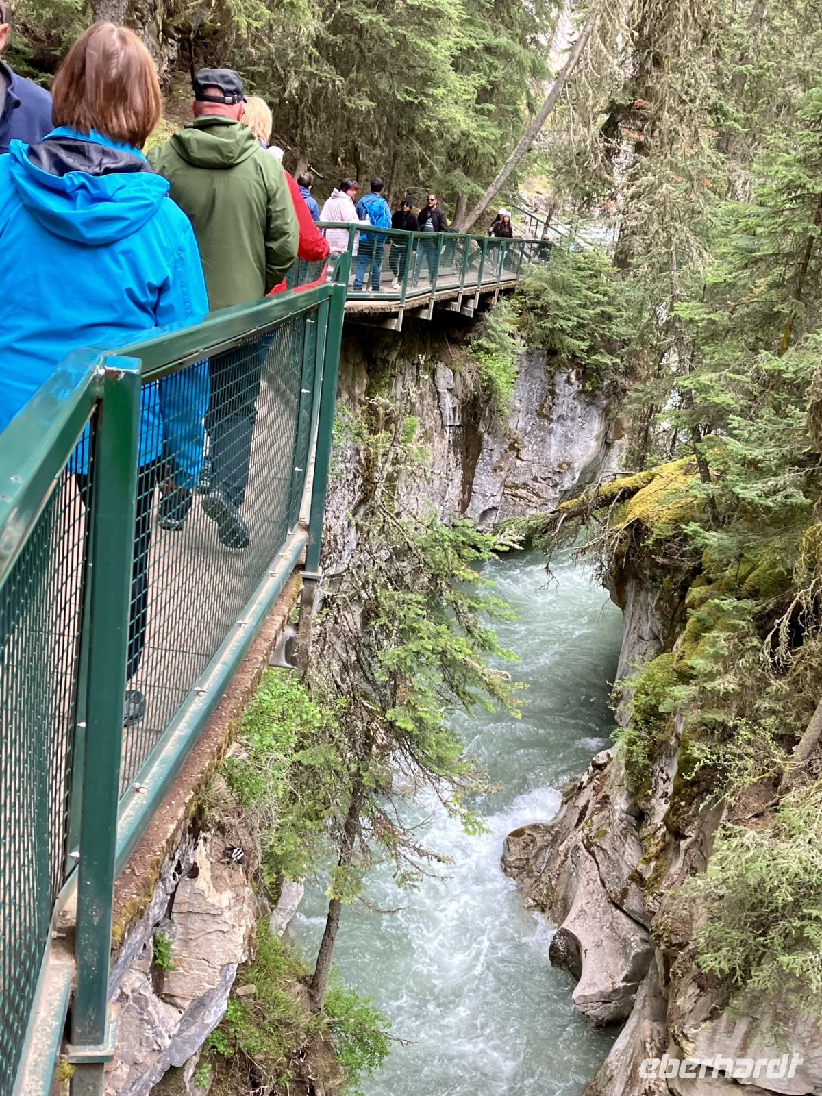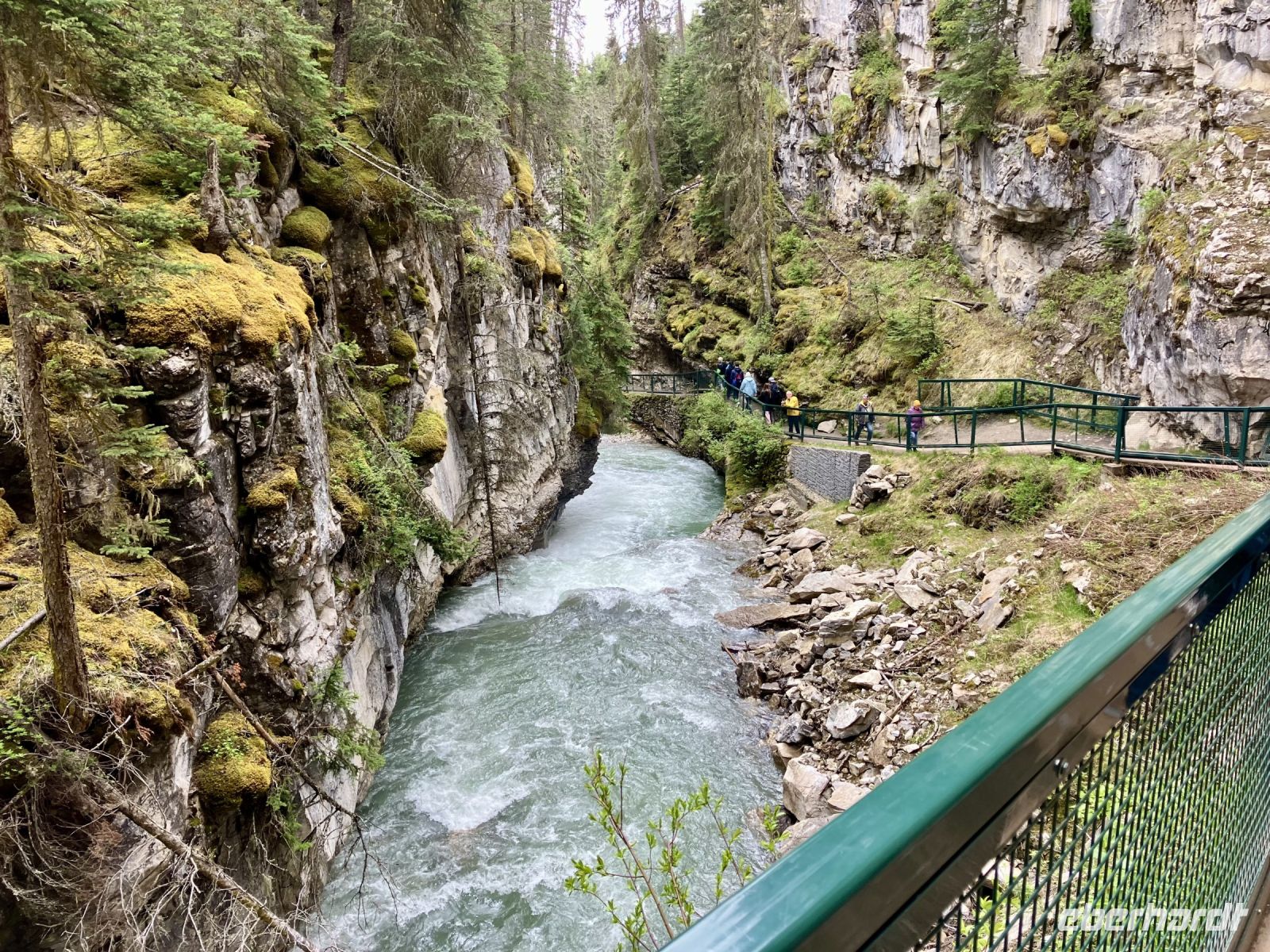 Dem Johnston Canyon entlang spazieren wir und staunen ueber die wunderschoene Schlucht und den tollen Weg der teilweise als Steg an den Felshaengen haftet und zeitweise dem Fluss entlang fuehrt. So wandern wir bis zur 1. Bruecke und sehen einen tollen tosenden Wasserfall. Wie in einem wild gewordenen Jacuzzi schaut es hier aus. Energiegeladen, gehts zurueck zum Bus und damit nach Banff. Einige unter uns wollen nun Banff-Freizeit geniessen und andere bevorzugen einen Abstecher zu den Heissen Quellen. 40 Grad ist das Schwefelwasser heute, nach 20 Minuten sind wir gargekocht und sicher noch gesuender als vorher. Genesis faehrt uns wieder zurueck nach Banff.