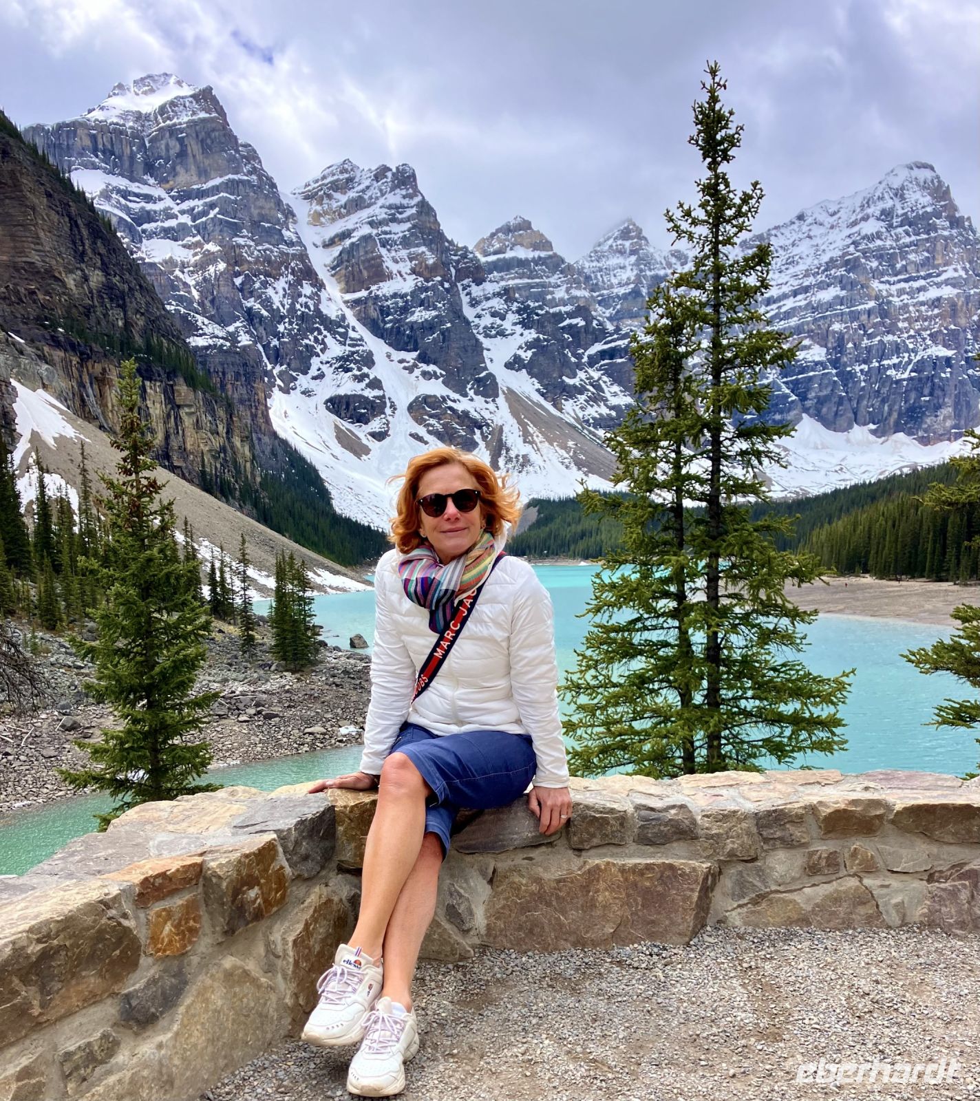 Am Emerald Lake machen wir nun einen Spaziergang dem Ufer entlang und knipsen viele Photos vom smaragdgruenen See mit seinen leicht verzuckerten Bergen. Richtig idyllisch schaut es hier aus also bleiben wir auch eine Weile ehe wir noch ein Photo von der steinernen Bruecke schiessen und danach mit dem Bus wieder Richtung Lake Louise fahren. Gleich nach dem klitze kleinen Dorf Lake Louise biegen wir links ab….oder war das nun doch rechts? Lake Moraine Road heisst die Strasse.